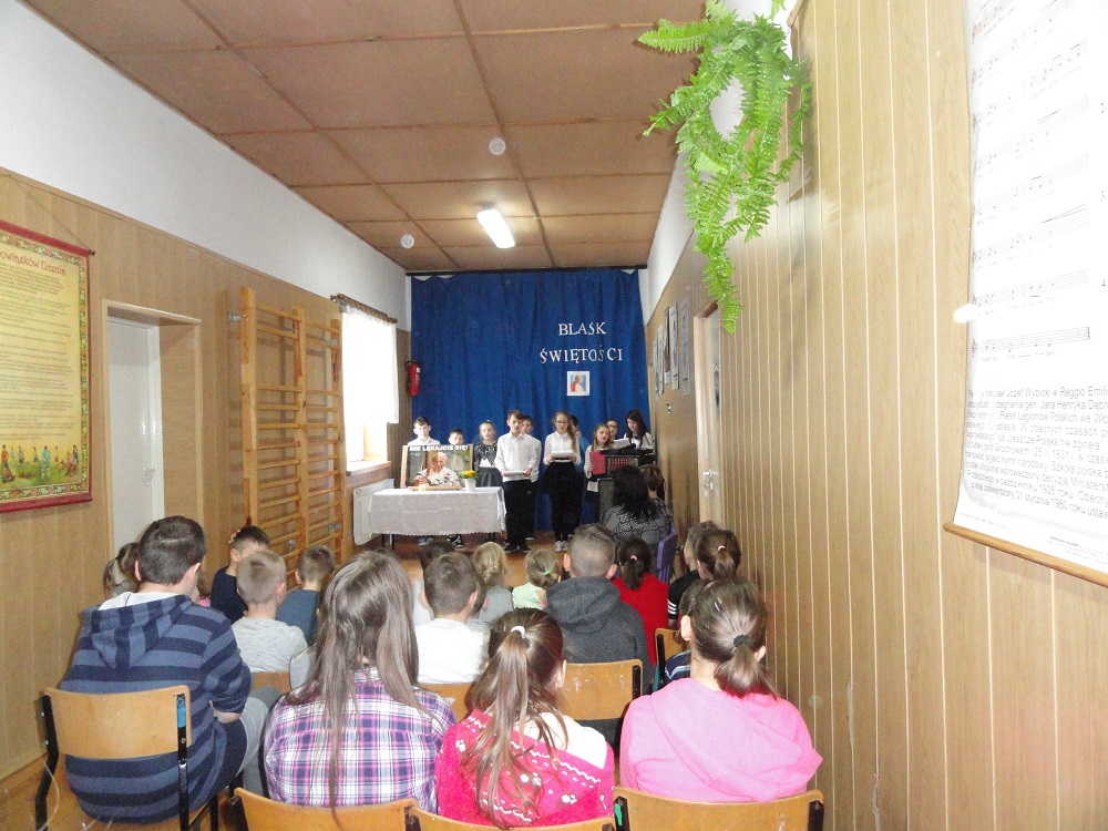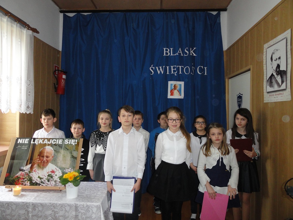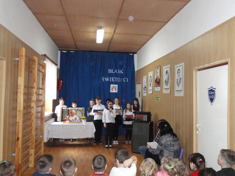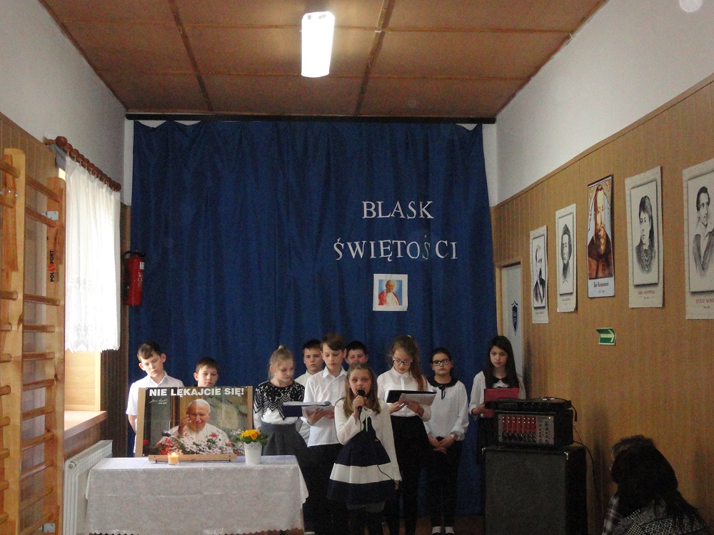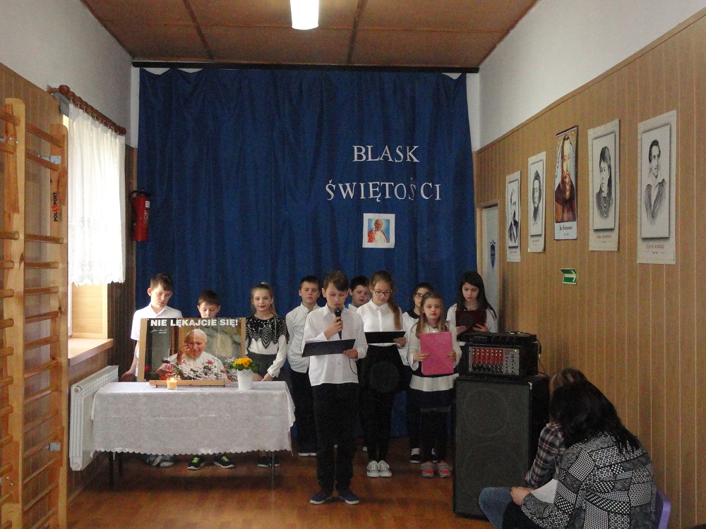 „Blask Świętości.” – pod takim hasłem 30 marca 2017 r. w Szkole Podstawowej w Gościnnej odbył się apel poświęcony rocznicy śmierci Ojca Świętego Jana Pawła II. Uczniowie kl. IV-VI pod kierunkiem P. Moniki Szulc przybliżyli wszystkim zebranym postać Jana Pawła II, recytując wiersze i śpiewając pieśni, które bardzo lubił sam Ojciec Święty. Uczniowie wyrazili podziw i ogromną wdzięczność Papieżowi za Jego posługę miłości Kościołowi i rodzinie ludzkiej, za to, że niósł orędzie wiary i nadziei współczesnemu światu nękanemu przez wojny i niesprawiedliwość. A także za to, że brał w obronę ubogich, cierpiących, prześladowanych i chorych.