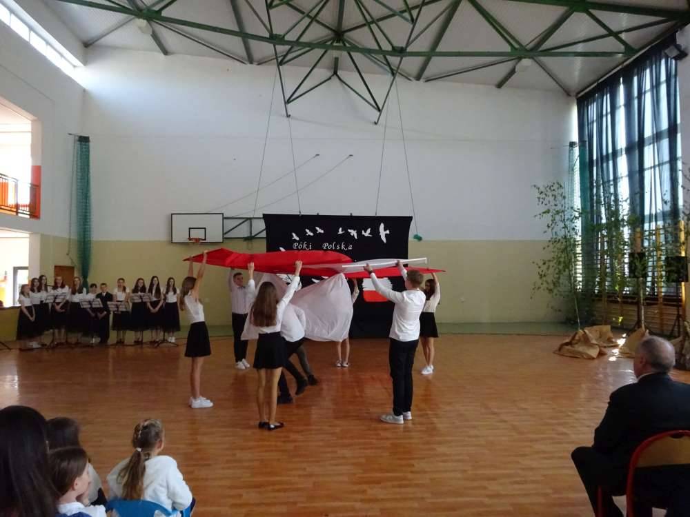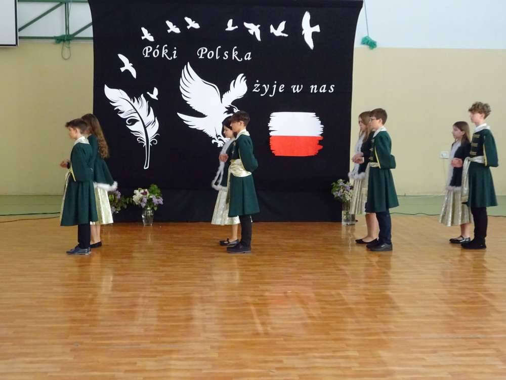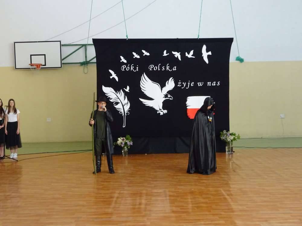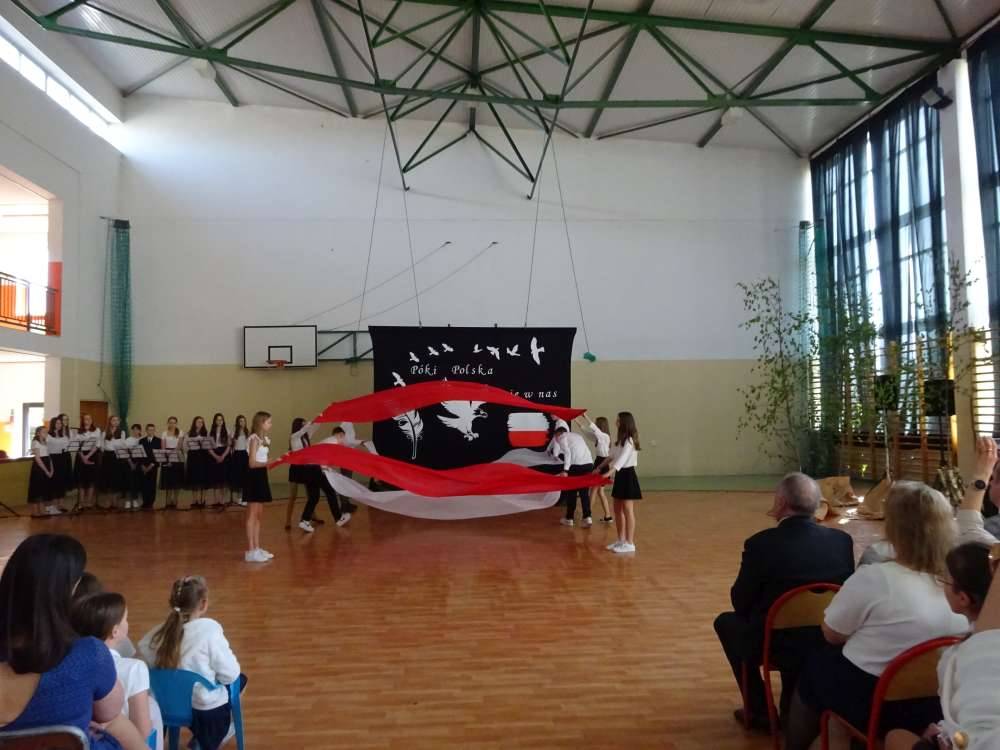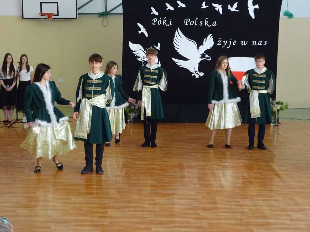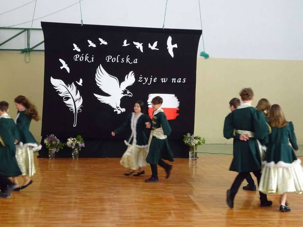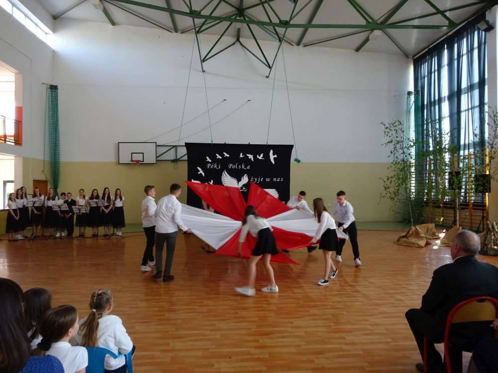 Montaż słowno – muzyczny w wykonaniu uczniów klas IV – VIII był hołdem dla twórców konstytucji oraz przypomnieniem faktów historycznych związanych z tym wydarzeniem. Konstytucja 3 Maja z 1791r. była to druga na świecie, a pierwsza w Europie ustawa zasadnicza. Polscy patrioci, dostrzegając widmo upadku Rzeczypospolitej, podjęli próbę ratowania i reformowania ojczyzny. Niestety, obowiązywała ona tylko kilka miesięcy i nie uchroniła Polski przed jej ostatecznym upadkiem. Ale występy młodych artystów to nie tylko przypomnienie faktów historycznych. Przekazali nam oni bardzo ważne przesłanie: patriotyzmu powinniśmy się uczyć każdego dnia i musimy żyć tak, by pamiętać o przeszłości i jednocześnie dbać o to, by nasza ojczyzna rozwijała się w duchu wolności, odpowiedzialności i wzajemnego szacunku. Piękne recytacje skłaniały do zastanowienia się, czym dla nas są takie pojęcia jak: wolność, naród, ojczyzna. Uroczysty nastrój budowały również pieśni patriotyczne w wykonaniu chóru szkolnego. Niezwykłych wzruszeń dostarczył taniec z biało – czerwonymi szarfami oraz mazur, podczas którego mogliśmy podziwiać polskie stroje narodowe.