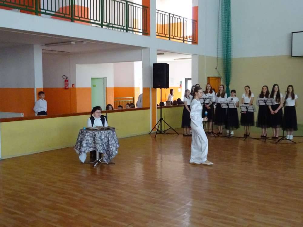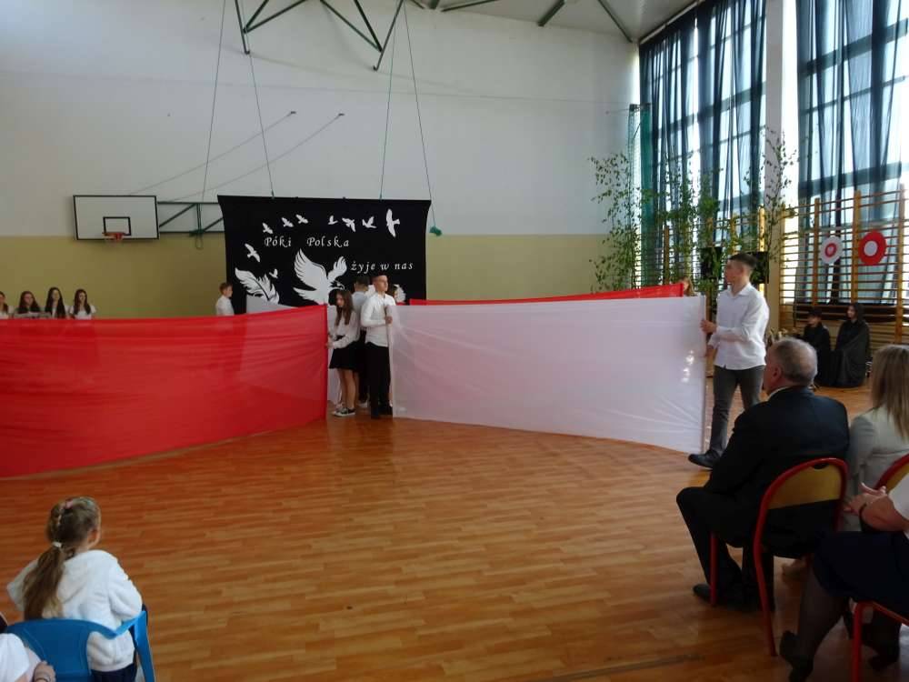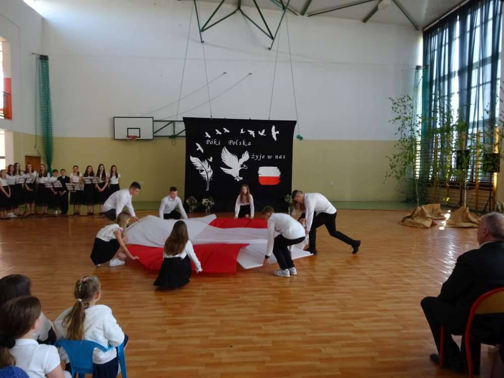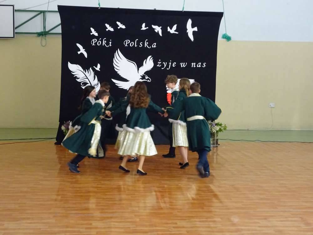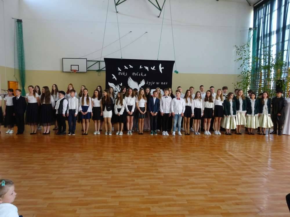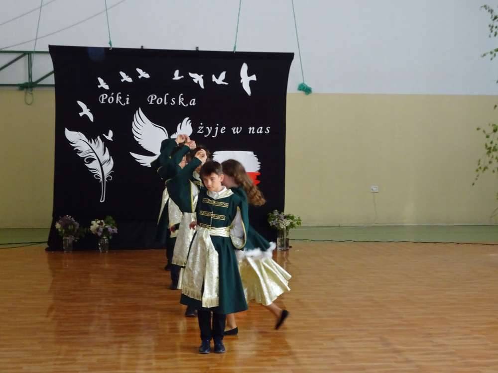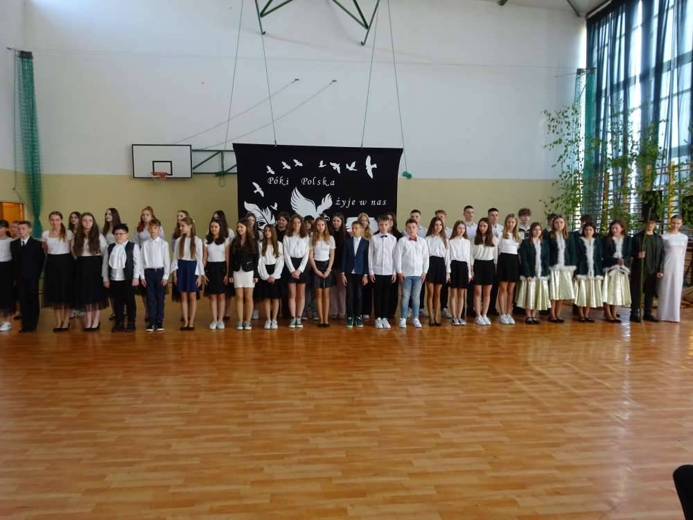 Montaż słowno – muzyczny w wykonaniu uczniów klas IV – VIII był hołdem dla twórców konstytucji oraz przypomnieniem faktów historycznych związanych z tym wydarzeniem. Konstytucja 3 Maja z 1791r. była to druga na świecie, a pierwsza w Europie ustawa zasadnicza. Polscy patrioci, dostrzegając widmo upadku Rzeczypospolitej, podjęli próbę ratowania i reformowania ojczyzny. Niestety, obowiązywała ona tylko kilka miesięcy i nie uchroniła Polski przed jej ostatecznym upadkiem. Ale występy młodych artystów to nie tylko przypomnienie faktów historycznych. Przekazali nam oni bardzo ważne przesłanie: patriotyzmu powinniśmy się uczyć każdego dnia i musimy żyć tak, by pamiętać o przeszłości i jednocześnie dbać o to, by nasza ojczyzna rozwijała się w duchu wolności, odpowiedzialności i wzajemnego szacunku. Piękne recytacje skłaniały do zastanowienia się, czym dla nas są takie pojęcia jak: wolność, naród, ojczyzna. Uroczysty nastrój budowały również pieśni patriotyczne w wykonaniu chóru szkolnego. Niezwykłych wzruszeń dostarczył taniec z biało – czerwonymi szarfami oraz mazur, podczas którego mogliśmy podziwiać polskie stroje narodowe.