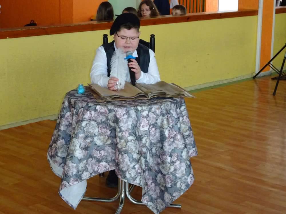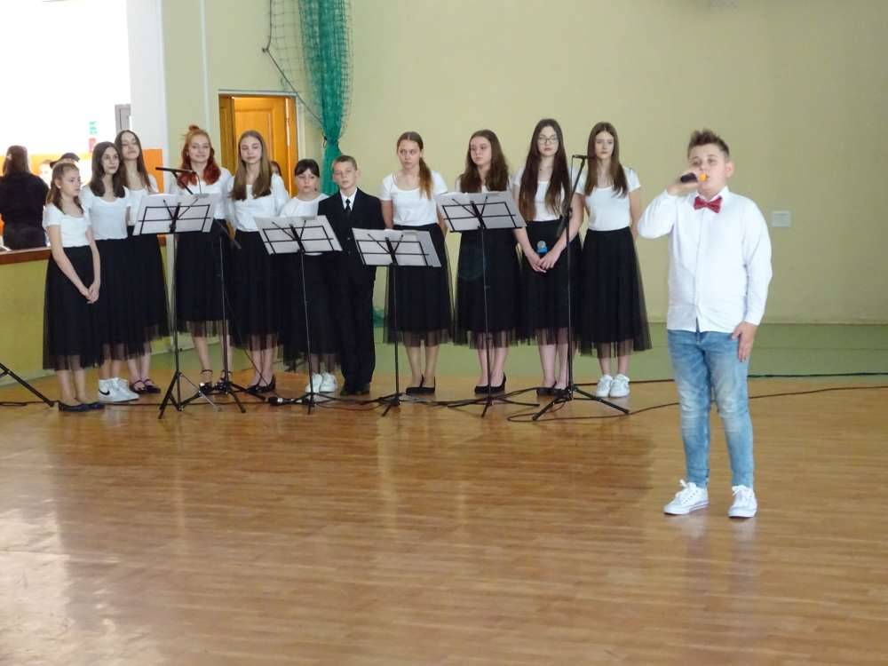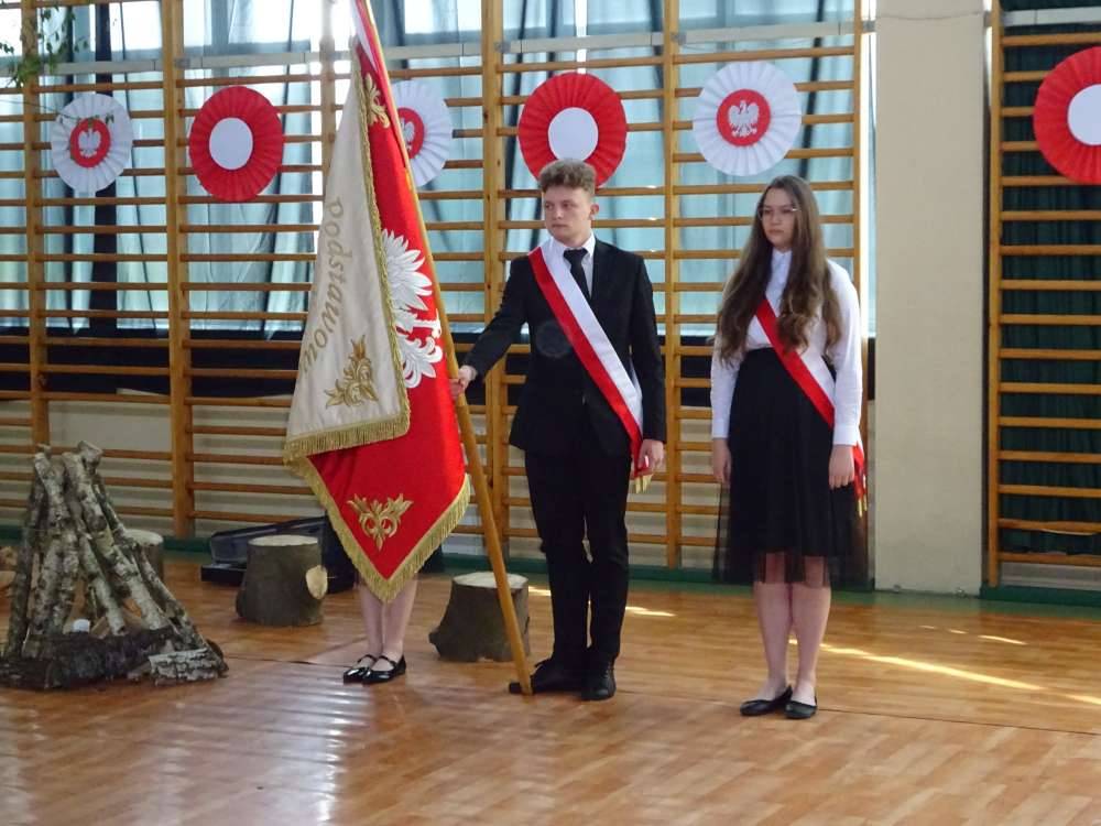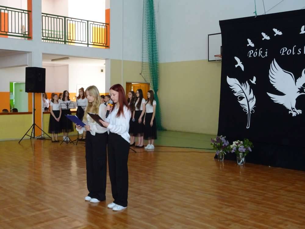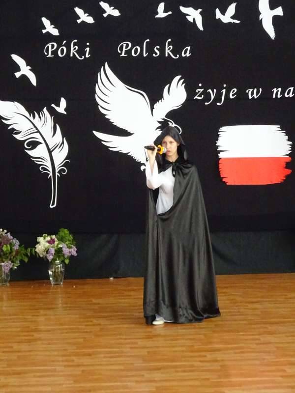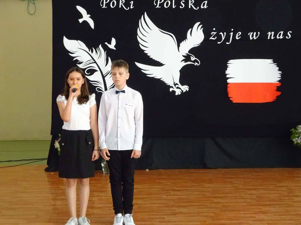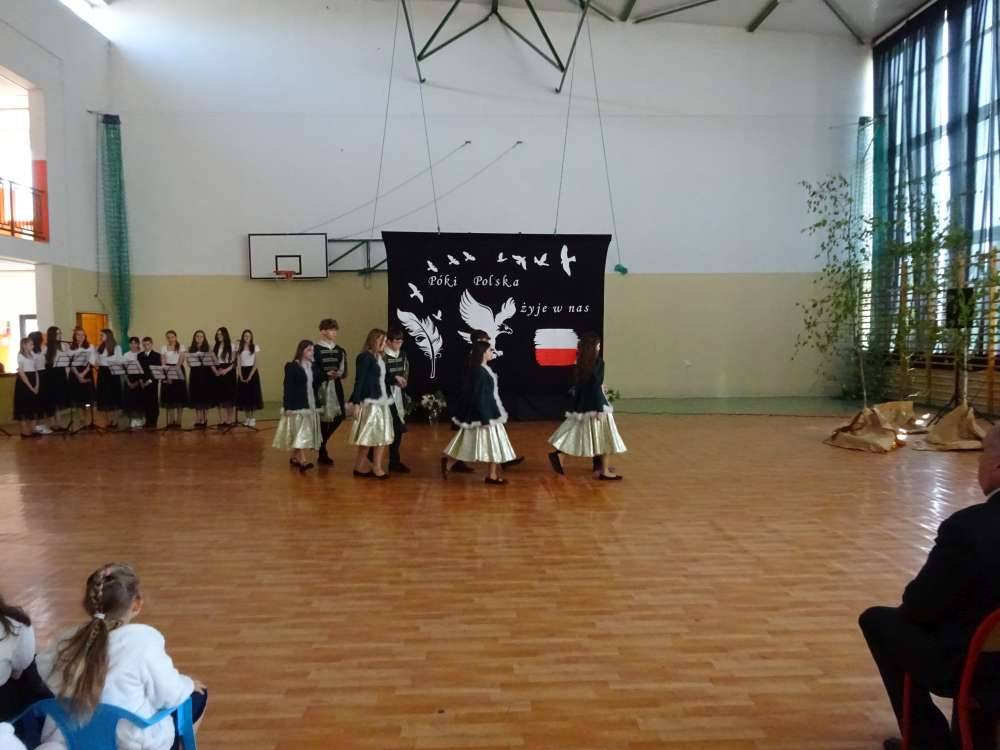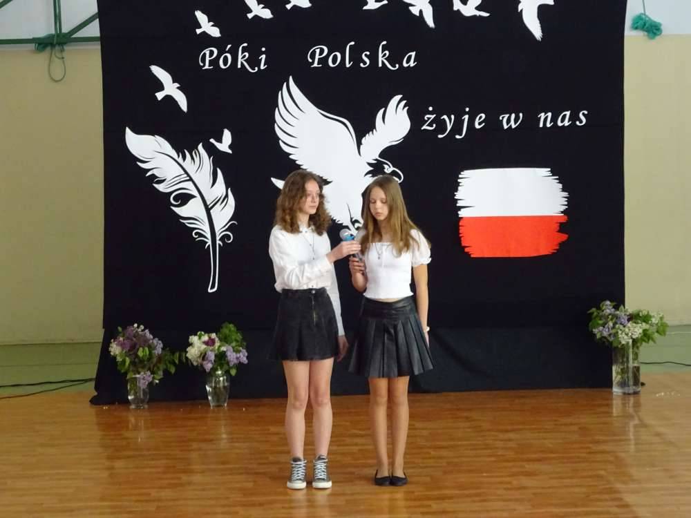 Montaż słowno – muzyczny w wykonaniu uczniów klas IV – VIII był hołdem dla twórców konstytucji oraz przypomnieniem faktów historycznych związanych z tym wydarzeniem. Konstytucja 3 Maja z 1791r. była to druga na świecie, a pierwsza w Europie ustawa zasadnicza. Polscy patrioci, dostrzegając widmo upadku Rzeczypospolitej, podjęli próbę ratowania i reformowania ojczyzny. Niestety, obowiązywała ona tylko kilka miesięcy i nie uchroniła Polski przed jej ostatecznym upadkiem. Ale występy młodych artystów to nie tylko przypomnienie faktów historycznych. Przekazali nam oni bardzo ważne przesłanie: patriotyzmu powinniśmy się uczyć każdego dnia i musimy żyć tak, by pamiętać o przeszłości i jednocześnie dbać o to, by nasza ojczyzna rozwijała się w duchu wolności, odpowiedzialności i wzajemnego szacunku. Piękne recytacje skłaniały do zastanowienia się, czym dla nas są takie pojęcia jak: wolność, naród, ojczyzna. Uroczysty nastrój budowały również pieśni patriotyczne w wykonaniu chóru szkolnego. Niezwykłych wzruszeń dostarczył taniec z biało – czerwonymi szarfami oraz mazur, podczas którego mogliśmy podziwiać polskie stroje narodowe.