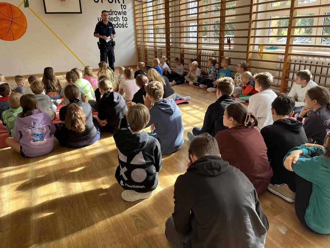 Policjant przypomniał uczniom najważniejsze zasady bezpieczeństwa podczas poruszania się po drodze: