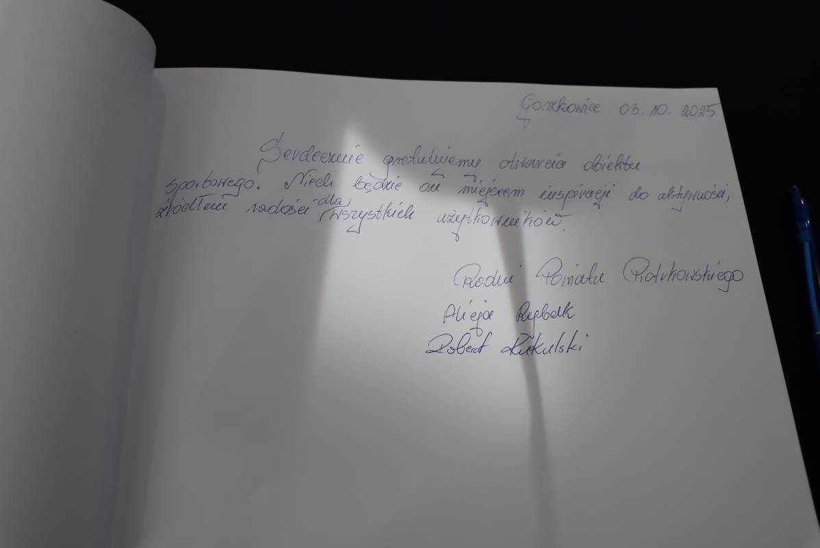 Symbolicznemu przecięciu wstęgi towarzyszyło poświęcenie obiektu przez ks. kan. Ryszarda Bryłkę, proboszcza parafii w Gorzkowicach. Po części oficjalnej uczniowie zaprezentowali pokaz sportowy, który przygotowali pod okiem nauczycieli wychowania fizycznego. Publiczność mogła również obejrzeć film ukazujący sportowe pasje i talenty młodzieży.