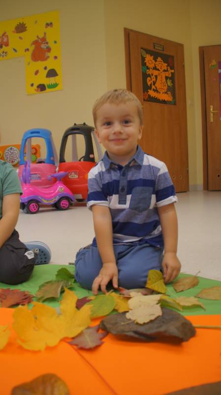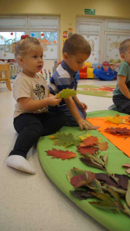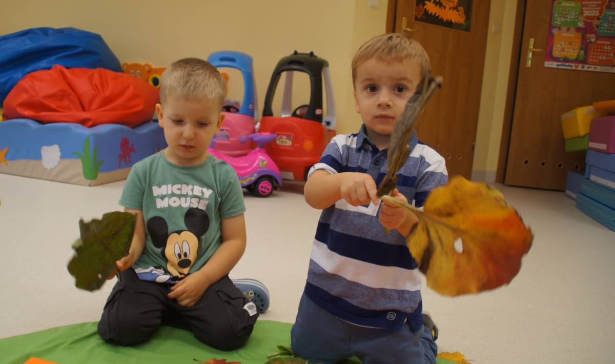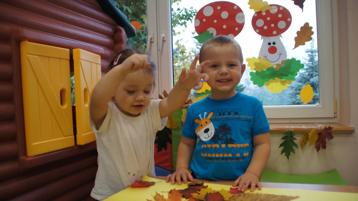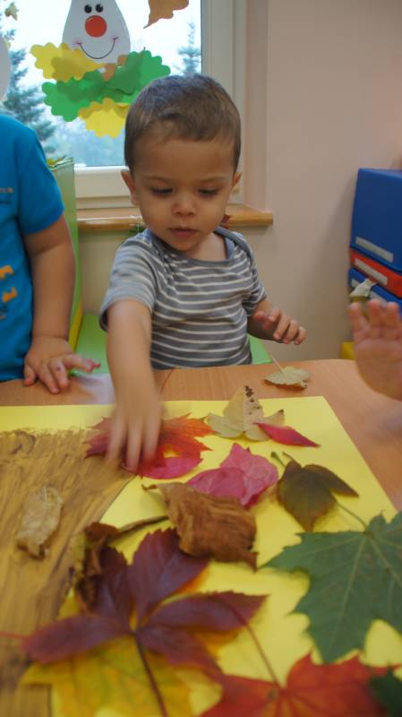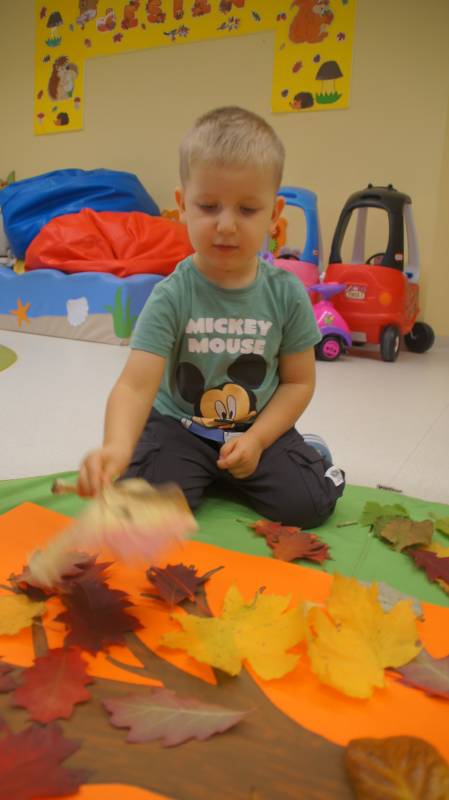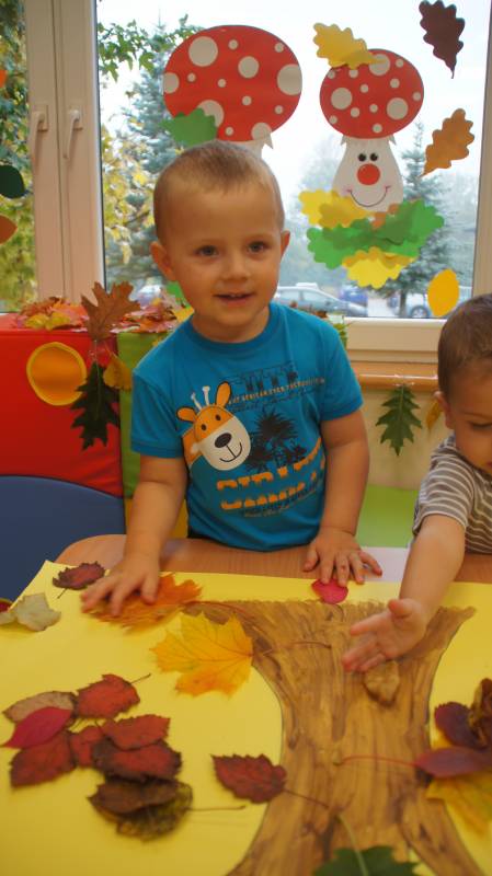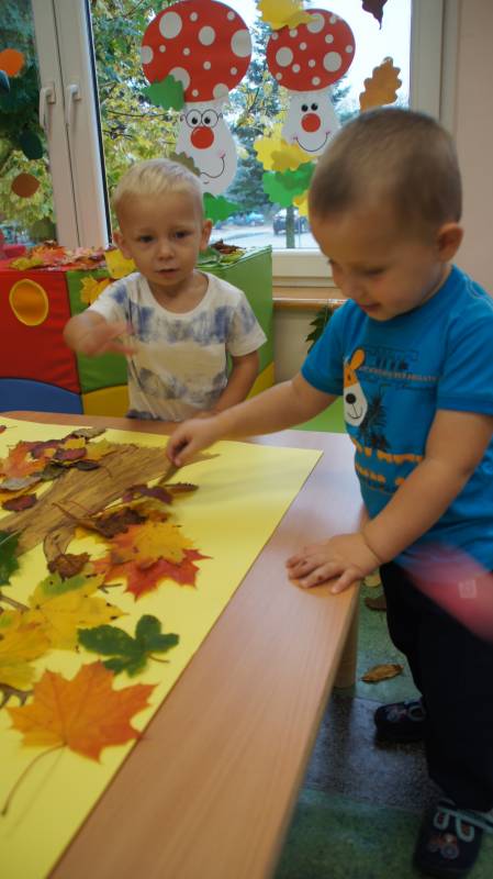 Małe rączki z zapałem przyklejały liście, tworząc wesołe, jesienne dzieło pełne barw i dziecięcej radości!
