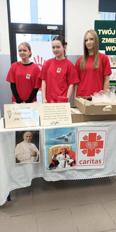 Obchody Dnia Papieskiego na stałe wpisały się w tradycję naszej szkoły. 16 października celebrujemy dzień, który przypomina nam o wyborze Karola Wojtyły na papieża. Z tej okazji Szkolne Koło Caritas zaangażowało się w charytatywną sprzedaż papieskich kremówek. Wielbicieli ulubionej słodkości św. Jana Pawła II było wielu. Sprzedano 300 kremówek a całkowity dochód ze sprzedaży zostanie przekazany na cele charytatywne. Bardzo dziękujemy wszystkim, którzy włączyli się w działania podjęte przez SK Caritas.
