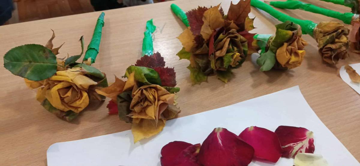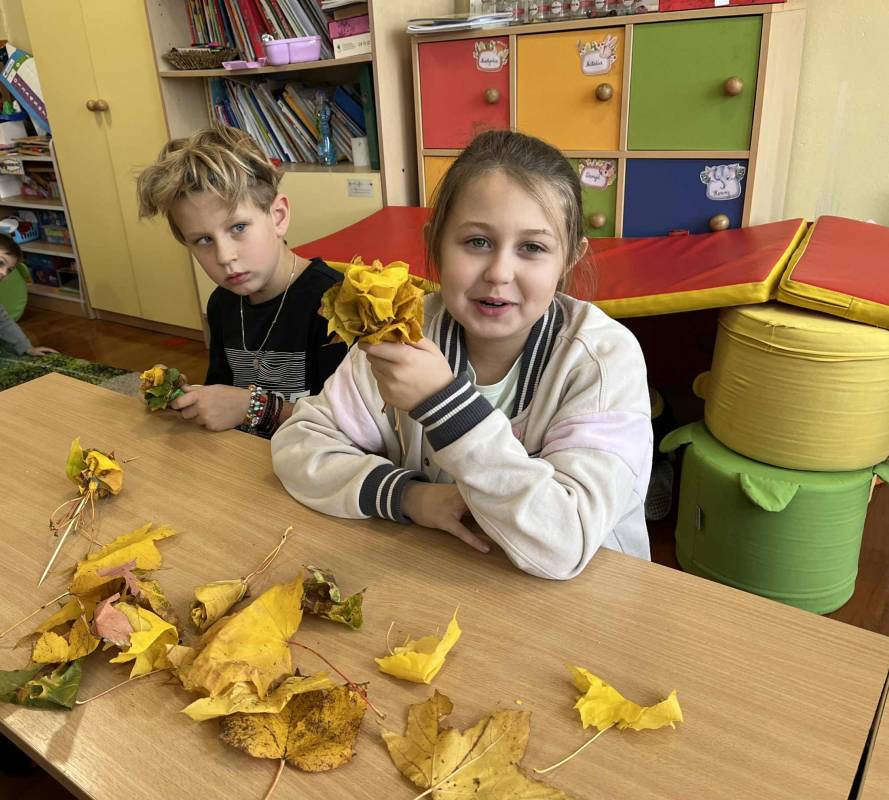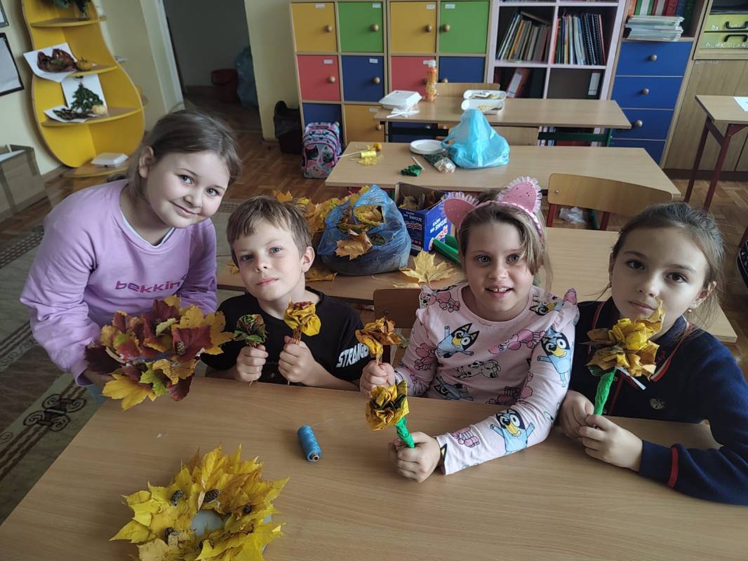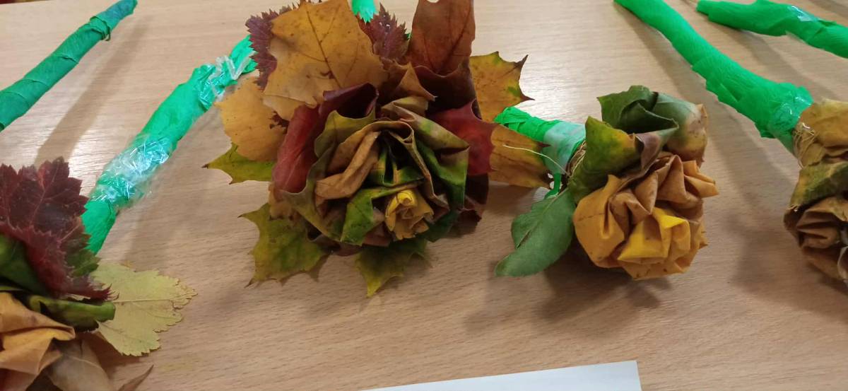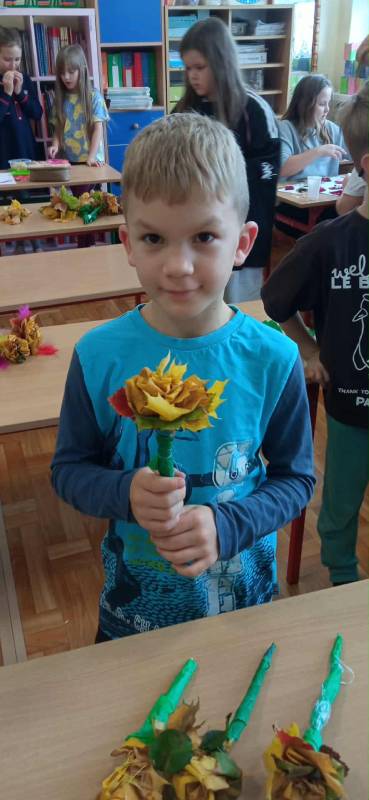 Wychowankowie świetlicy Szkoły Podstawowej w Krzemieniewicach od wielu dni z zainteresowaniem obserwują zmiany zachodzące w przyrodzie, które nieuchronnie niesie coraz odważniej poczynająca sobie jesień. Te uważne spostrzeżenia stały się inspiracją dla dziecięcej wyobraźni, owocując pięknymi i barwnymi pracami plastycznymi. Uczniowie, pod czujnym okiem wychowawców, przygotowali róże z jesiennych liści, tworząc pełne kolorów bukiety.
