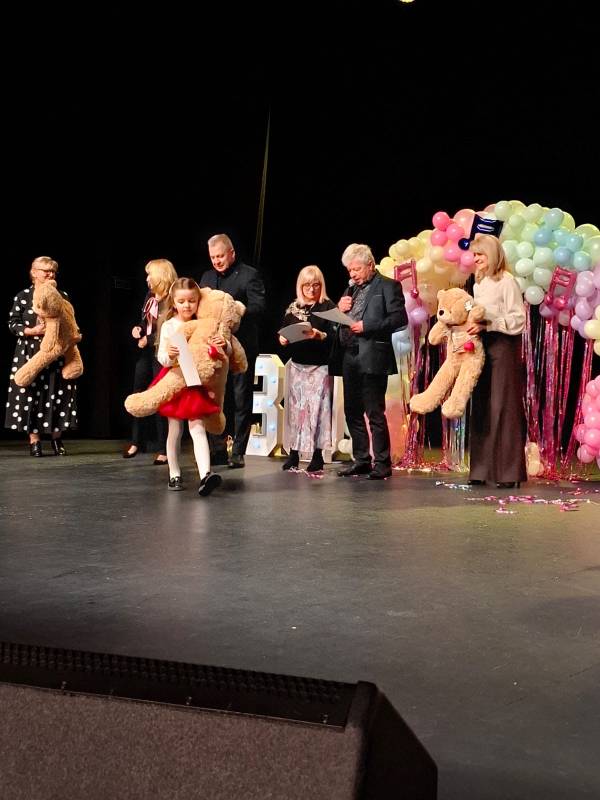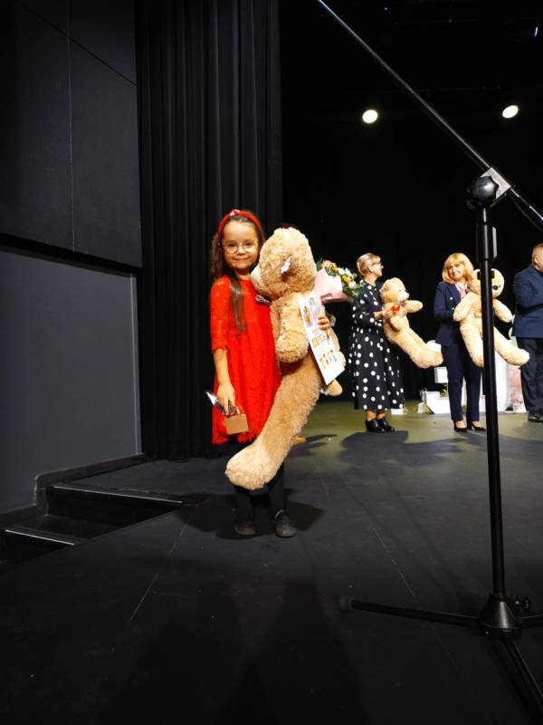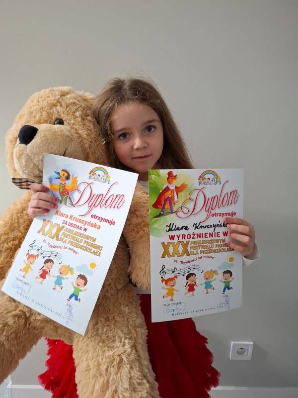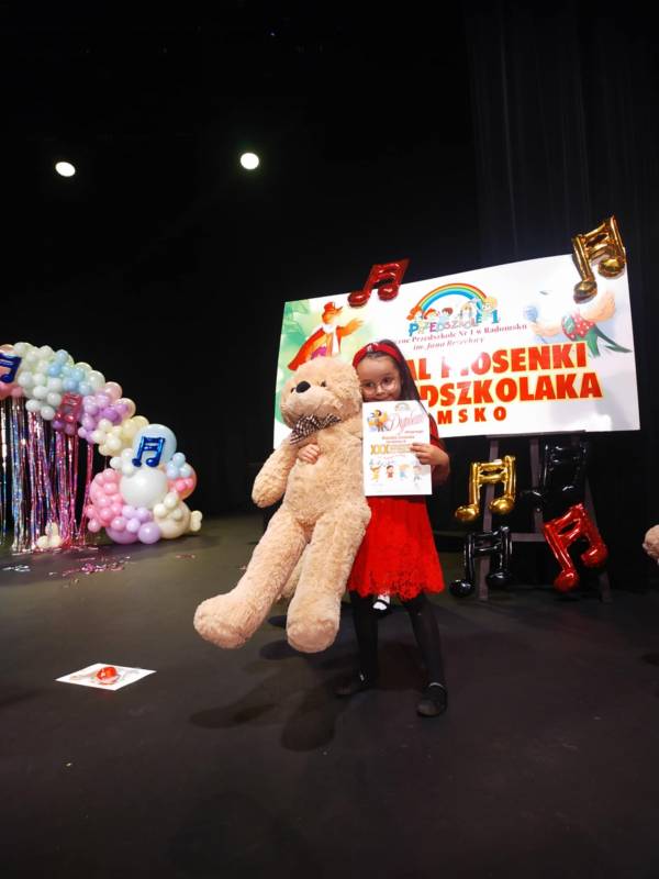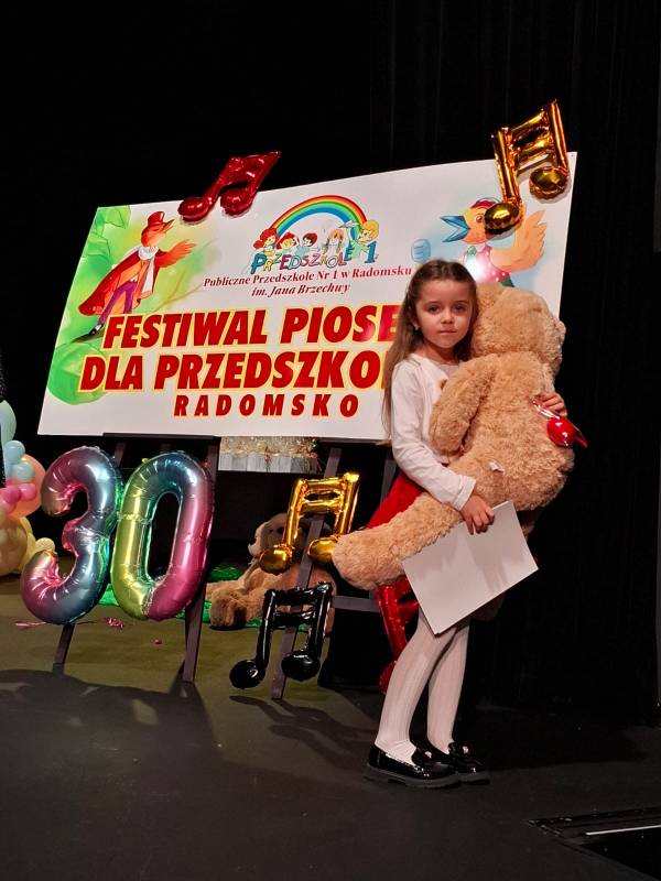 W zamierzeniu organizatora festiwal miał na celu szeroką prezentację umiejętności wokalnych i inspiracji twórczych dzieci oraz ich wspomaganie w rozwoju pasji i talentów. Podczas występu ocenie podlegały: dobór repertuaru, walory wokalne, interpretacja utworu, aranżacja oraz ogólny efekt sceniczny. Nasze Przedszkole reprezentowały: Klara Kruszyńska z grupy „Pszczółki", która zaśpiewała piosenkę: pt. „A ja mam psa" Oraz Natalia Zawada z grupy „Słoneczka" z piosenką pt. „Przyszła jesień". Obie dziewczynki pięknie zaprezentowały się na scenie, a jednej z nich, Klarze udało się zdobyć najwyższą nagrodę konkursu: wyróżnienie. Należy dodać, że jest to jeden z bardzo licznych sukcesów naszych przedszkolaków w trakcie 30-letniej edycji tego pięknego konkursu. Większość z odkrytych w naszym przedszkolu talentów biorących udział w tym wspaniałym konkursie rozwijało swoją przygodę z piosenką, muzyką tańcem w kolejnych latach edukacji, a niektórzy związali się z muzyką profesjonalnie. Organizatorom dziękujemy za zaproszenie i możliwość udziału w tak wspaniałym przedsięwzięciu, pozwalającym odkrywać i promować muzyczne talenty wśród dzieci. Gratulujemy Klarze i Natalce pięknych występów, a także wszystkim dotychczasowym laureatom i uczestnikom z naszego przedszkola, biorącym udział w poprzednich edycjach festiwalu, których z nostalgią wspominamy, serdecznie Pozdrawiamy i życzymy dalszych sukcesów.