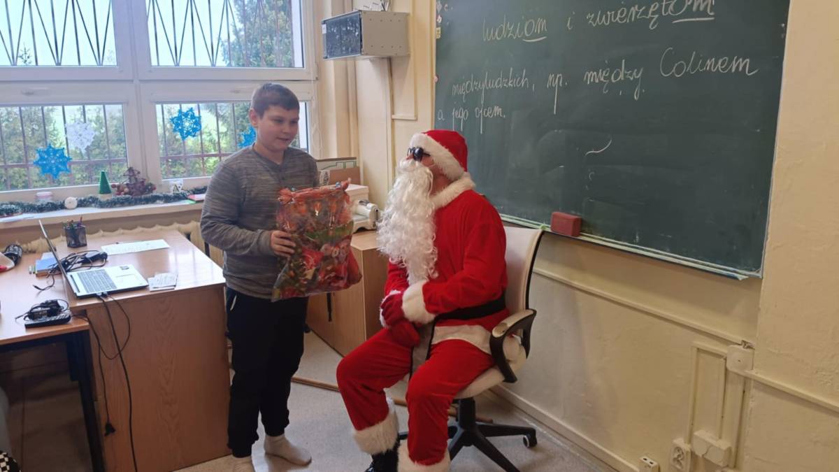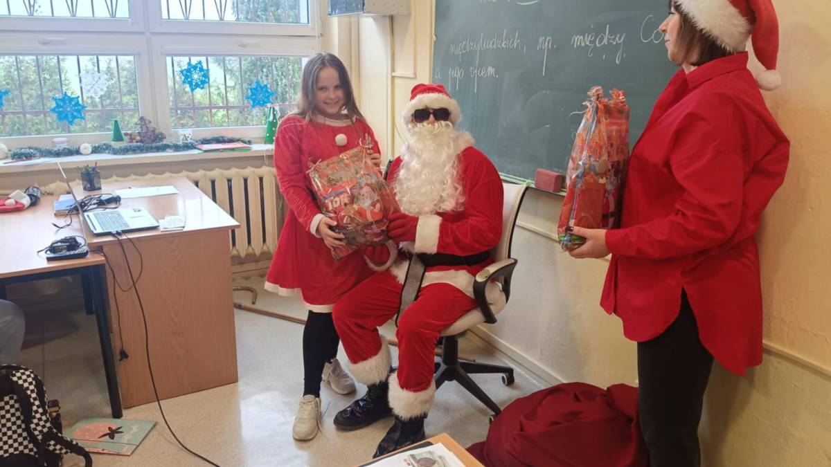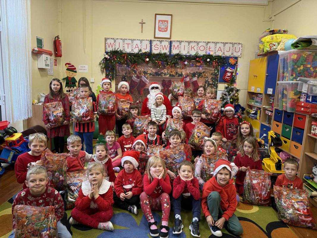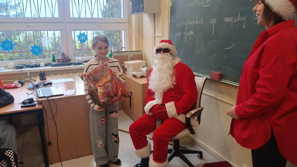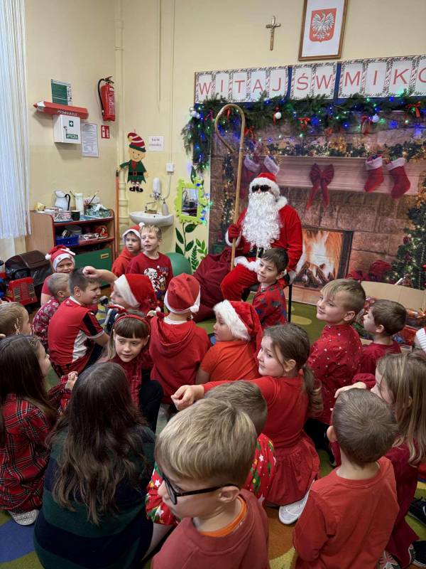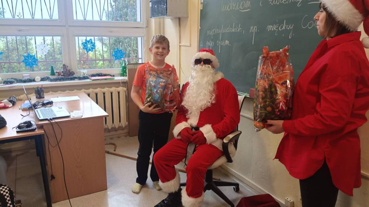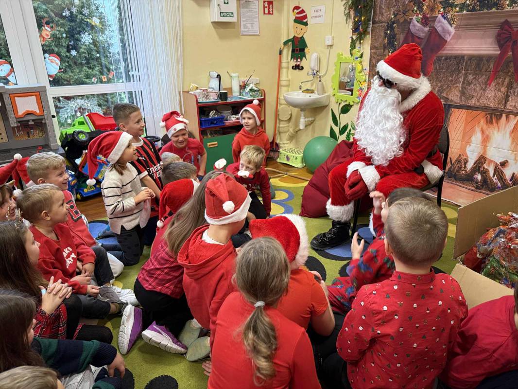 Uczniowie z przejęciem wsłuchiwali się w dźwięk dzwoneczków. Gdy rozległy się coraz wyraźniejsze głosy, wszyscy już wiedzieli, że do szkoły zbliża się sam Święty Mikołaj. Oprócz dużego worka niespodzianek przywiózł ze sobą mnóstwo uśmiechu i ciepłych słów. Rozmawiał z dziećmi, zachęcając je do bycia grzecznymi, słuchania rodziców oraz pań w szkole. Na zakończenie każdemu wręczył upominek – dla każdego znalazło się coś miłego!