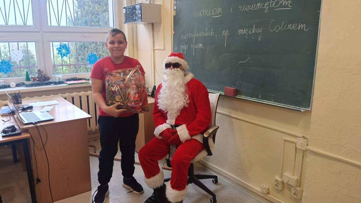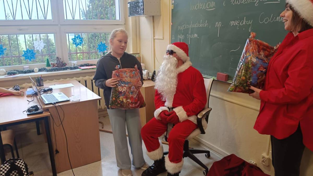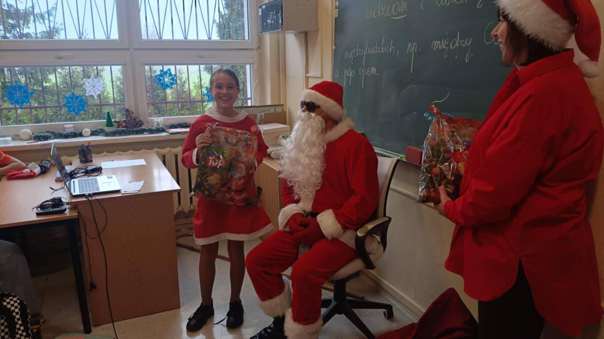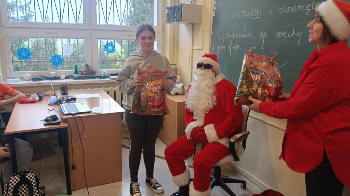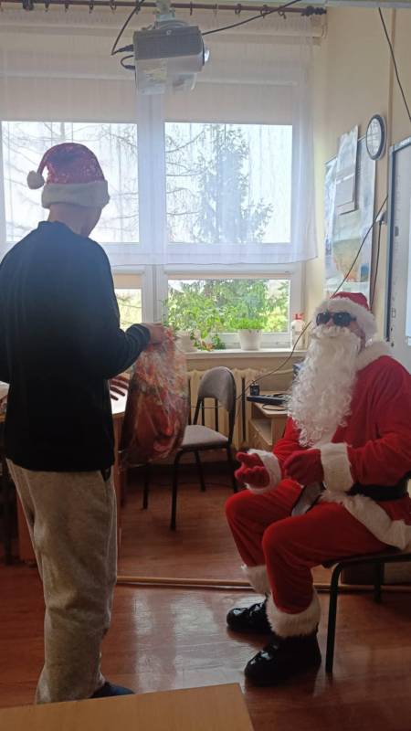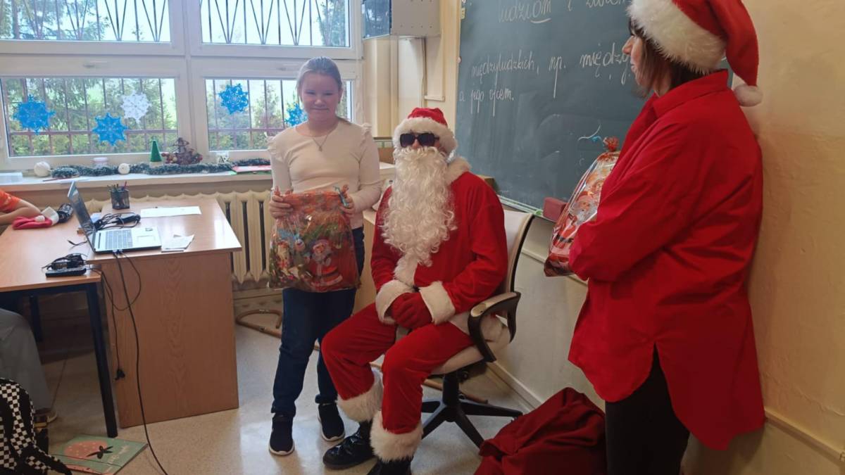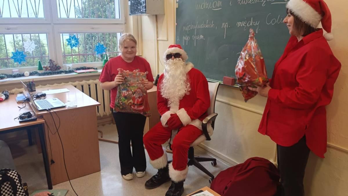 Uczniowie z przejęciem wsłuchiwali się w dźwięk dzwoneczków. Gdy rozległy się coraz wyraźniejsze głosy, wszyscy już wiedzieli, że do szkoły zbliża się sam Święty Mikołaj. Oprócz dużego worka niespodzianek przywiózł ze sobą mnóstwo uśmiechu i ciepłych słów. Rozmawiał z dziećmi, zachęcając je do bycia grzecznymi, słuchania rodziców oraz pań w szkole. Na zakończenie każdemu wręczył upominek – dla każdego znalazło się coś miłego!