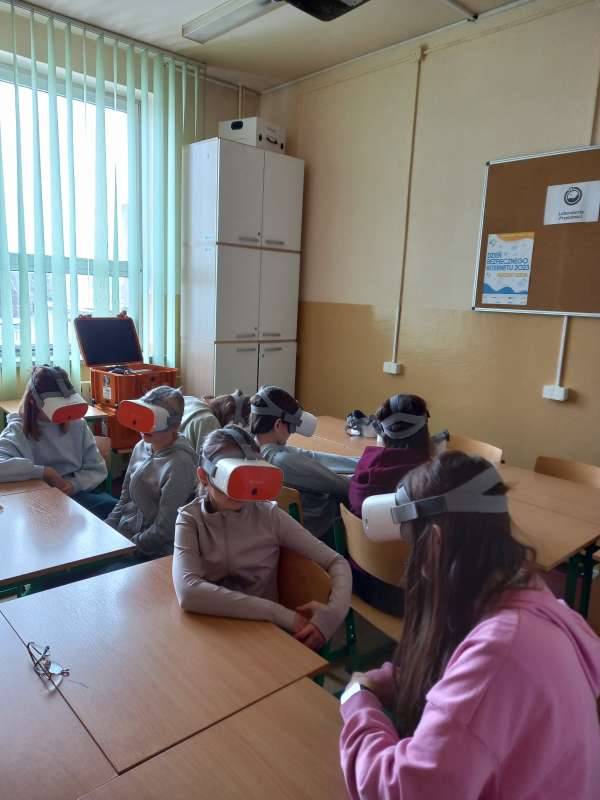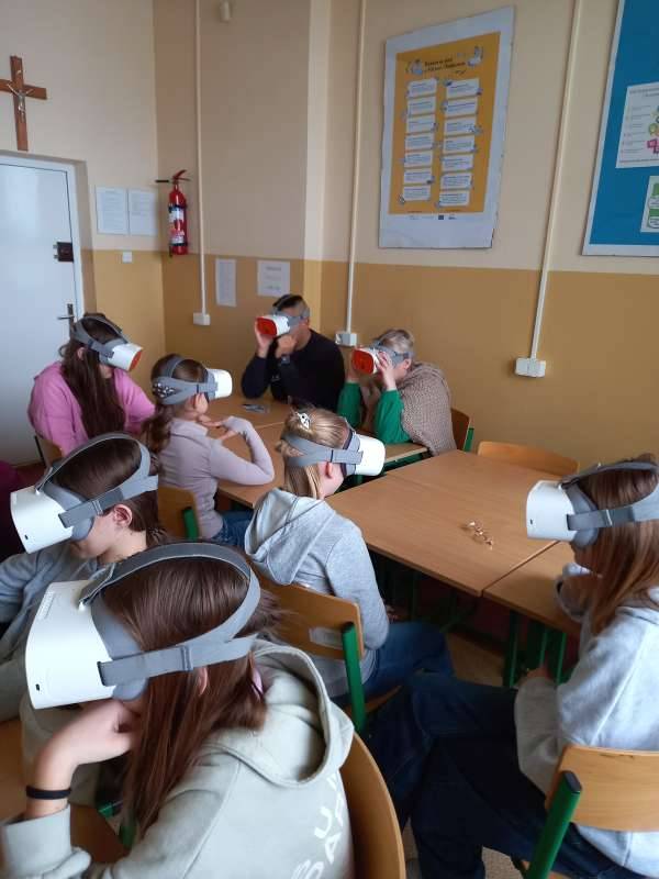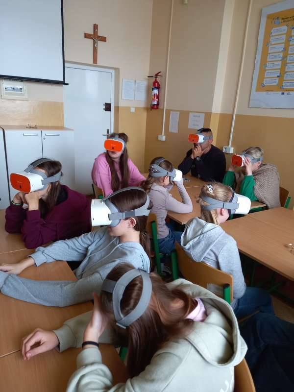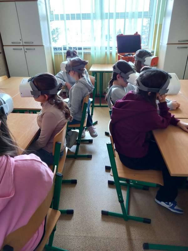 W trakciezajęć świetlicowych uczniowie uczestniczyli w aktywnościach edukacyjno-rozrywkowych w wirtualnej rzeczywistości z wykorzystaniem okularów VR. Celem zajęć było rozwijanie ciekawości poznawczej, integracja grupy oraz zapoznanie dzieci z nowoczesnymi technologiami w bezpieczny i kontrolowany sposób. Uczniowie mieli możliwość obejrzenia krótkich filmów i symulacji edukacyjnych np. wirtualne podróże, przestrzenie przyrodnicze oraz zwiedzanie zabytków (jednym z takich zabytków był nasz miejscowy kościół). Zajęcia wzbudziły duże zainteresowanie, sprzyjały rozwijaniu wyobraźni i kompetencji cyfrowych oraz miały pozytywny wpływ na integrację grupy.