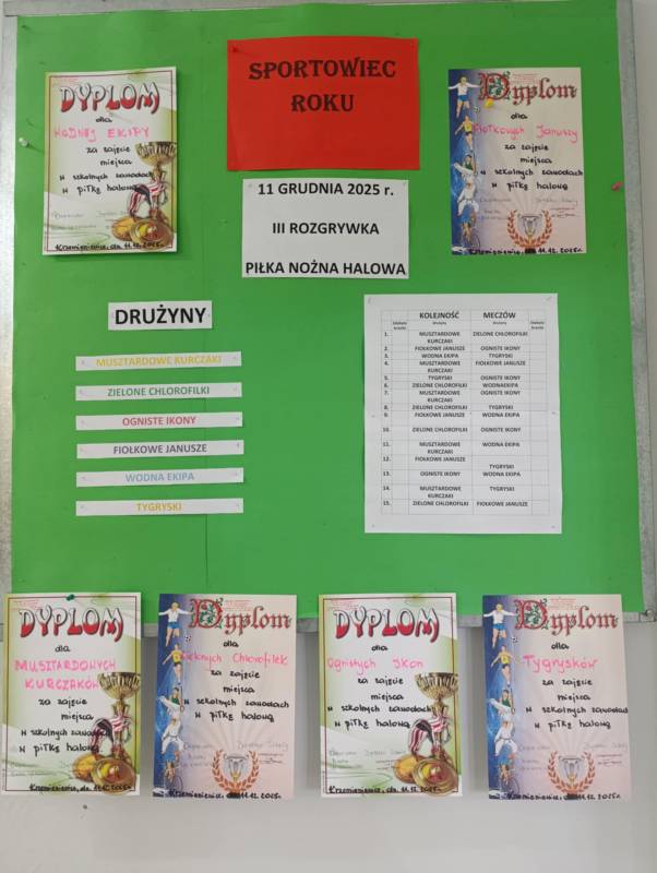 W Szkole Podstawowej w Krzemieniewicach się kolejne zawody sportowe zorganizowane w ramach trwającego cały rok szkolny konkursu „ Sportowiec Roku”. Tym razem uczniowie mierzyli się w piłce nożnej halowej. Każda z 6 drużyn rozegrała pięć meczów, grając ,,każdy z każdym". Łączenie odbyło się 15 meczów, które wyłoniły zwycięzców. Sportowcy zostali nagrodzeni dyplomami, drobnymi upominkami oraz zdrową przekąską. Poprzez ruch, krzewimy nawyk zdrowego stylu życia.