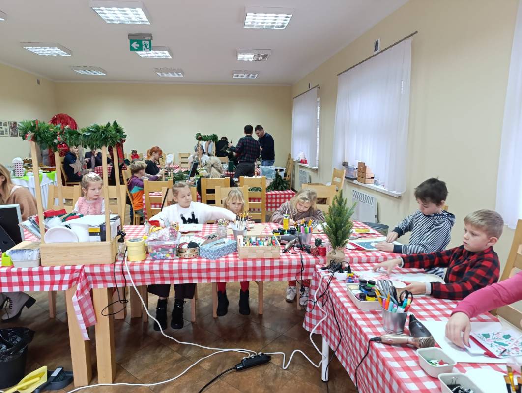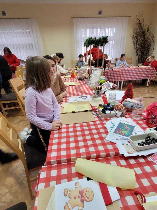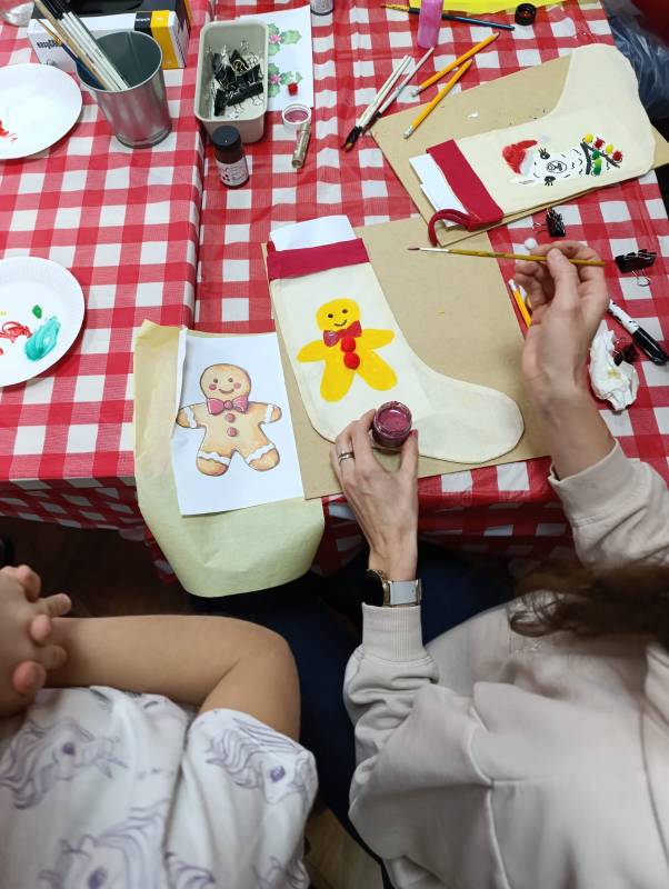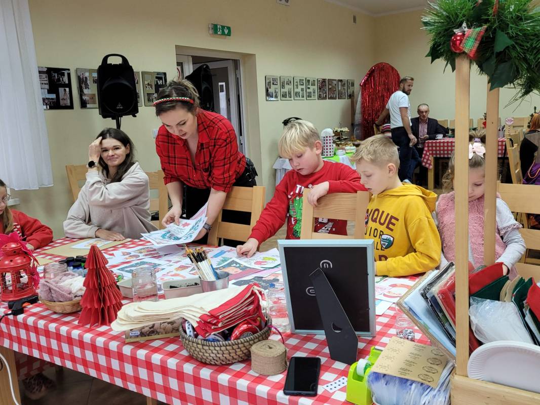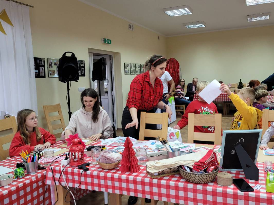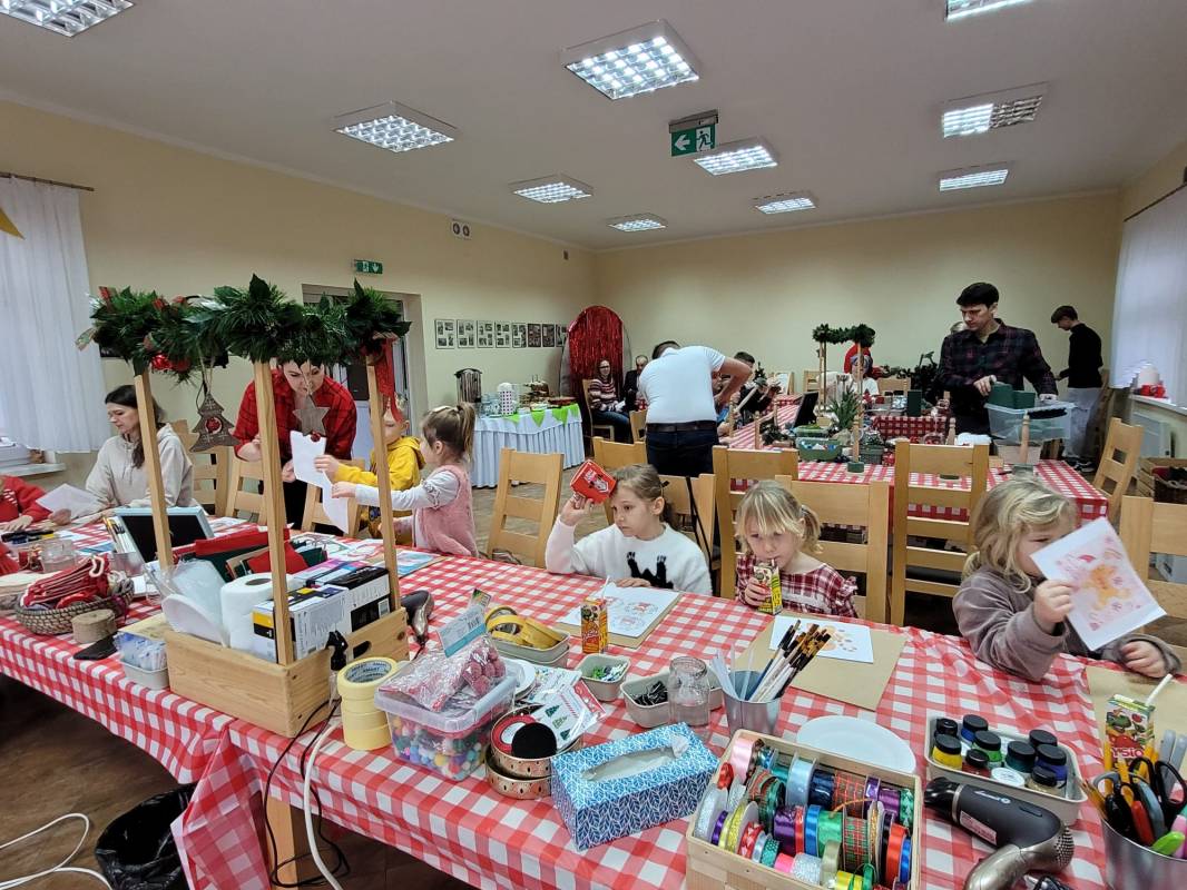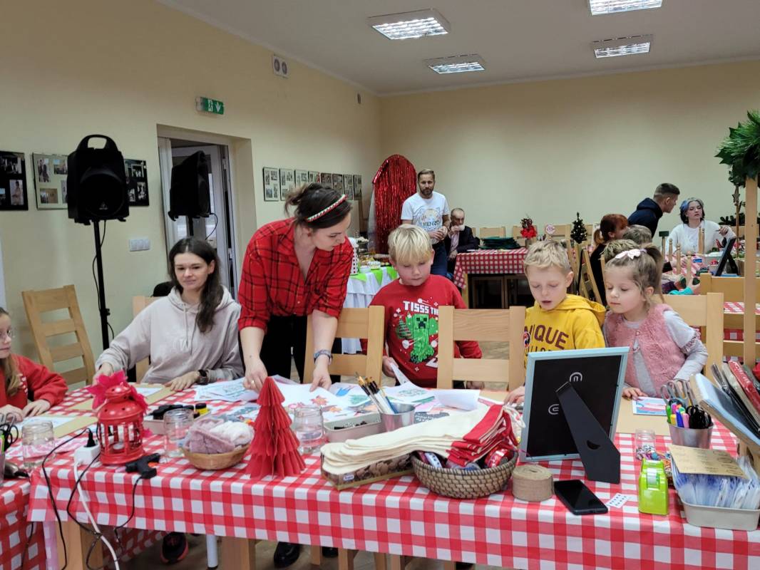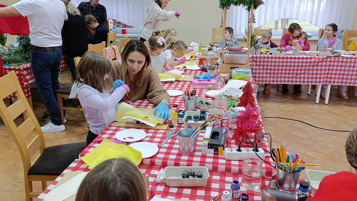 Dzieci z dużym zaangażowaniem wykonywały kolorowe świąteczne skrzaty oraz ozdobne skarpety. W trakcie warsztatów mogły liczyć na pomoc dorosłych, co sprzyjało integracji międzypokoleniowej i stworzeniu ciepłej, rodzinnej atmosfery.