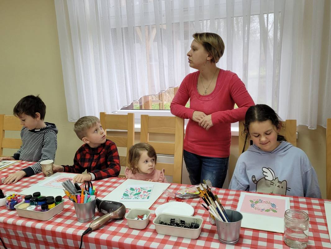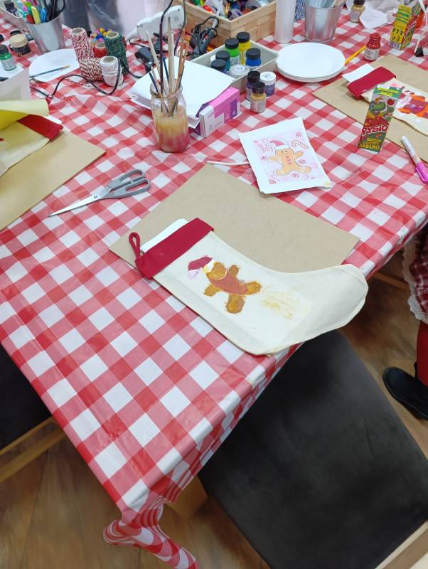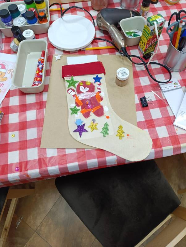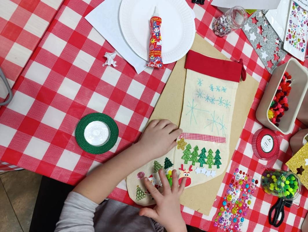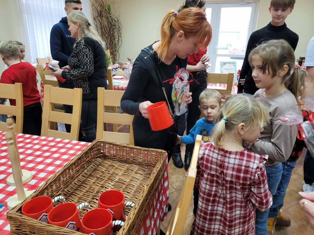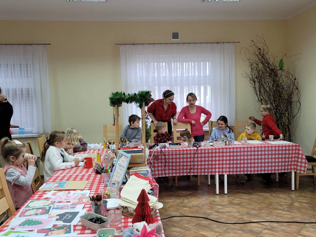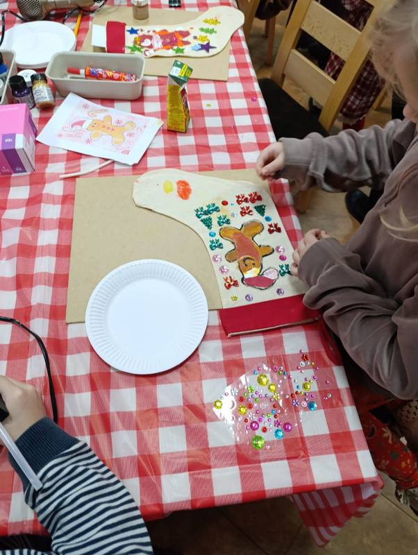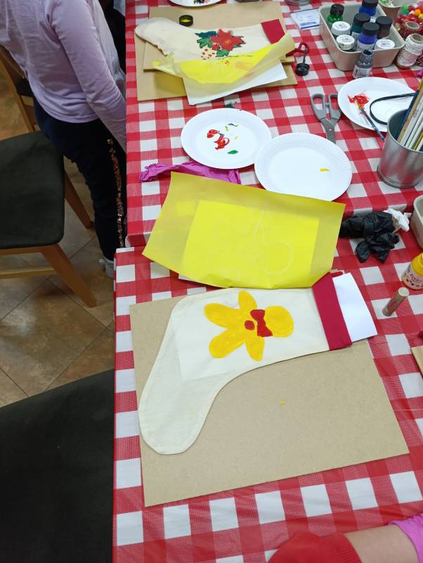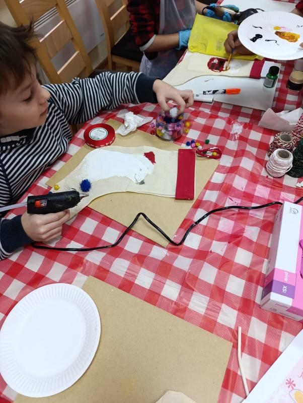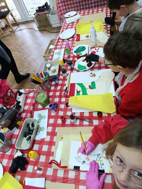 Dzieci z dużym zaangażowaniem wykonywały kolorowe świąteczne skrzaty oraz ozdobne skarpety. W trakcie warsztatów mogły liczyć na pomoc dorosłych, co sprzyjało integracji międzypokoleniowej i stworzeniu ciepłej, rodzinnej atmosfery.