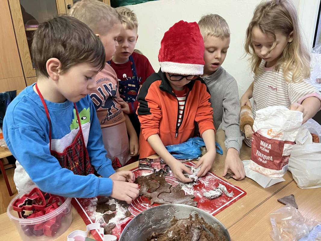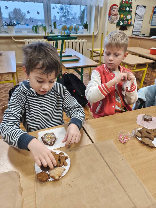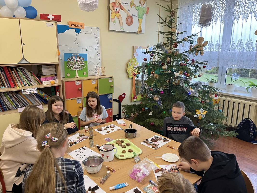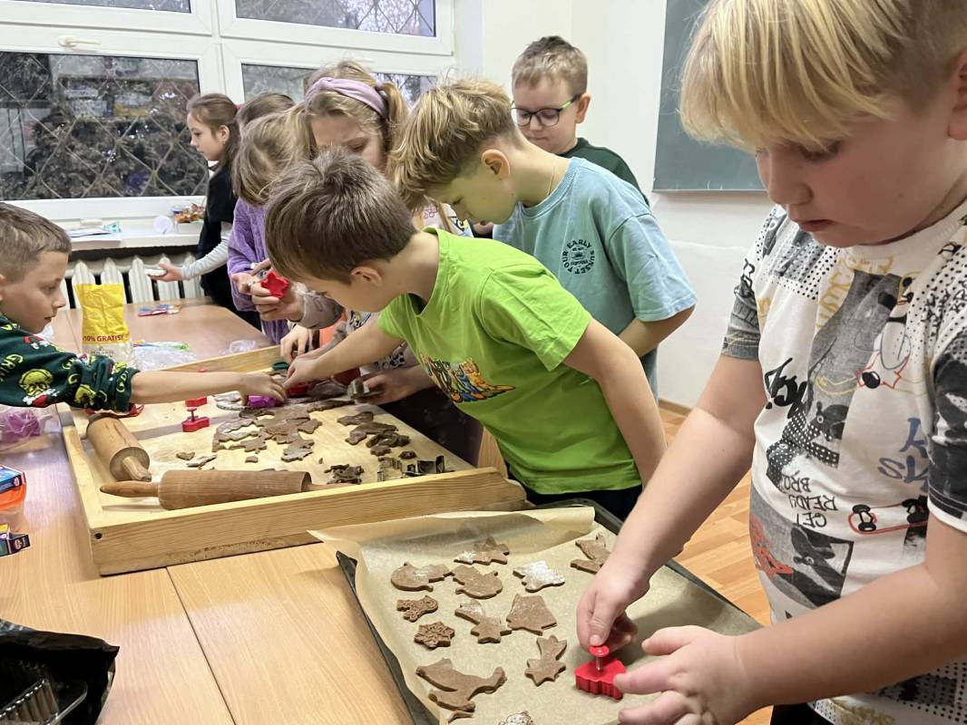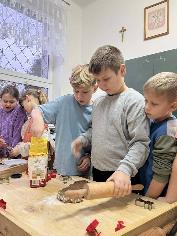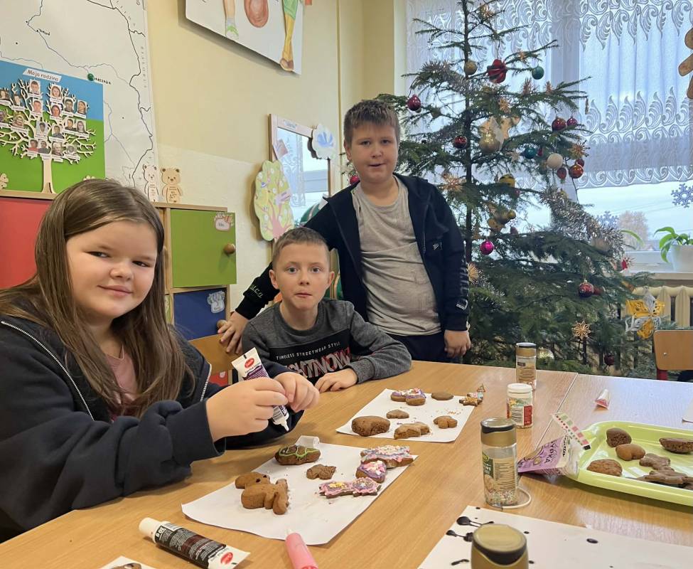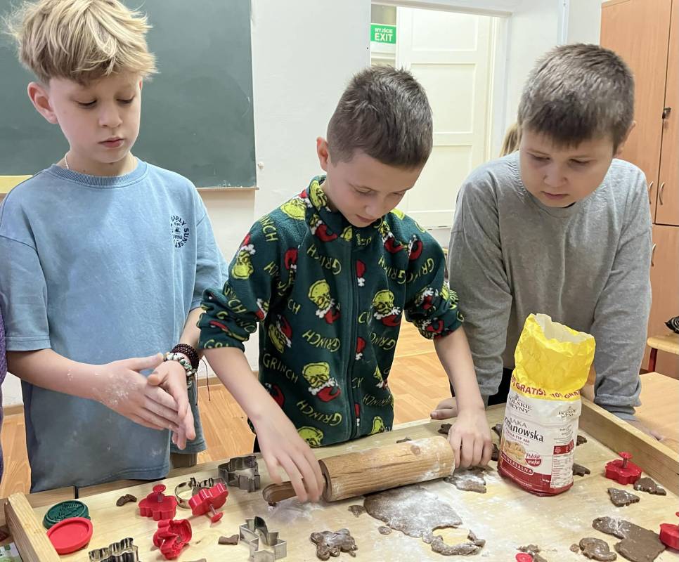 W piątek 12 grudnia korytarze Szkoły Podstawowej w Krzemieniewicach wypełnił wyjątkowy zapach korzennych przypraw, który wprowadził wszystkich w świąteczny nastrój. Stało się to za sprawą uczniów klas 0-3, którzy wspólnie wzięli udział w pieczeniu pierniczków. Dzieci z wielkim zaangażowaniem wałkowały ciasto, wykrawały różne kształty ciasteczek oraz dekorowały je kolorowymi lukrami i posypkami.