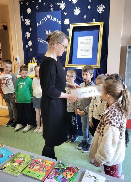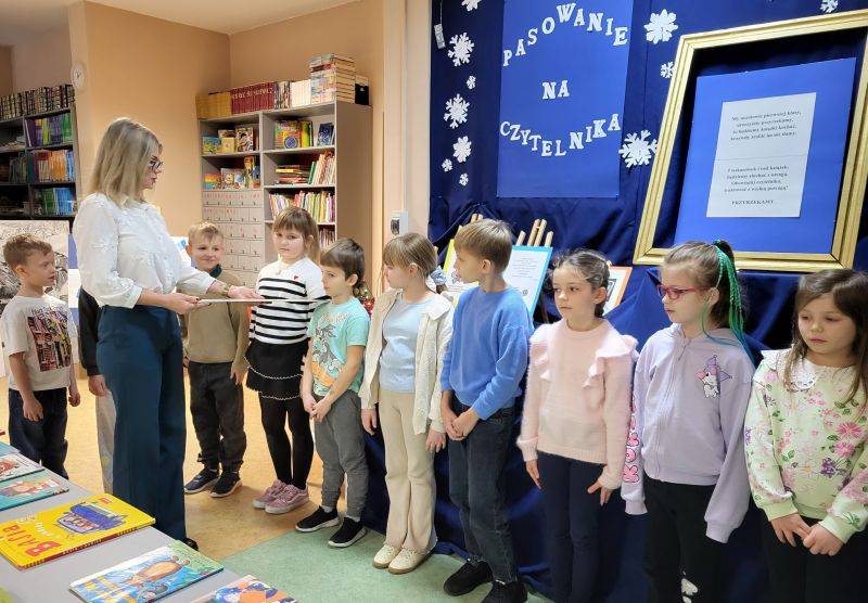 Kulminacyjnym momentem uroczystości było złożenie uroczystego ślubowania i symboliczne pasowanie uczniów przez Panią Dyrektor na czytelników biblioteki szkolnej. Po oficjalnym przyjęciu do grona społeczności czytelniczej, najmłodsi czytelnicy wypożyczyli pierwszą książkę.