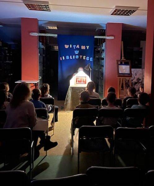 W trakcie wydarzenia pierwszoklasiści poznali historię młodego kociaka, który po raz pierwszy idzie z mamą do biblioteki…”- Tutaj – mówi mama – znajdują się książki. Są magiczne, mogą cię zabrać bardzo daleko…Są niezwykłe i zawierają w sobie całe piękno świata!…” Ta niezwykła opowieść o wyprawie w świat wyobraźni przedstawiona w formie japońskiego teatrzyku obrazkowego, wzbudziła duże zainteresowanie i zachęciła dzieci do rozmowy o książkach i czytaniu. Następnie uczniowie przy dźwiękach piosenki „Pociąg do książki” podróżowali po bibliotece, a podczas przystanku na stacji „Pasowanie” zaprezentowali z dużym zaangażowaniem wiersz „Dzień dobry, Panie Andersenie” autorstwa Wandy Chotomskiej.