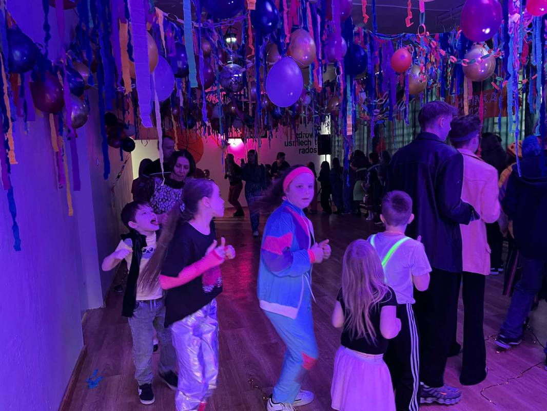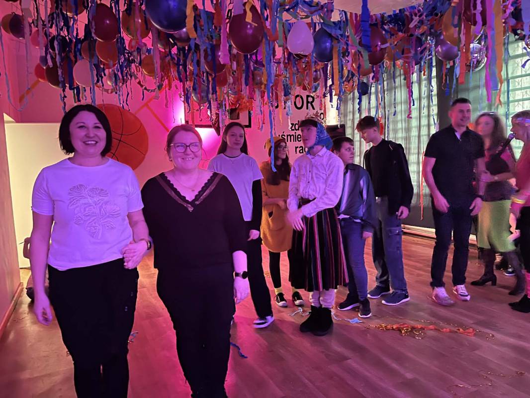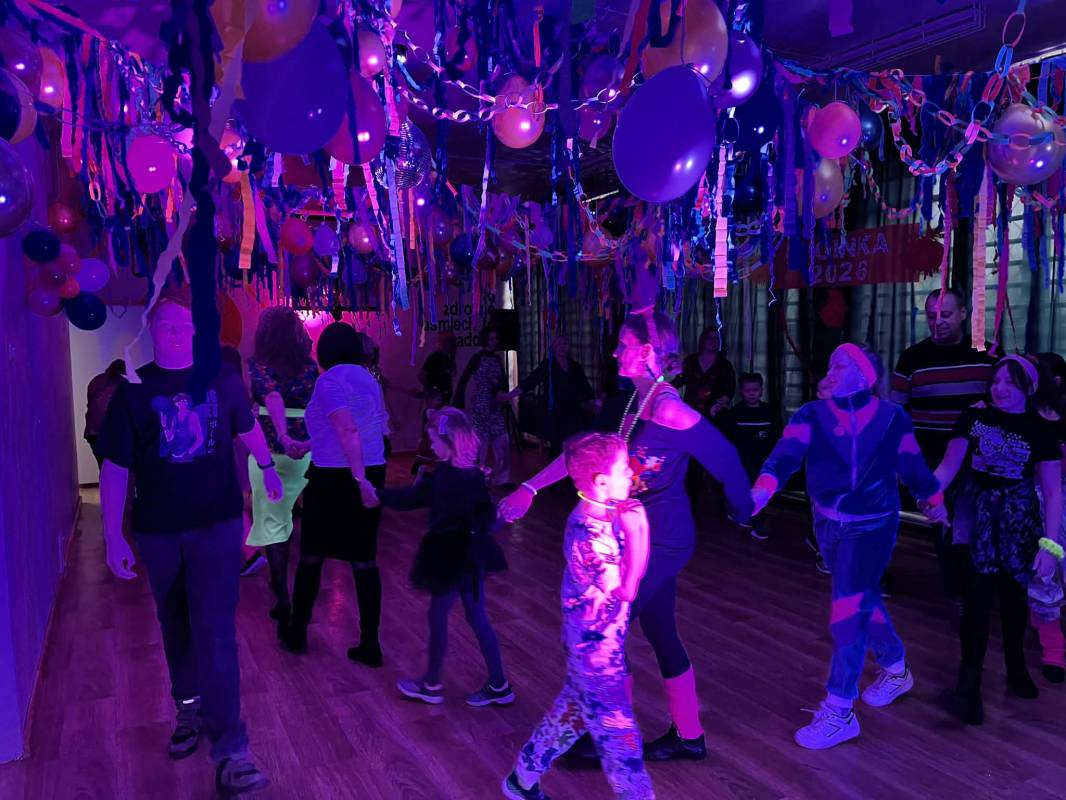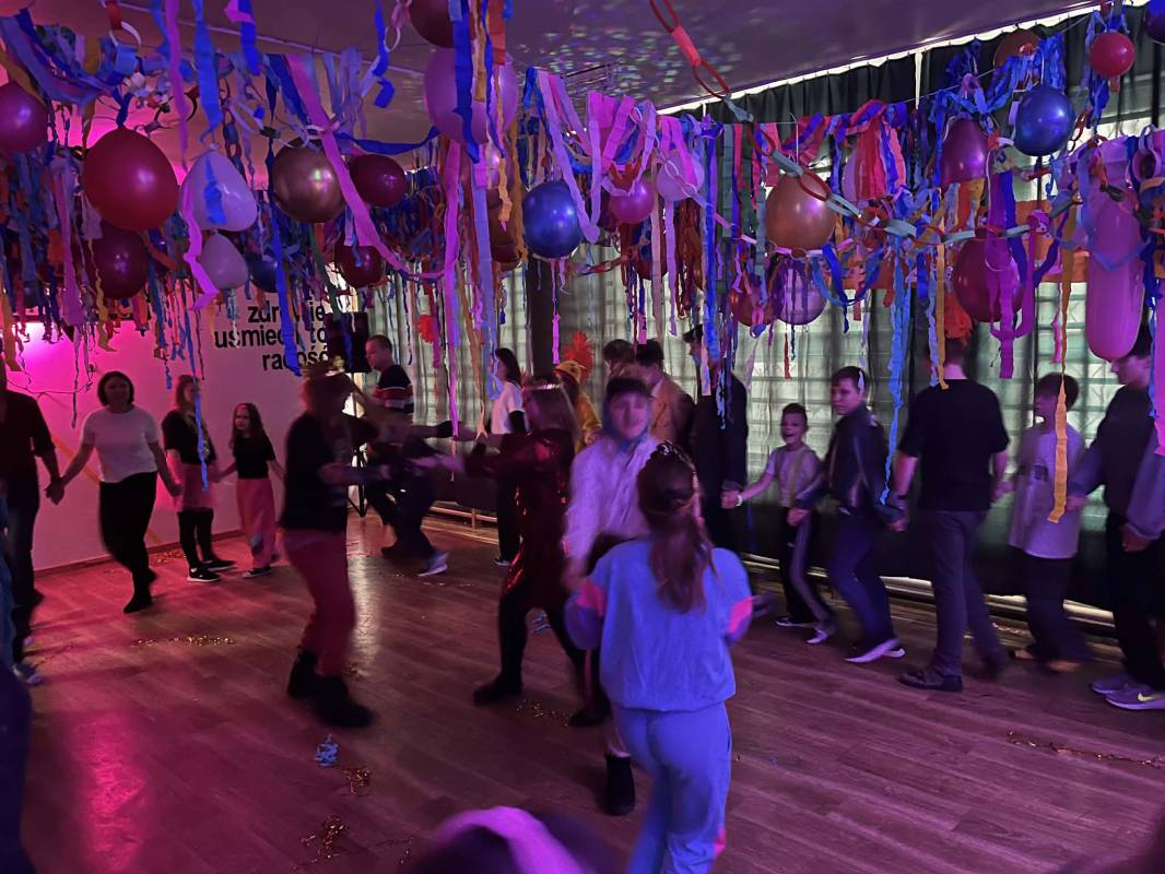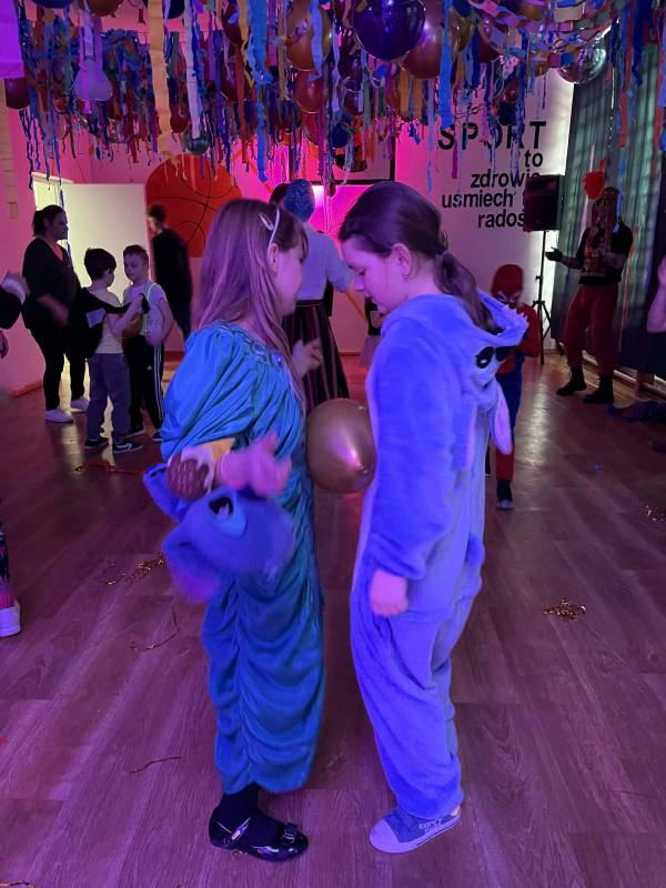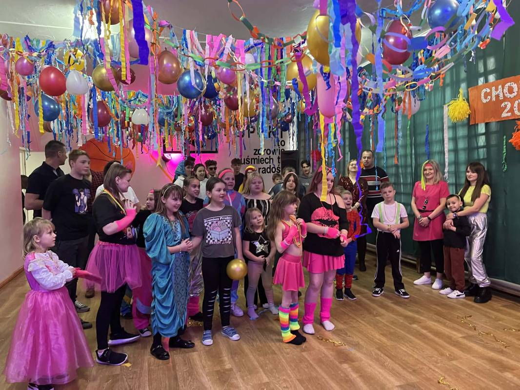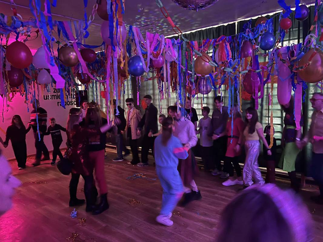 Zabawa rozpoczęła się o godzinie 9.30 w sali gimnastycznej, w której królowały balony, bibuła, kolorowe, papierowe łańcuchy i kule disco. Można było poczuć klimat dawnych szkolnych dyskotek i tradycyjnych zabaw choinkowych.