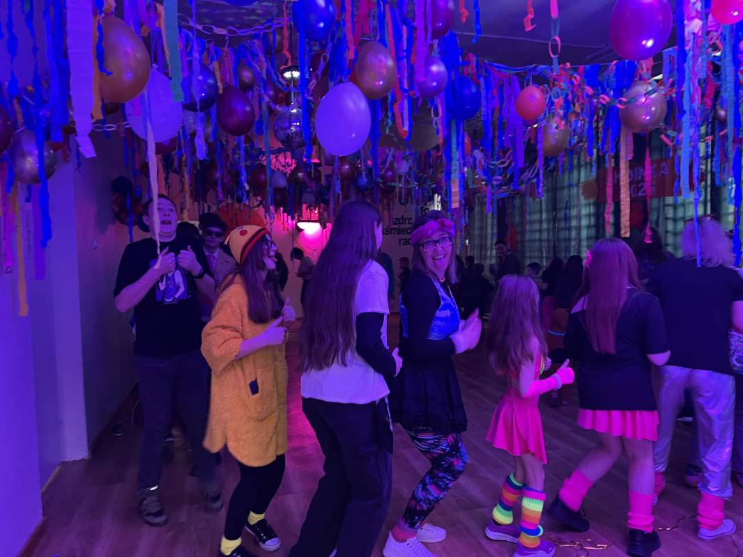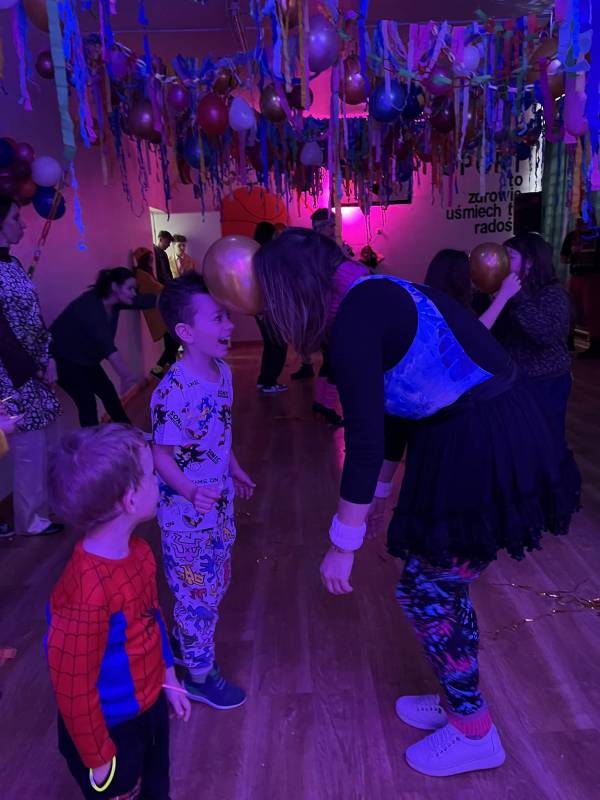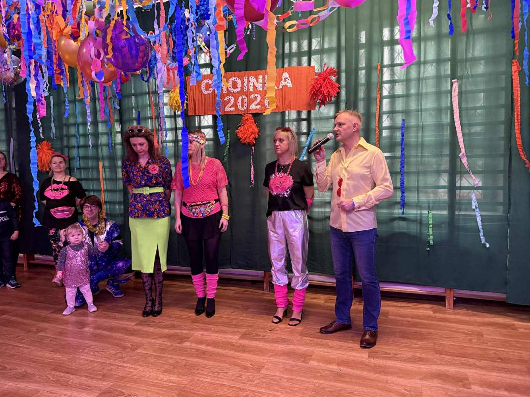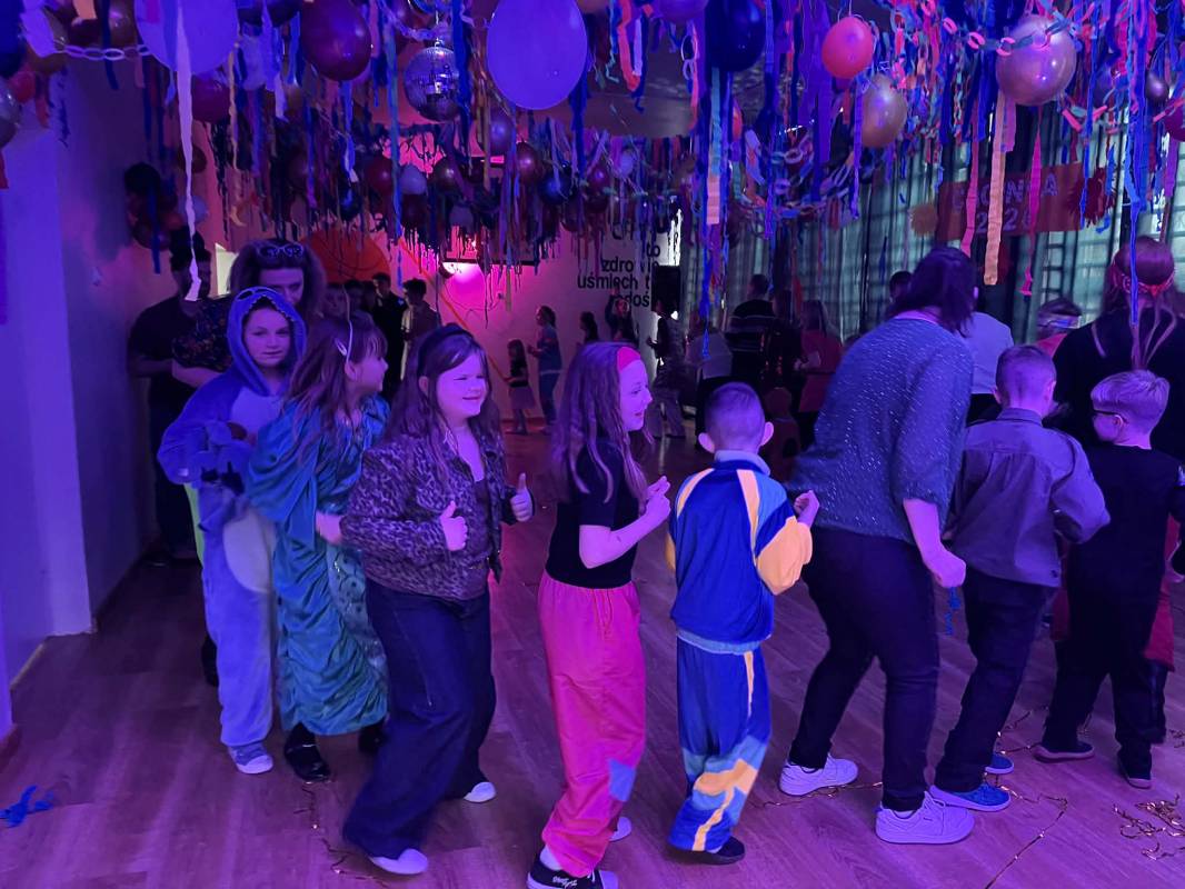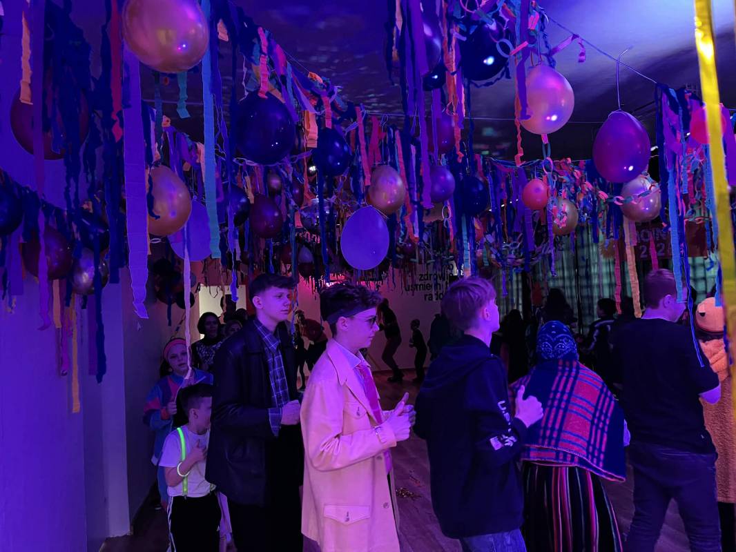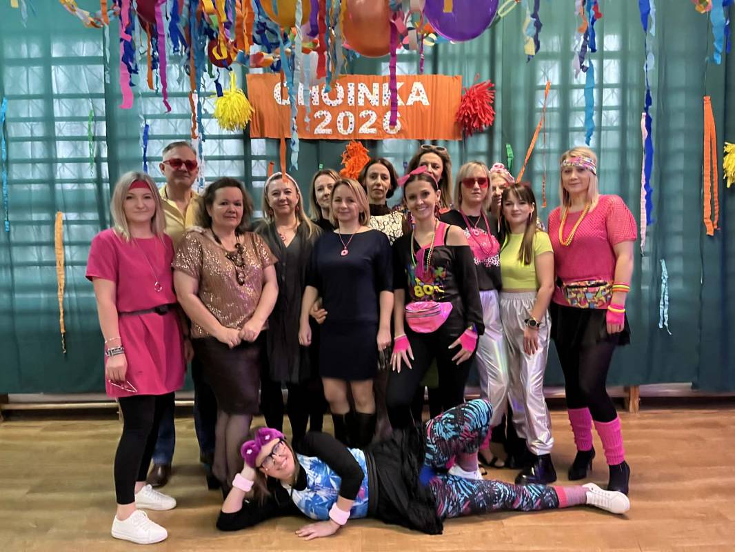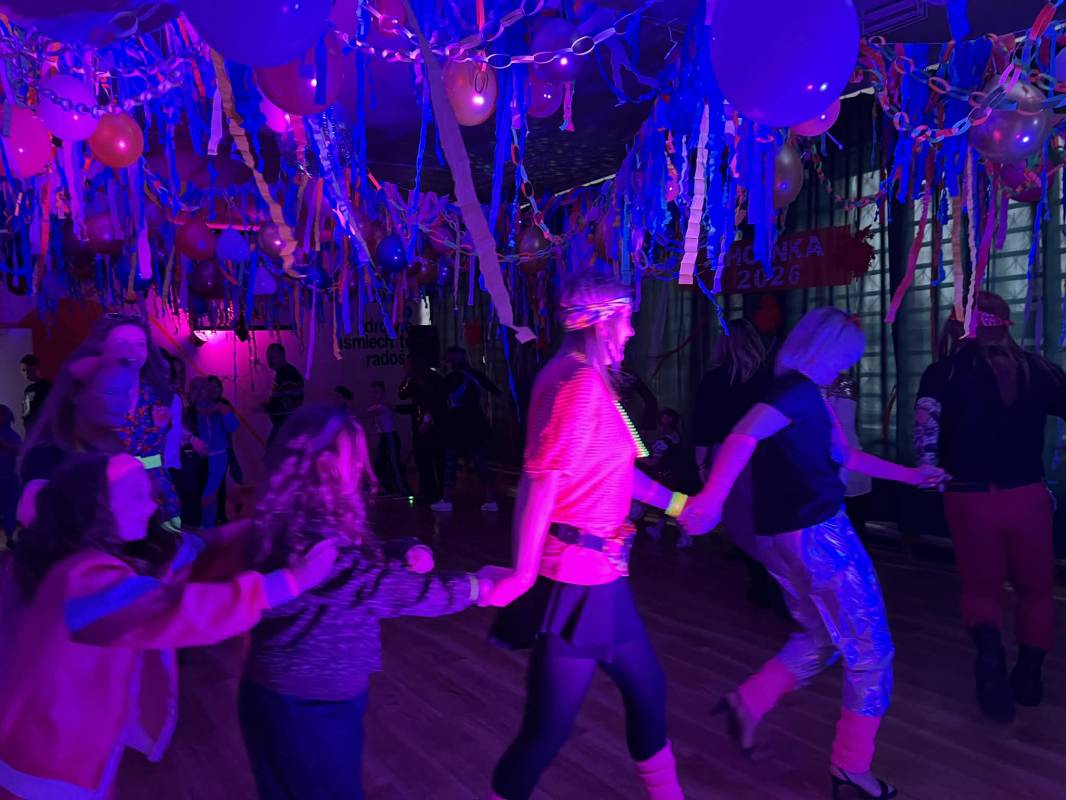 Zabawa rozpoczęła się o godzinie 9.30 w sali gimnastycznej, w której królowały balony, bibuła, kolorowe, papierowe łańcuchy i kule disco. Można było poczuć klimat dawnych szkolnych dyskotek i tradycyjnych zabaw choinkowych.