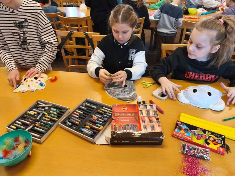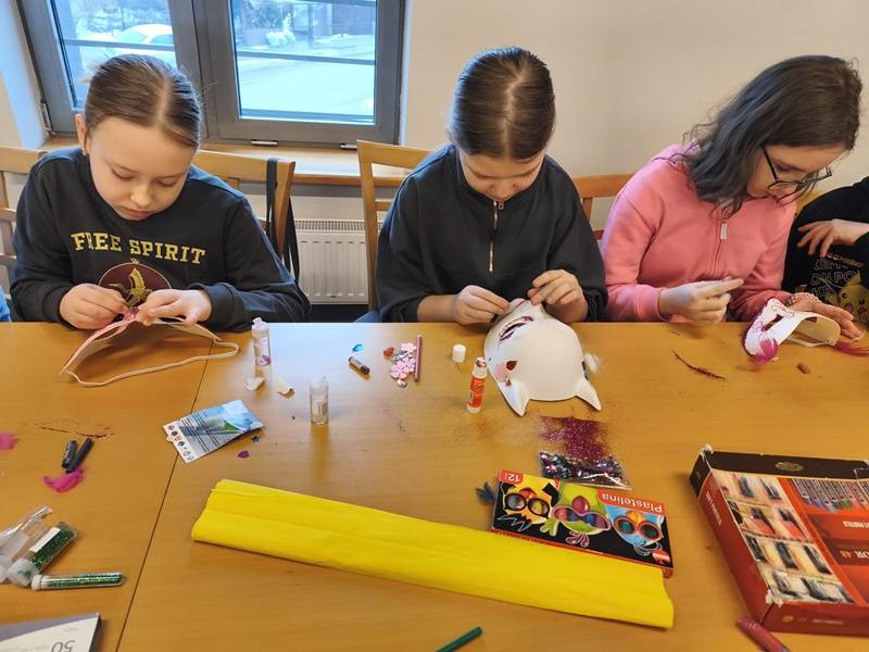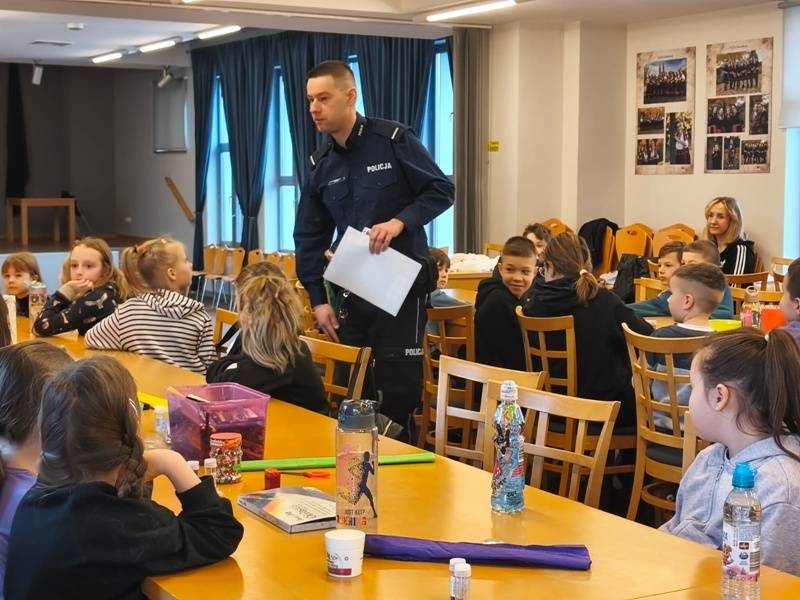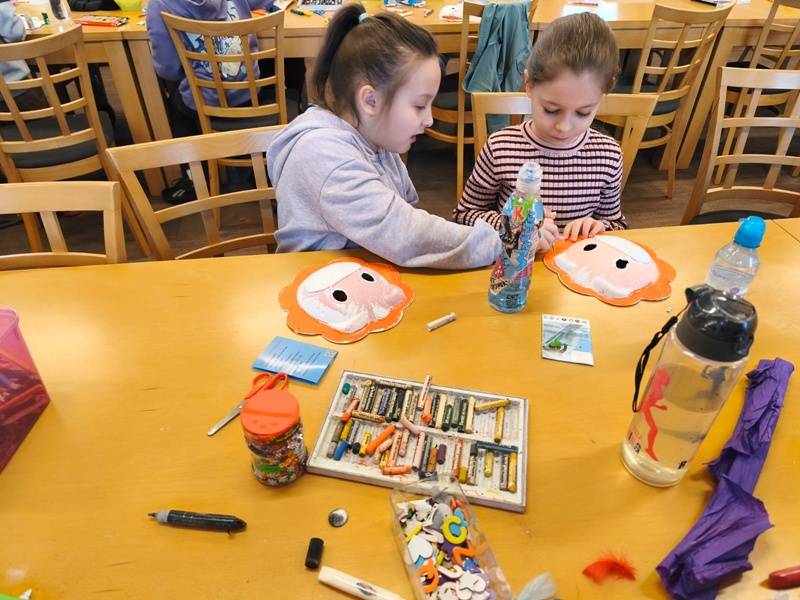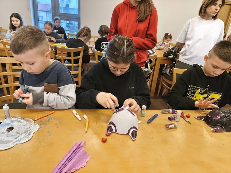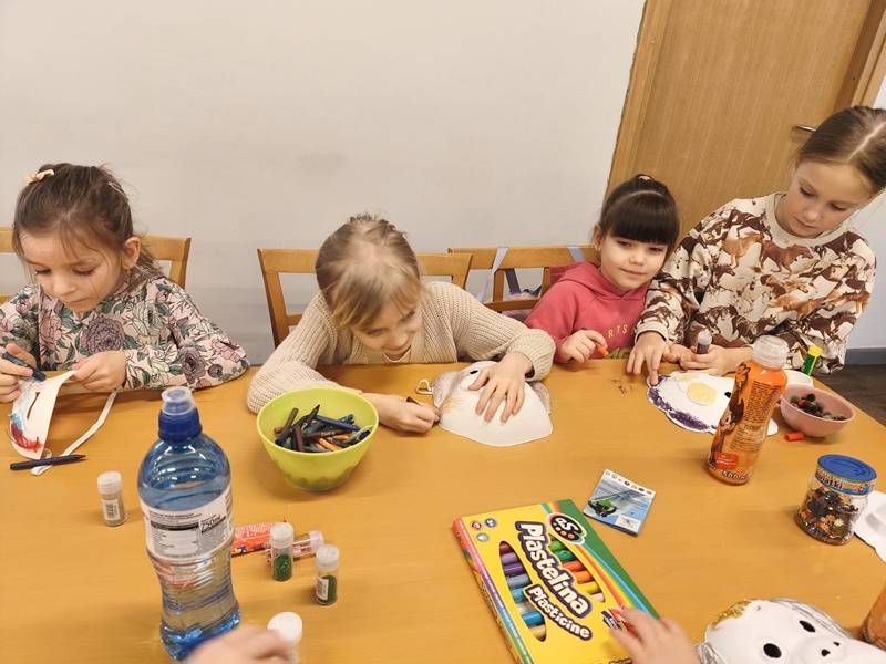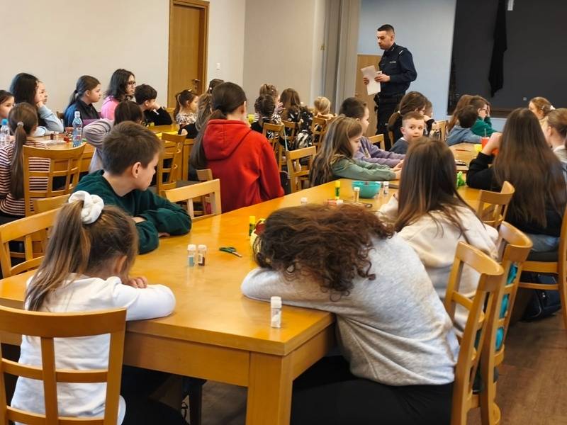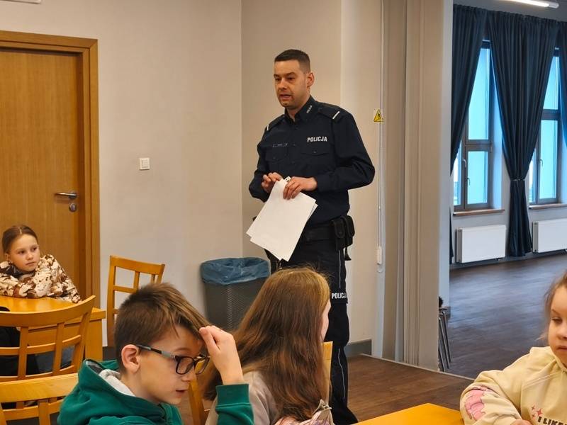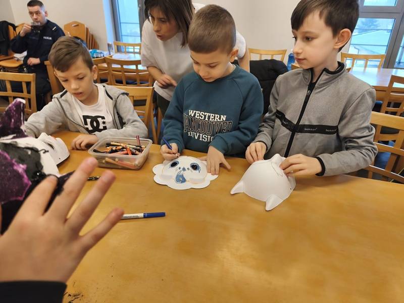 We wtorek z dziećmi, które biorą aktywny udział w „Feriach z Biblioteką” spotkał się starszy posterunkowy Łukasz Rak. Podczas spotkania rozmawiał z dziećmi o bezpieczeństwie w sieci oraz stosowaniu zasad bezpieczeństwa podczas codziennych aktywności. Następnie dzieci wzięły udział w kreatywnych zajęciach plastycznych projektowania, malowania i zdobienia masek karnawałowych.