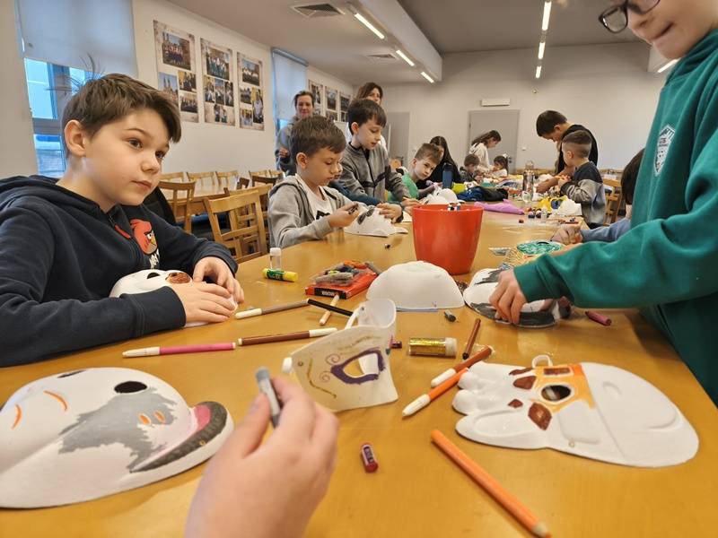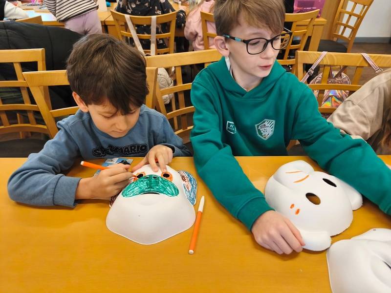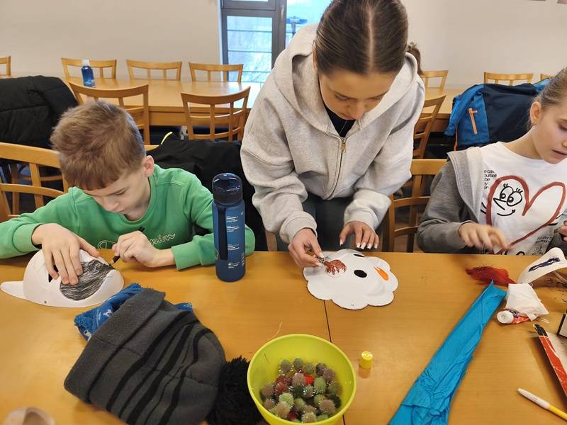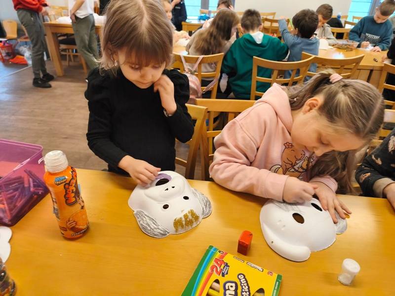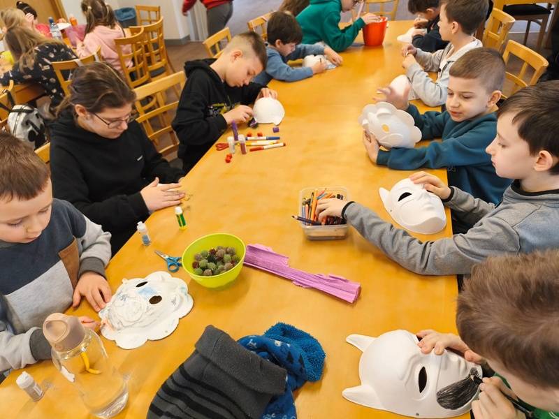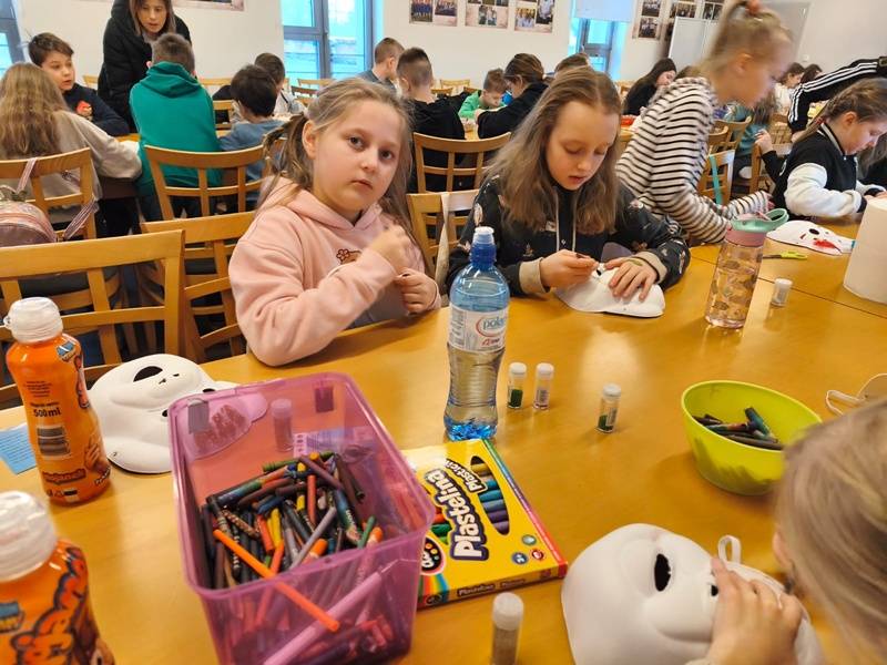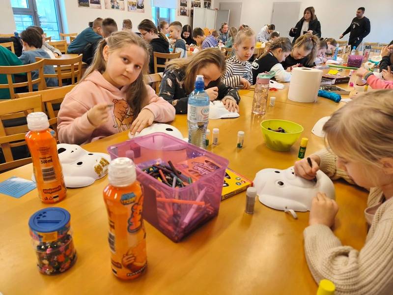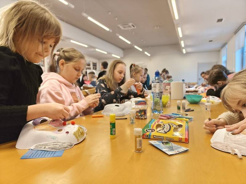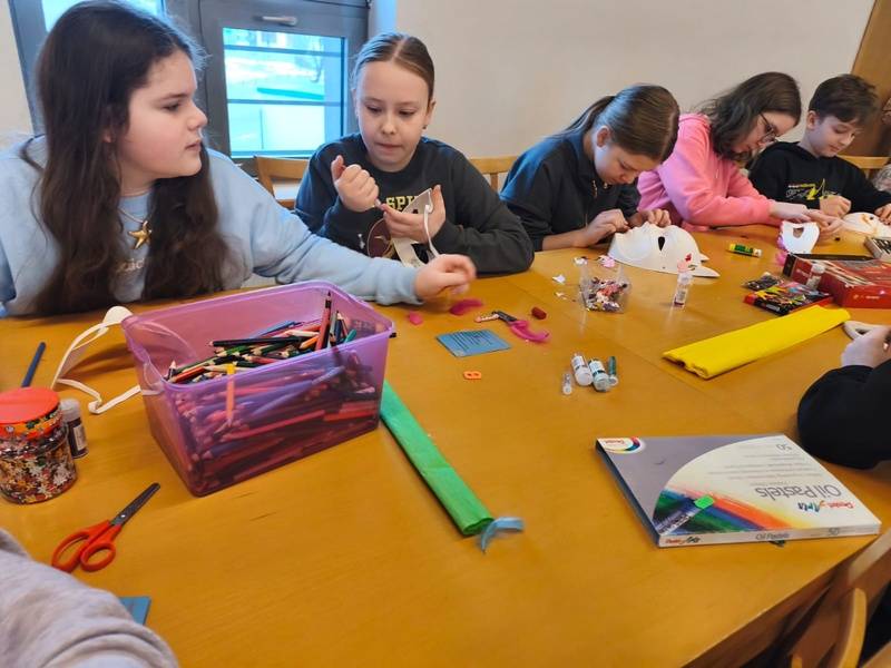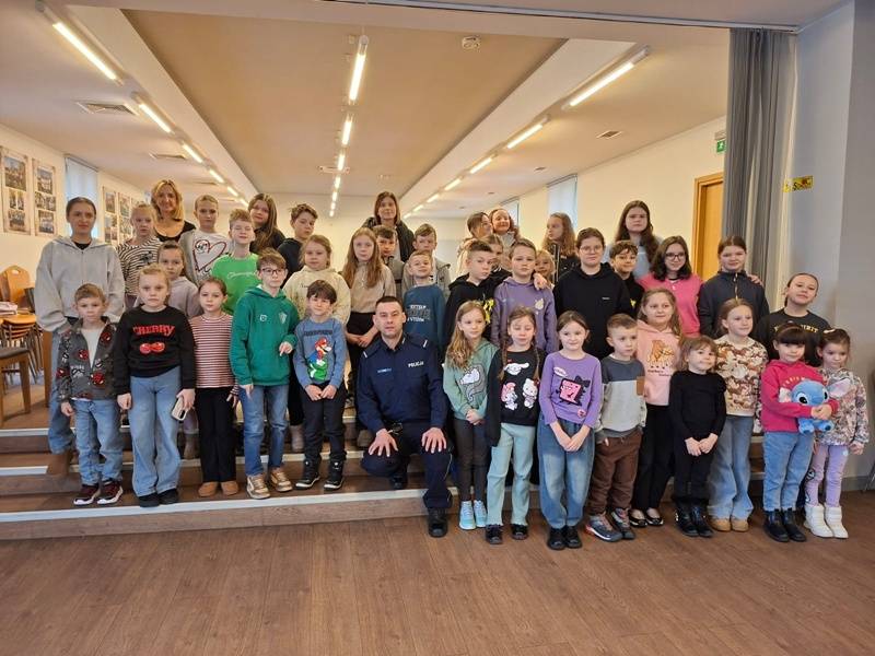We wtorek z dziećmi, które biorą aktywny udział w „Feriach z Biblioteką” spotkał się starszy posterunkowy Łukasz Rak. Podczas spotkania rozmawiał z dziećmi o bezpieczeństwie w sieci oraz stosowaniu zasad bezpieczeństwa podczas codziennych aktywności. Następnie dzieci wzięły udział w kreatywnych zajęciach plastycznych projektowania, malowania i zdobienia masek karnawałowych.