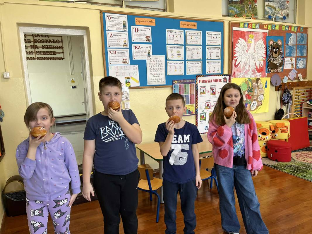 Dziś w Szkole Podstawowej w Krzemieniewicach zrobiło się wyjątkowo słodko! Z okazji Tłustego Czwartku Pani Przewodnicząca Ewelina Włodarczyk przekazała uczniom pyszne pączki, które zostały ufundowane przez Radę Rodziców SP Krzemieniewice. Ich zapach unosił się na szkolnych korytarzach, wywołując uśmiech na twarzach dzieci.