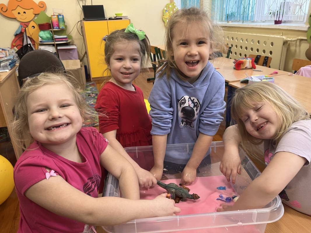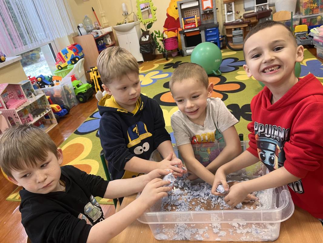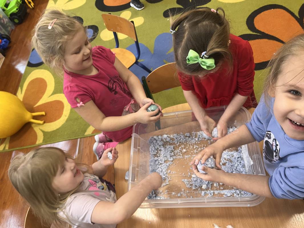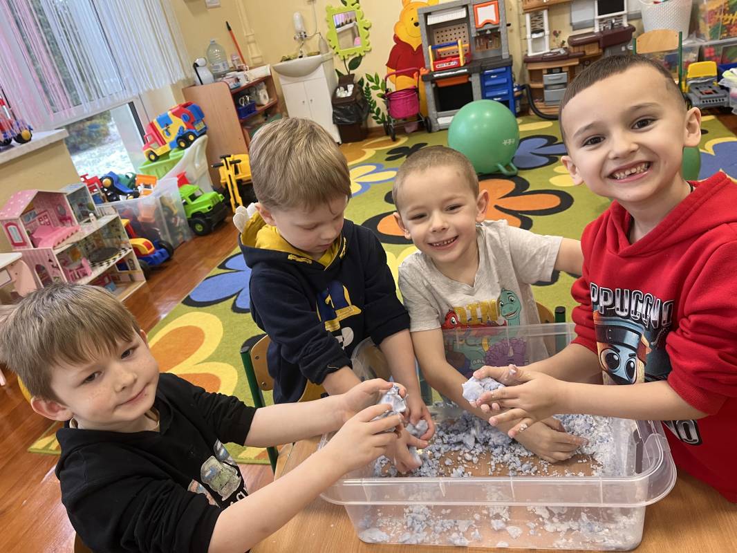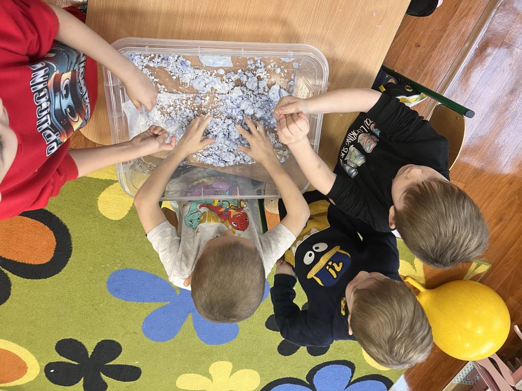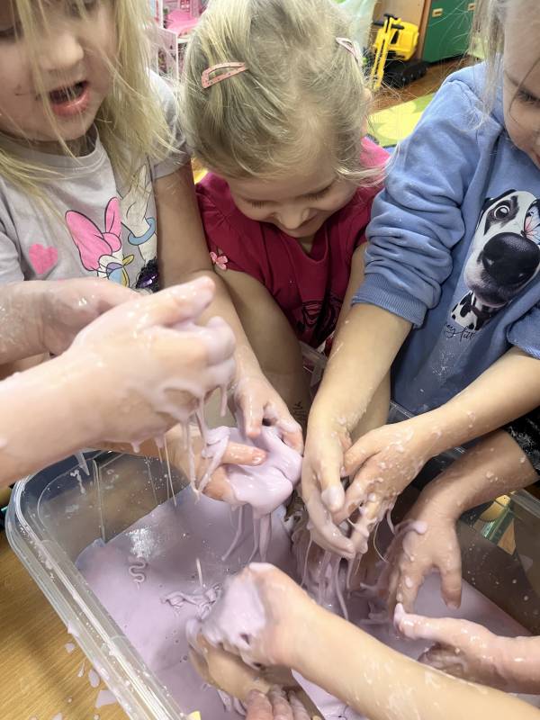 W dniu 18 lutego 2025r przedszkolaki Szkoły Podstawowej w Krzemieniewicach bawiły się masami sensorycznymi w postaci ciepłego śniegu i cieczy nienewtonowskiej.