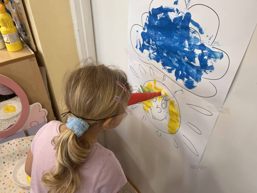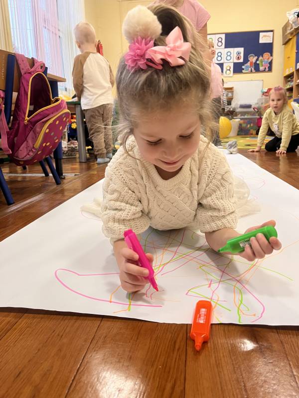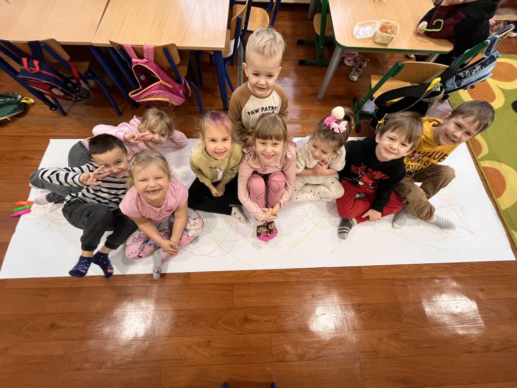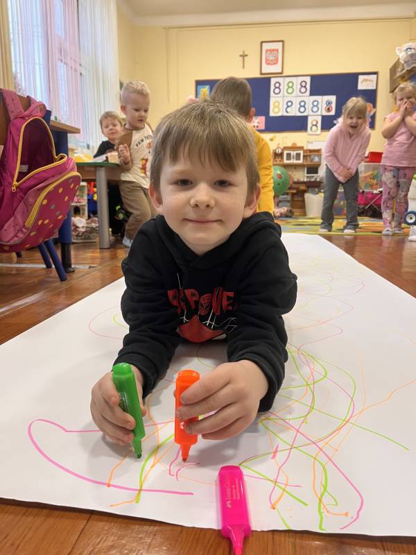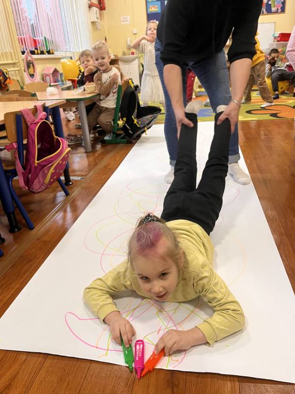 W związku z powyższym na zajęciach przedszkolaki bawiły się, malując obrazy przy wykorzystaniu własnego nosa. Drugim sposobem były zabawy na arkuszu długiego papieru z mazakami w dłoniach. Efektem tych niecodziennych ćwiczeń było powstanie ciekawych prac plastycznych.