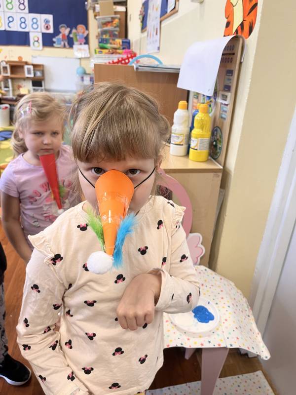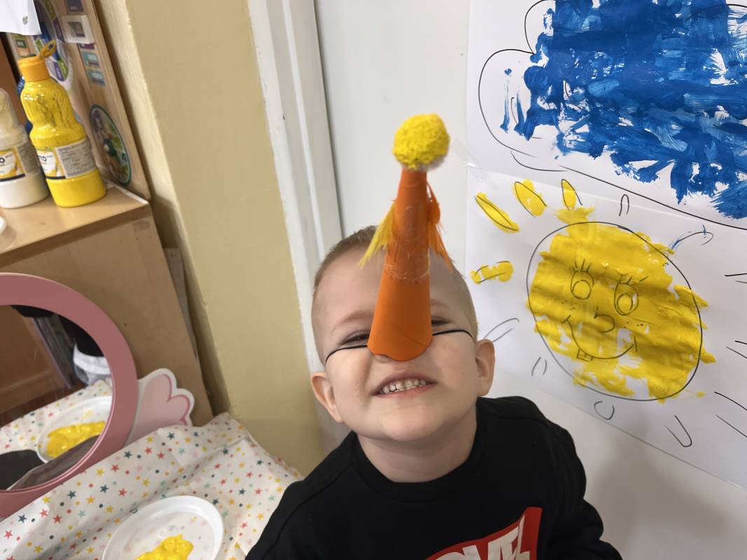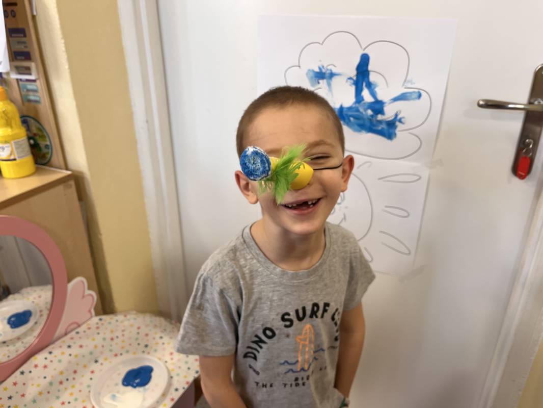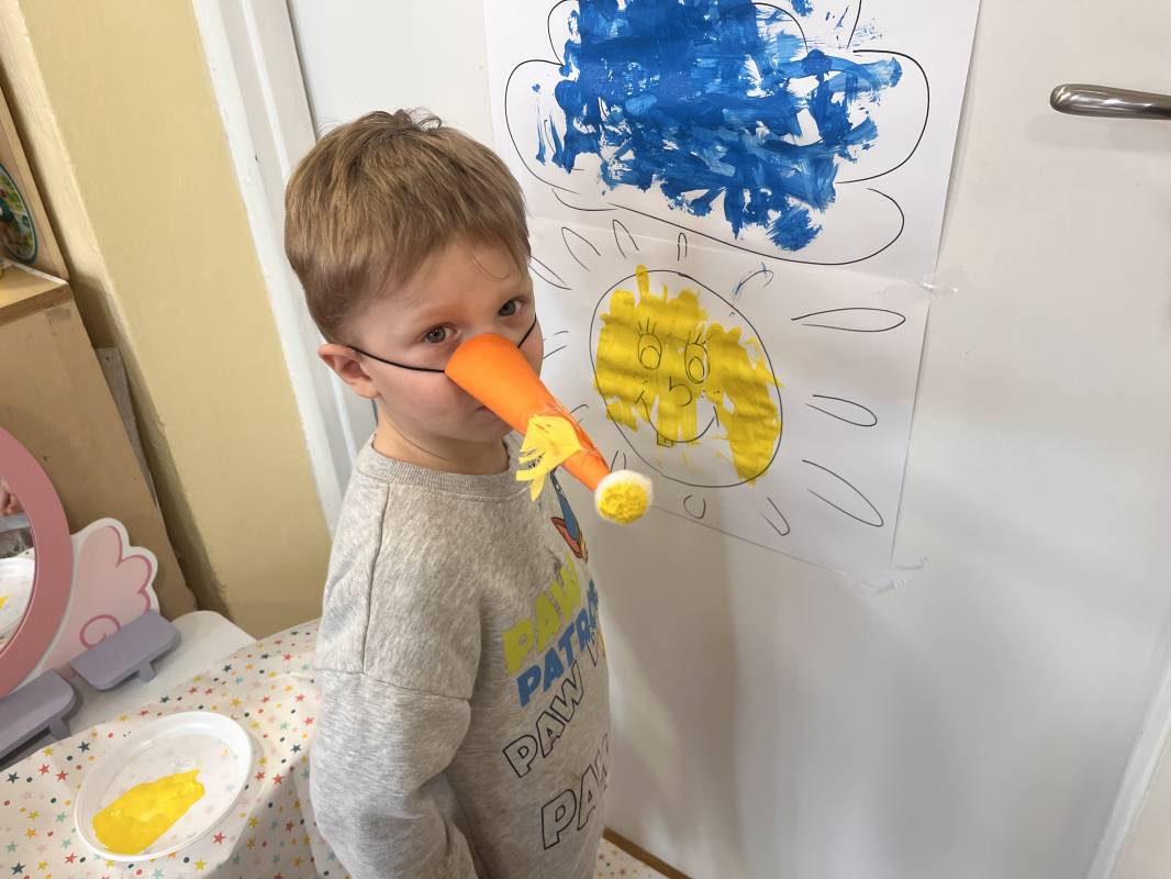 W związku z powyższym na zajęciach przedszkolaki bawiły się, malując obrazy przy wykorzystaniu własnego nosa. Drugim sposobem były zabawy na arkuszu długiego papieru z mazakami w dłoniach. Efektem tych niecodziennych ćwiczeń było powstanie ciekawych prac plastycznych.