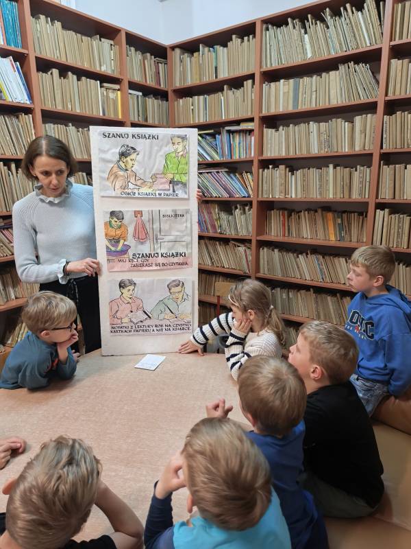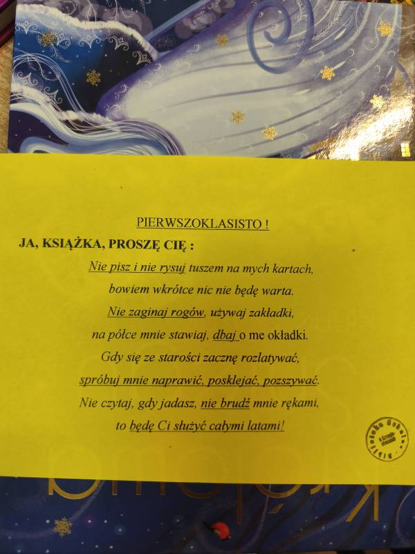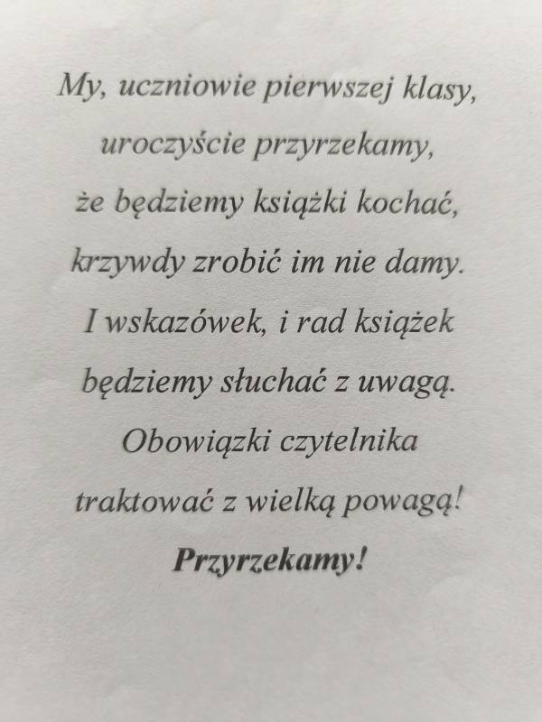 Koniec marca to dobry czas na wizytę pierwszaków w bibliotece szkolnej. Uczniowie znają już prawie cały alfabet i coraz lepiej radzą sobie z czytaniem, czyli śmiało można pasować ich na czytelników - oficjalnie przyjąć do grona czytających! Wydarzenie to na stałe zapisało się w kalendarzu naszych uroczystości szkolnych. Pierwszoklasiści wraz z wychowawcą uczestniczyli w lekcji, która przybliżyła im zasady zachowania w bibliotece oraz korzyści wynikające z czytania. Dzieci poznały regulamin biblioteki, dowiedziały się, jak należy dbać o książki oraz czego nie wolno robić podczas czytania. Po takim wprowadzeniu złożyły uroczyste przyrzeczenie, że będą czytać i szanować książki oraz korzystać z ich rad i mądrości. Następnie pani bibliotekarka założyła wszystkim karty czytelnika, aby każdy mógł samodzielnie wypożyczyć swoją pierwszą książeczkę. Na pamiątkę wydarzenia najmłodsi czytelnicy otrzymali także wyprawkę czytelniczą podarowaną przez Instytut Książki w ramach ogólnopolskiej kampanii „Mała książka – wielki człowiek”. Jest to projekt dofinansowany z budżetu państwa, który ma na celu promowanie czytelnictwa wśród dzieci w różnych grupach wiekowych. Do jego realizacji włączeni są też rodzice poprzez poradnik, jak wspierać dziecko w nauce czytania.