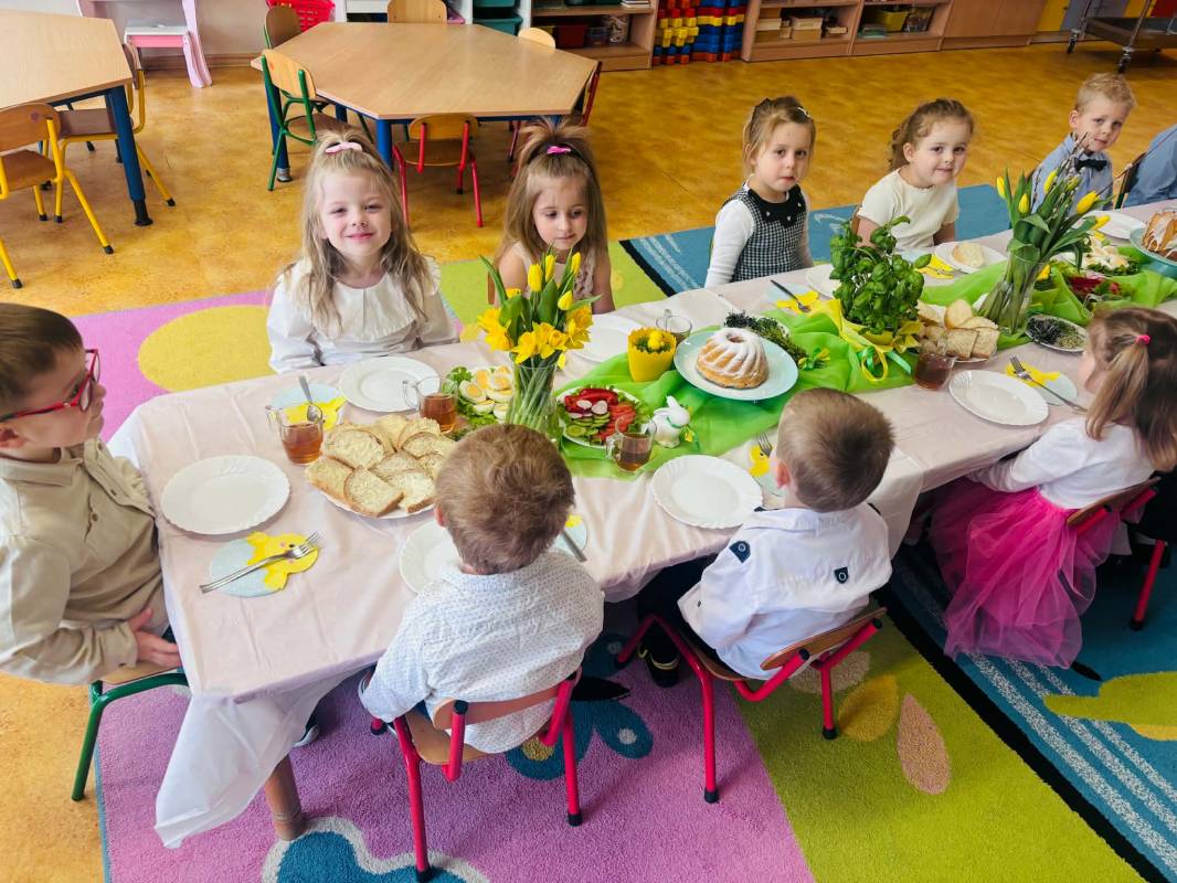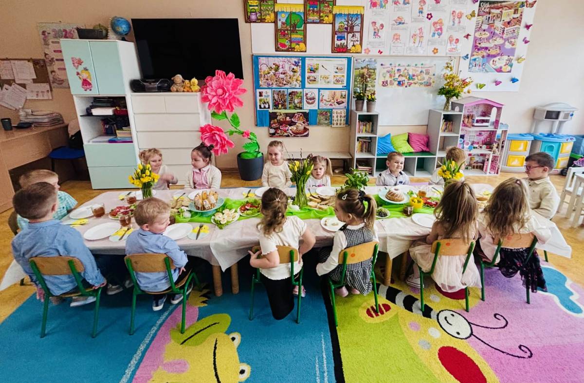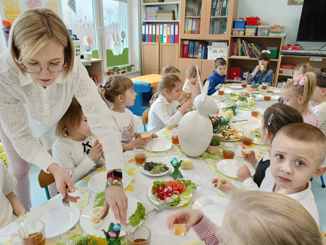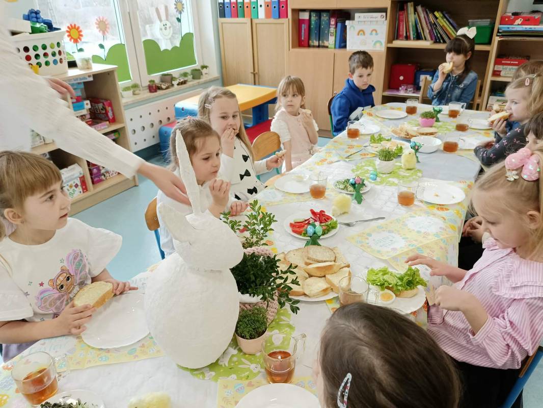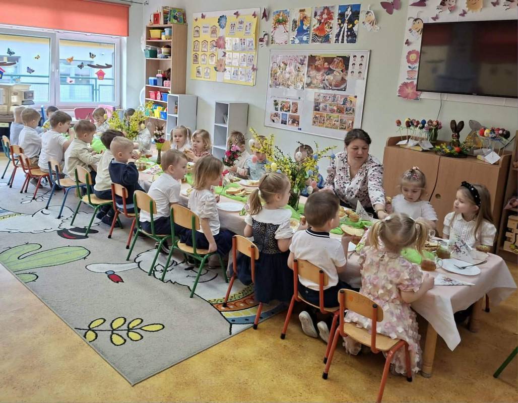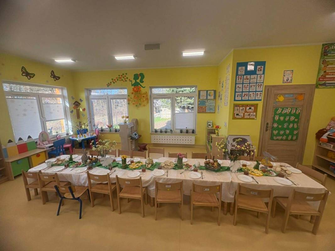 W naszym przedszkolu odbyło się uroczyste śniadanie wielkanocne, które wprowadziło wszystkich w radosny, świąteczny nastrój. Dzieci wspólnie z wychowawcami zasiadły do pięknie udekorowanych stołów w swoich salach, gdzie czekały na nie tradycyjne wielkanocne potrawy.