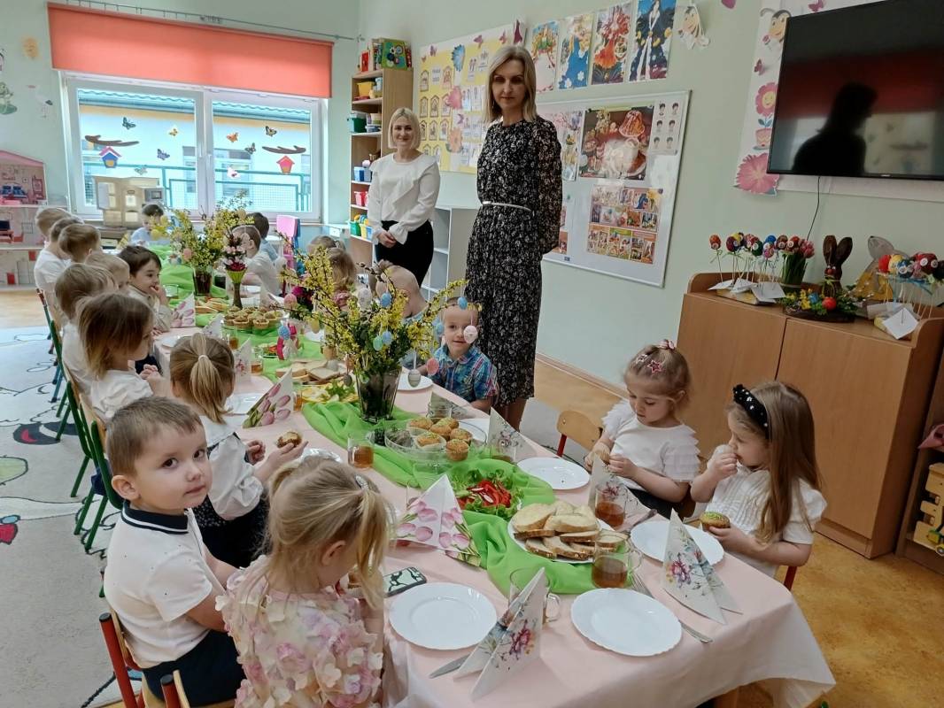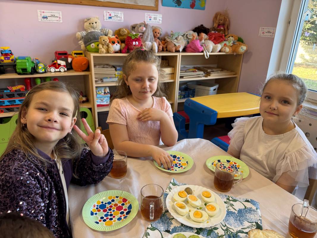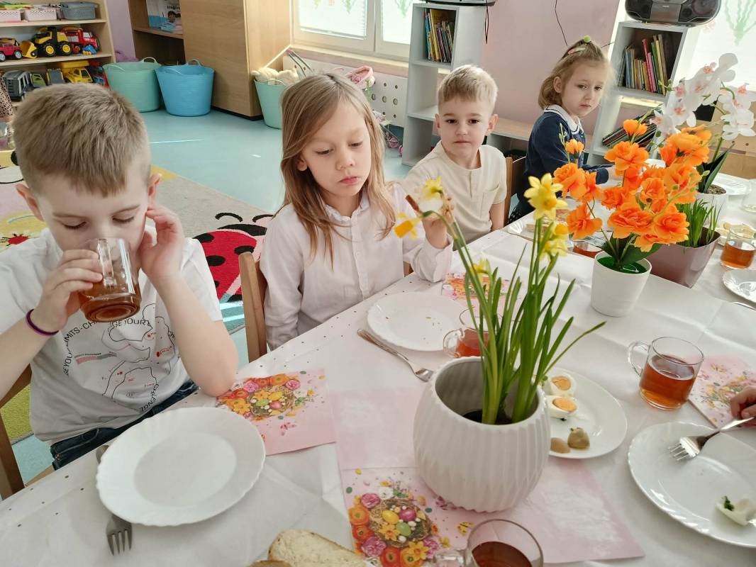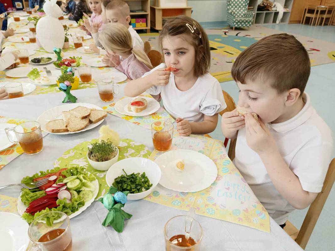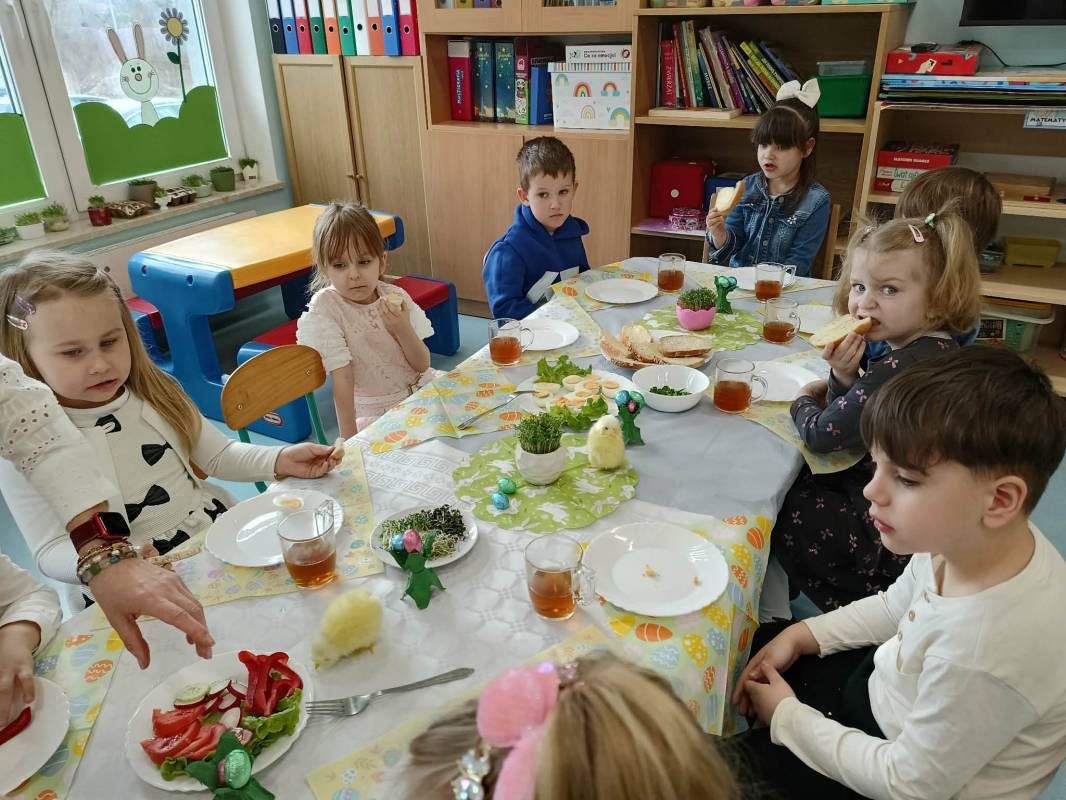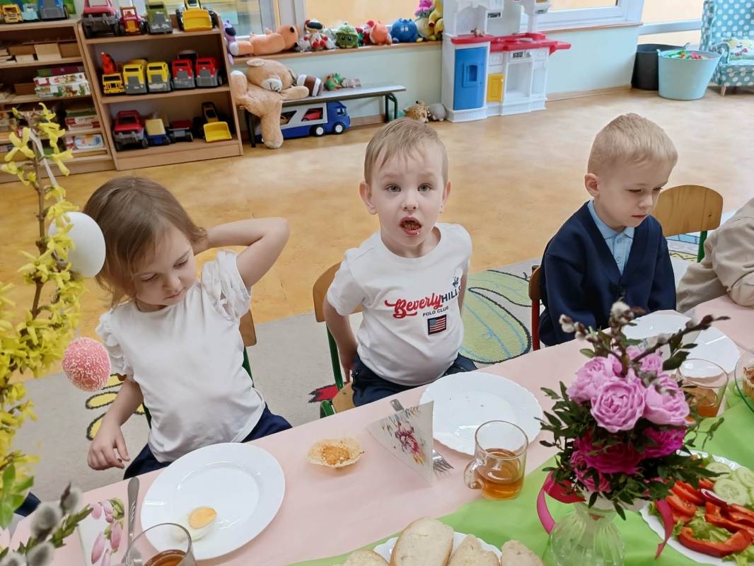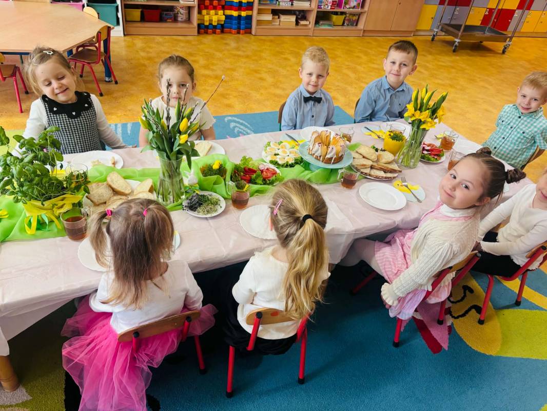 W naszym przedszkolu odbyło się uroczyste śniadanie wielkanocne, które wprowadziło wszystkich w radosny, świąteczny nastrój. Dzieci wspólnie z wychowawcami zasiadły do pięknie udekorowanych stołów w swoich salach, gdzie czekały na nie tradycyjne wielkanocne potrawy.