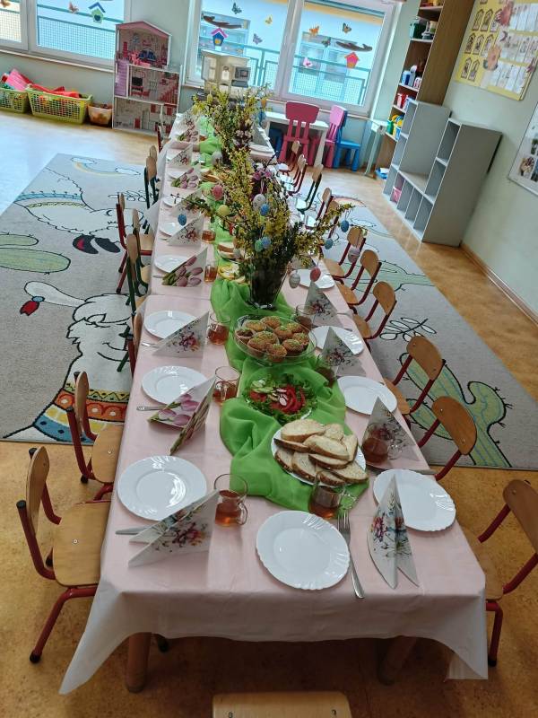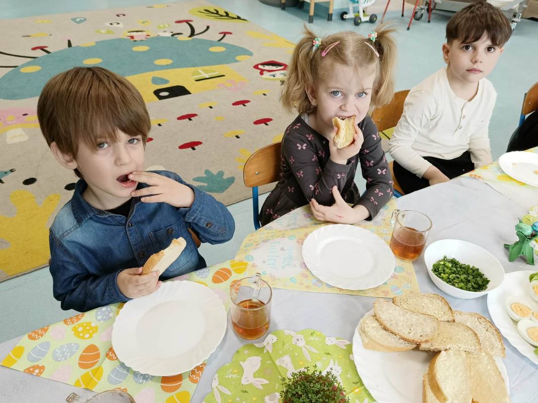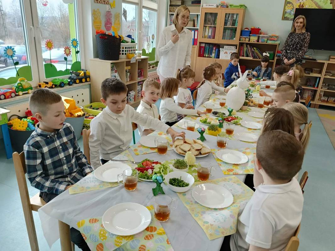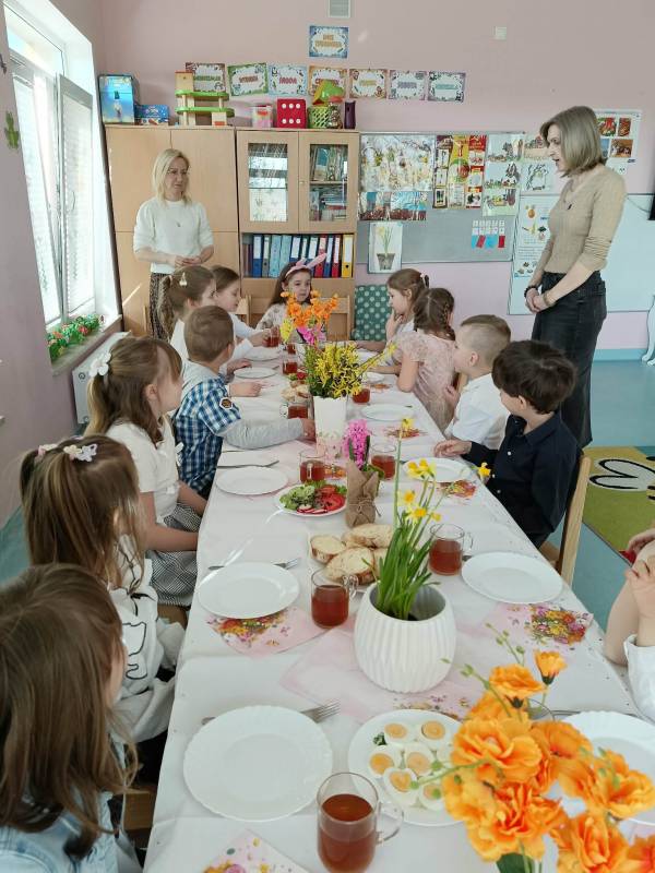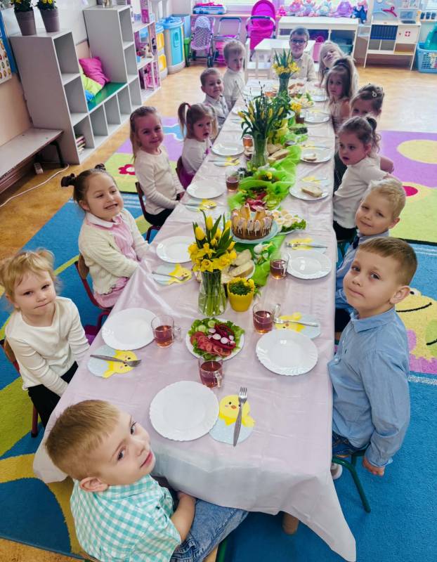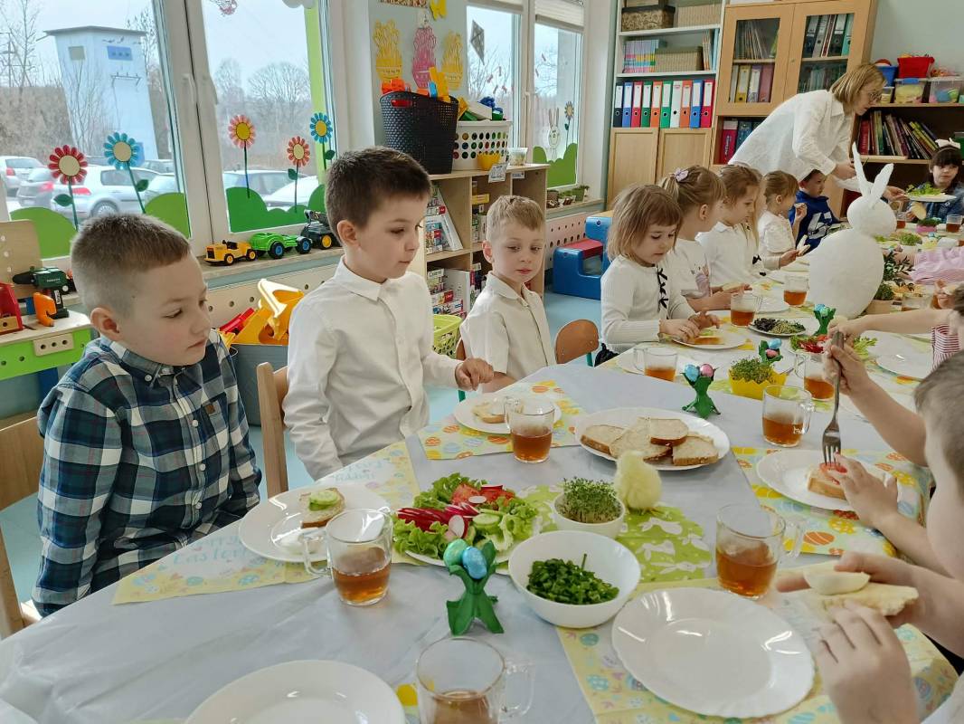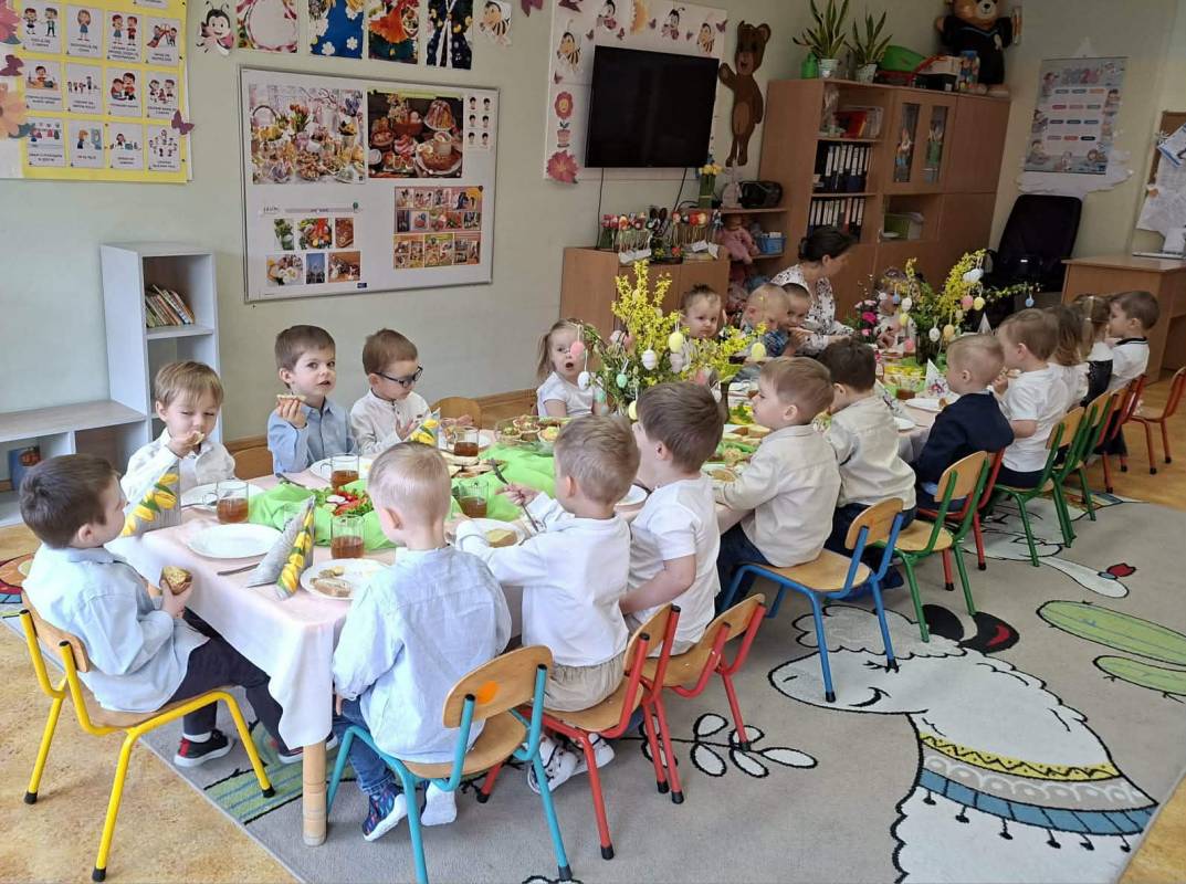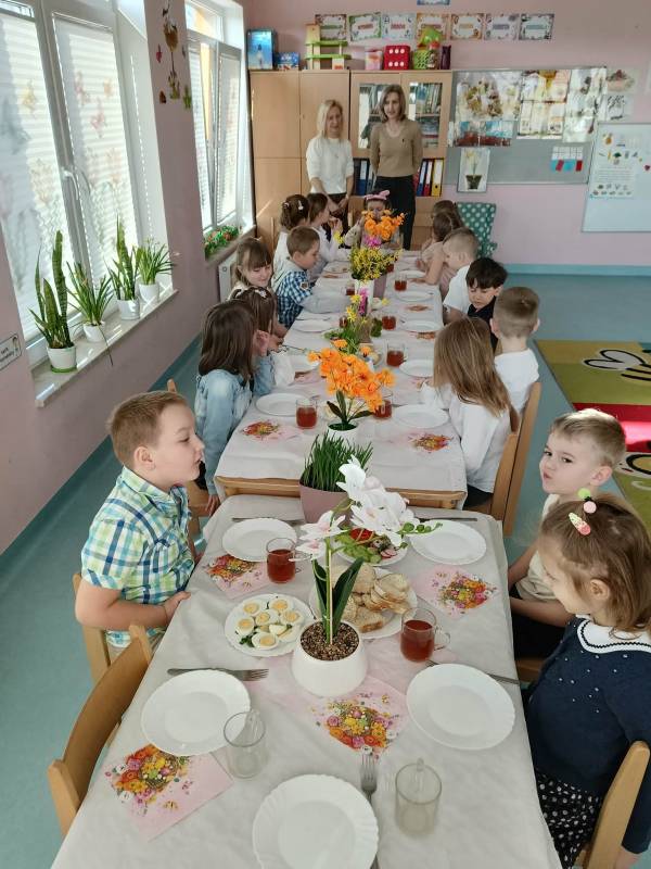 W naszym przedszkolu odbyło się uroczyste śniadanie wielkanocne, które wprowadziło wszystkich w radosny, świąteczny nastrój. Dzieci wspólnie z wychowawcami zasiadły do pięknie udekorowanych stołów w swoich salach, gdzie czekały na nie tradycyjne wielkanocne potrawy.