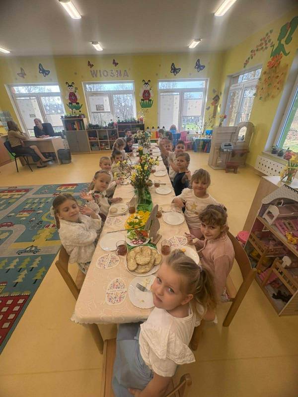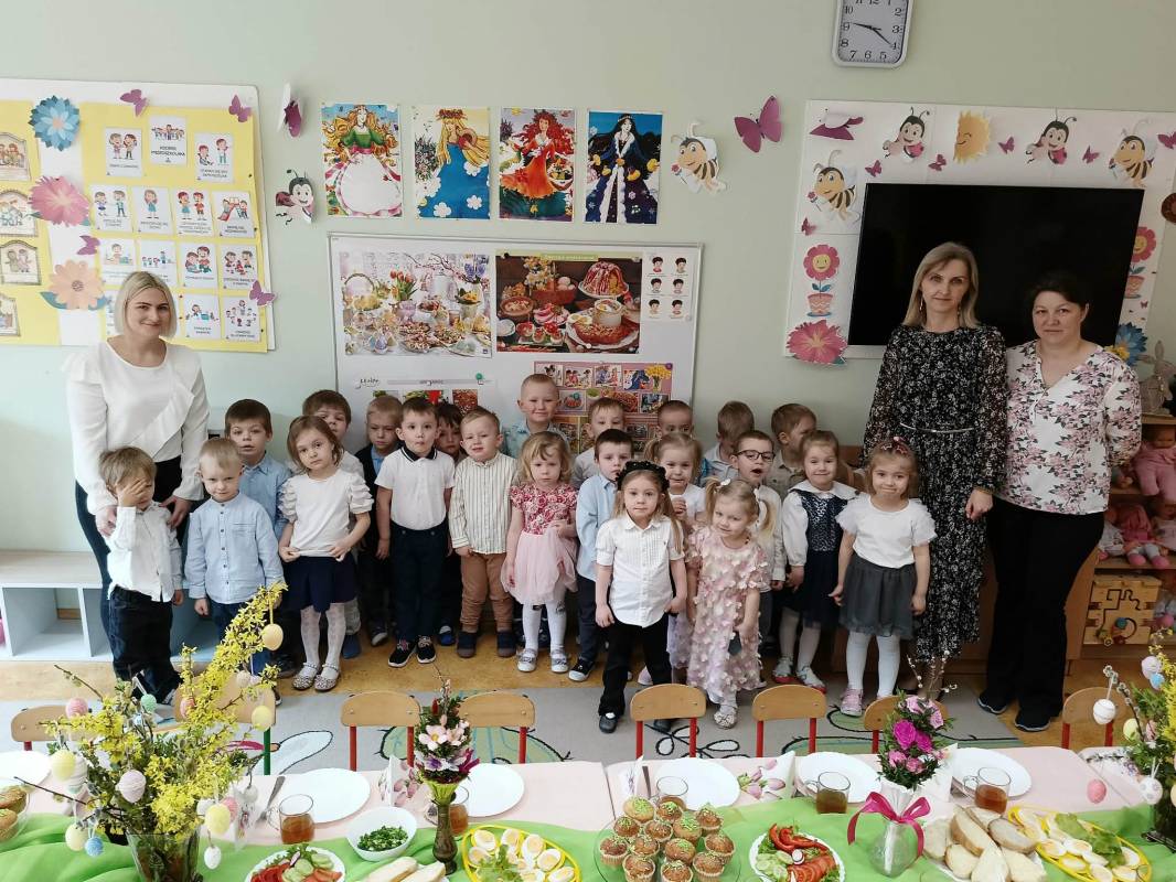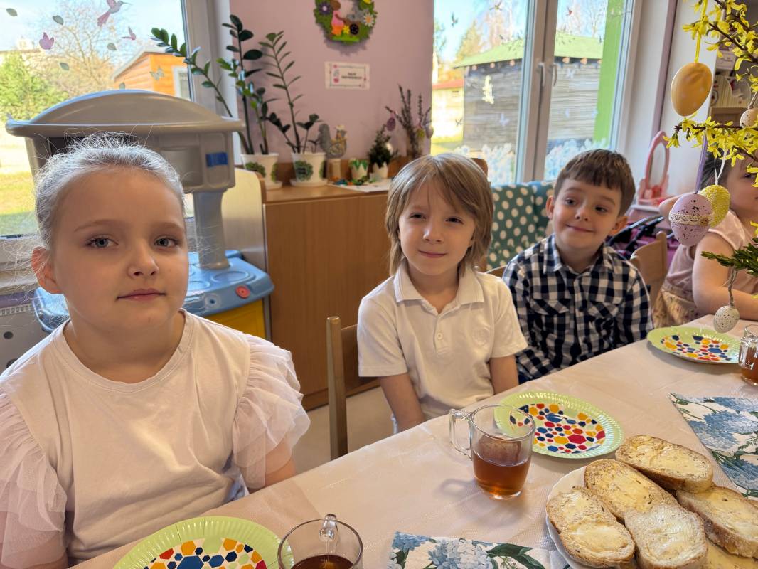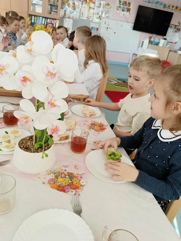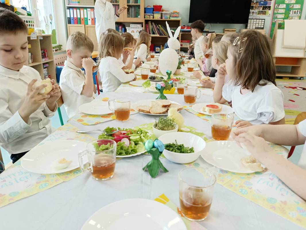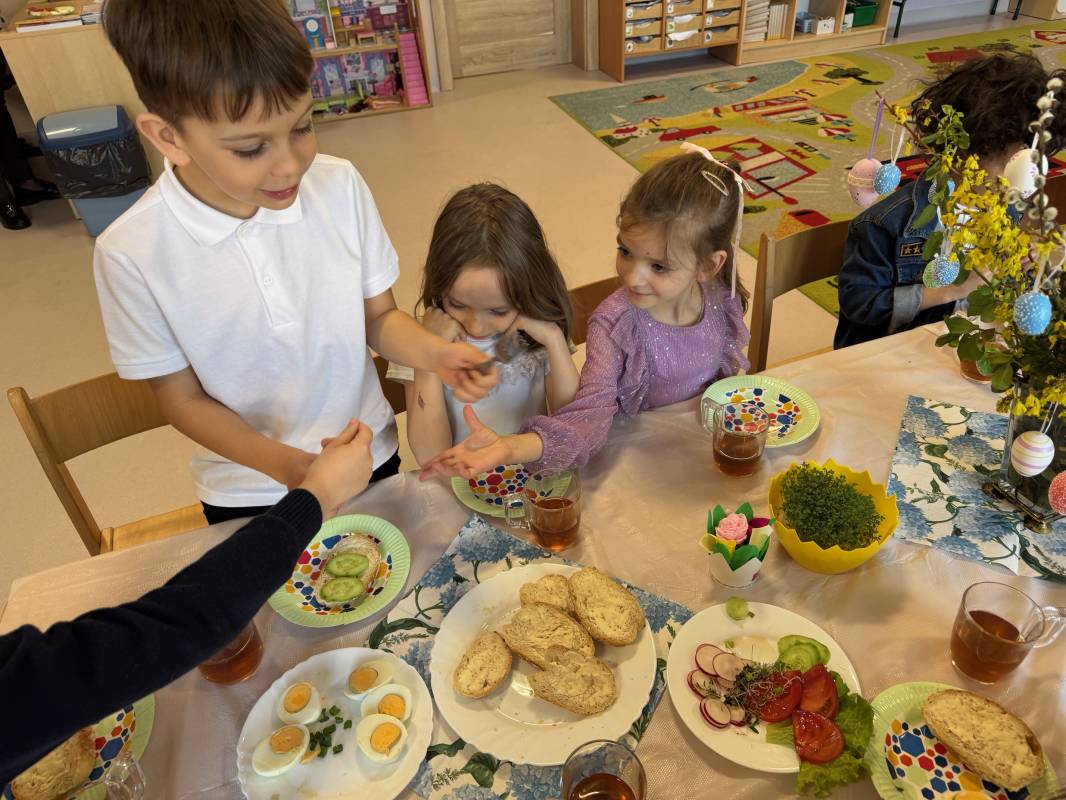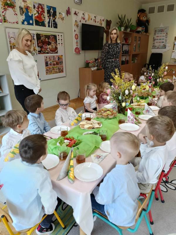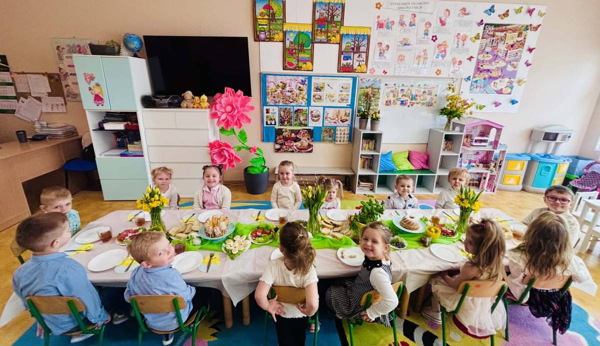 W naszym przedszkolu odbyło się uroczyste śniadanie wielkanocne, które wprowadziło wszystkich w radosny, świąteczny nastrój. Dzieci wspólnie z wychowawcami zasiadły do pięknie udekorowanych stołów w swoich salach, gdzie czekały na nie tradycyjne wielkanocne potrawy.
