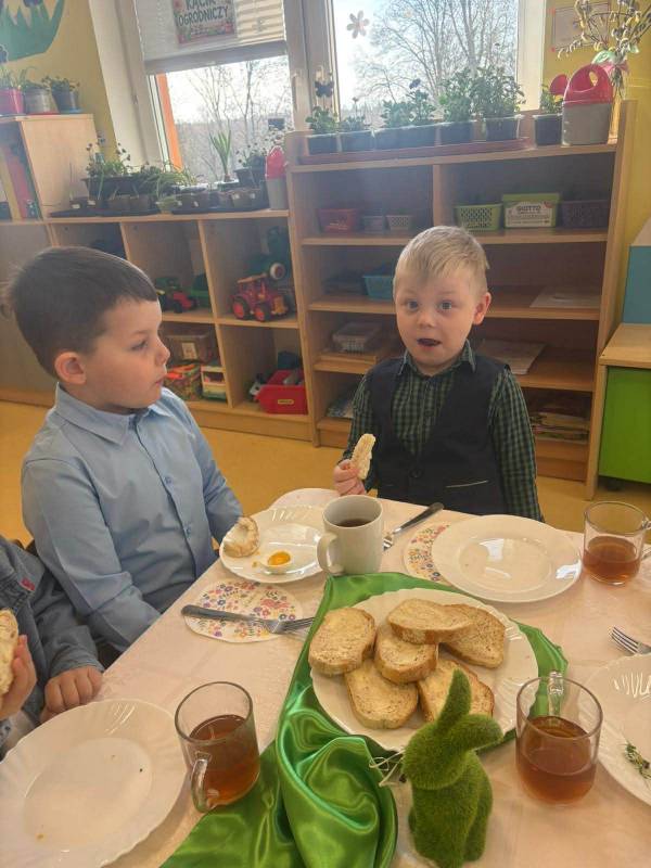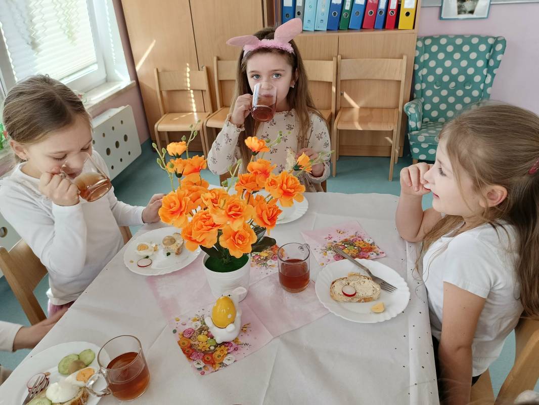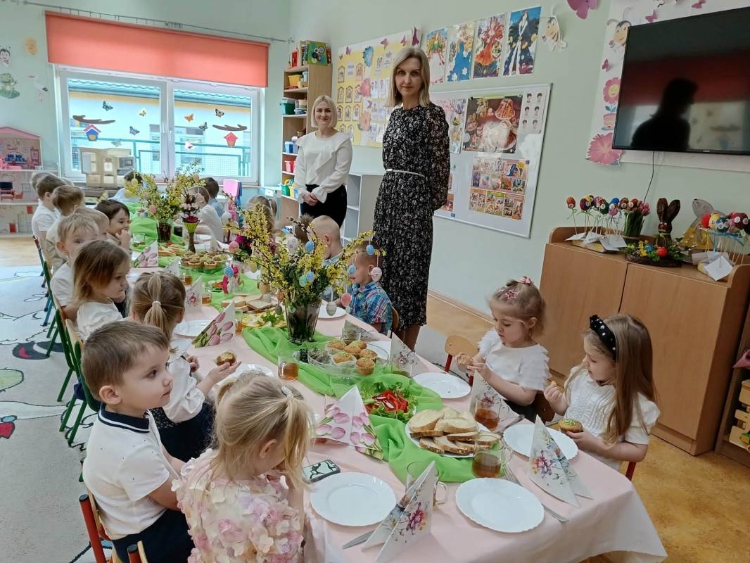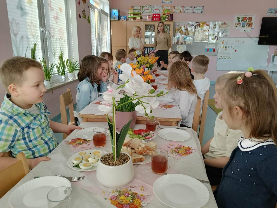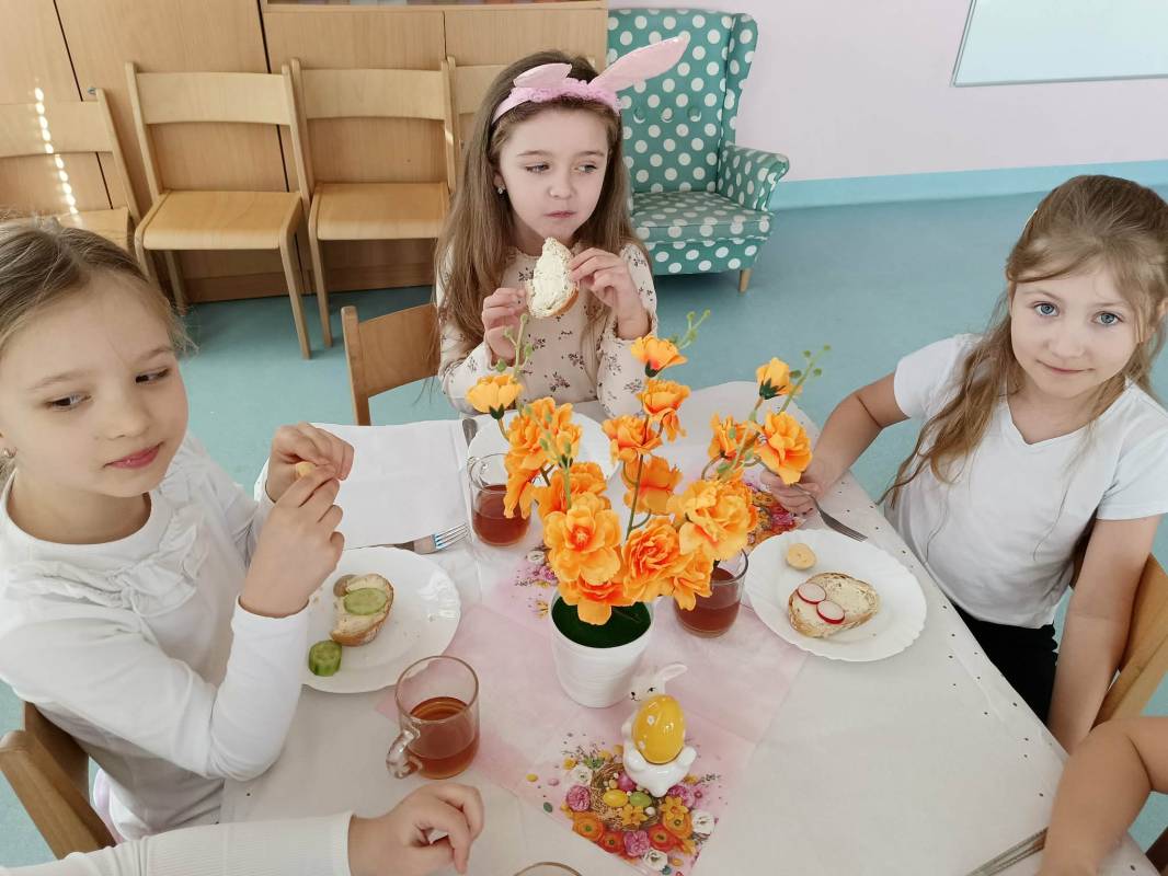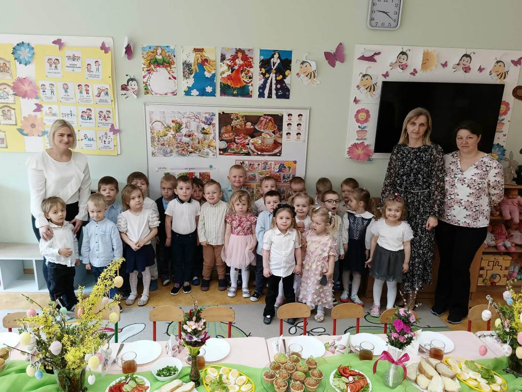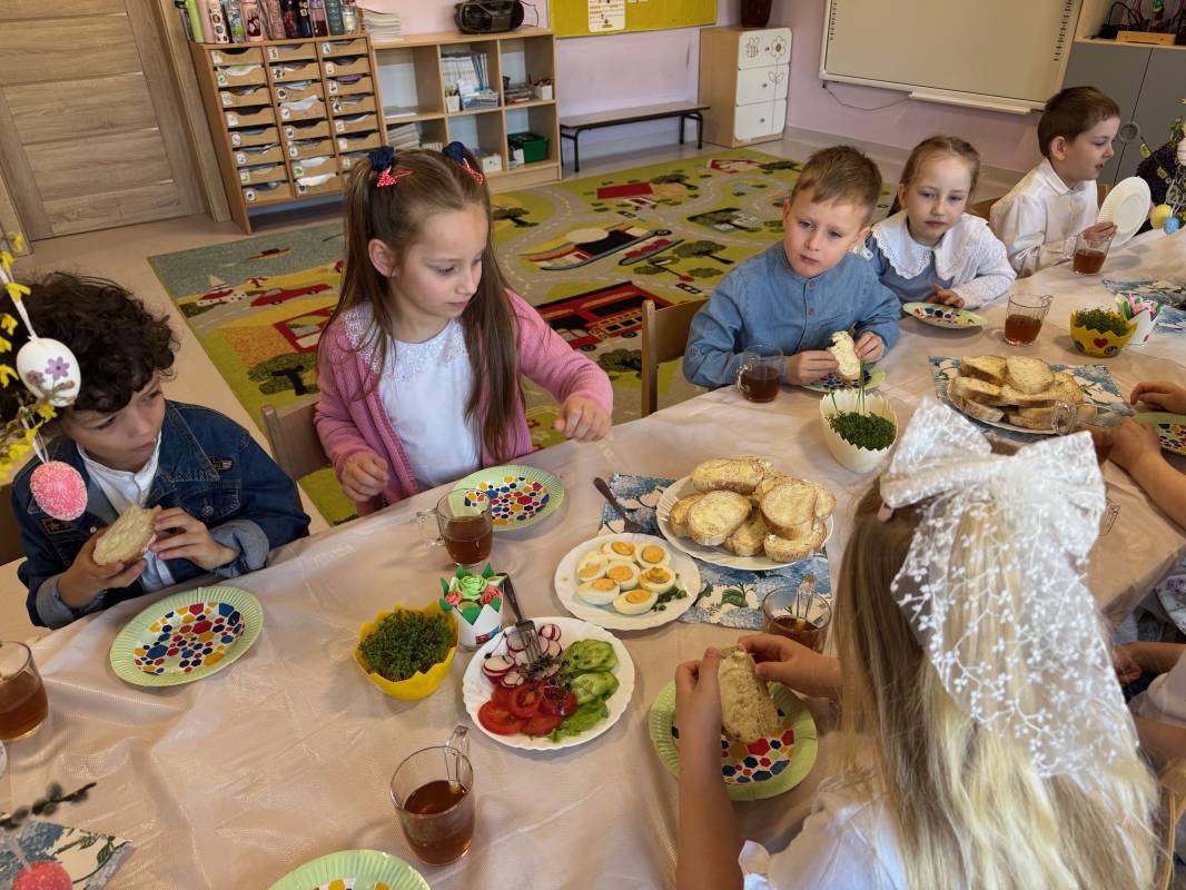W naszym przedszkolu odbyło się uroczyste śniadanie wielkanocne, które wprowadziło wszystkich w radosny, świąteczny nastrój. Dzieci wspólnie z wychowawcami zasiadły do pięknie udekorowanych stołów w swoich salach, gdzie czekały na nie tradycyjne wielkanocne potrawy.