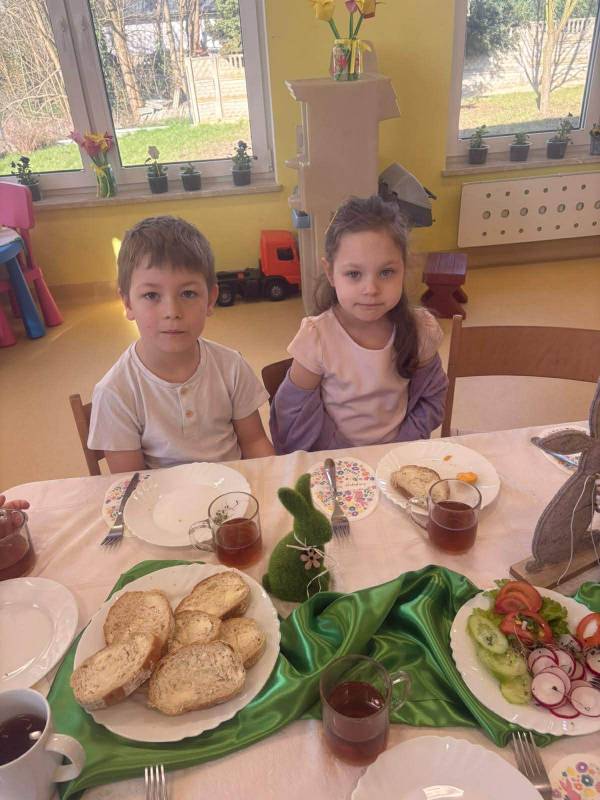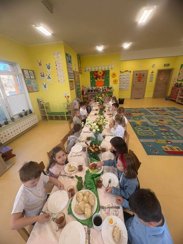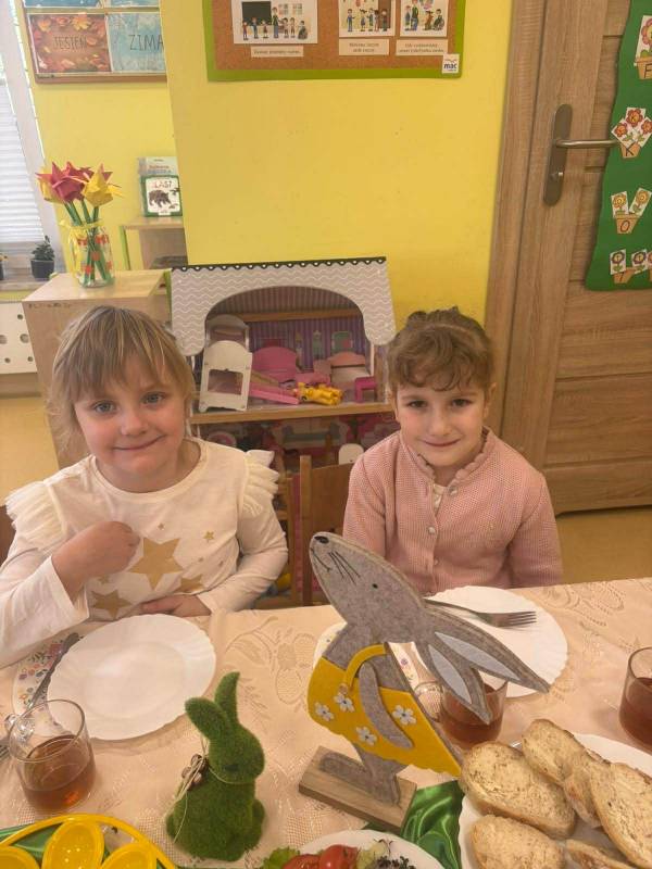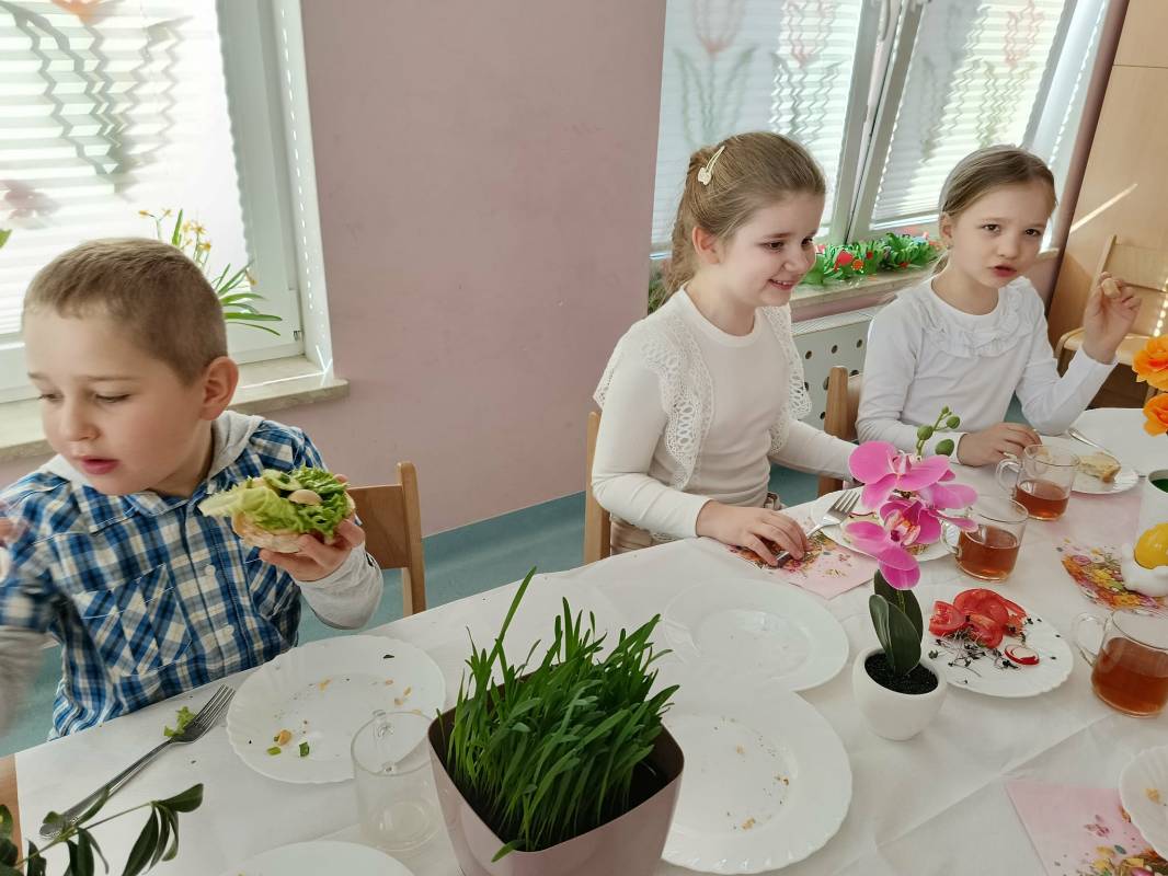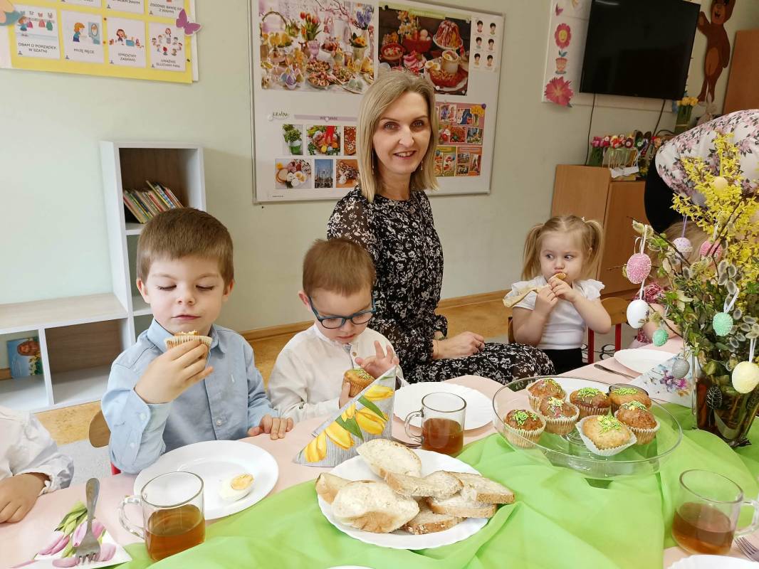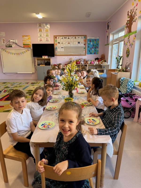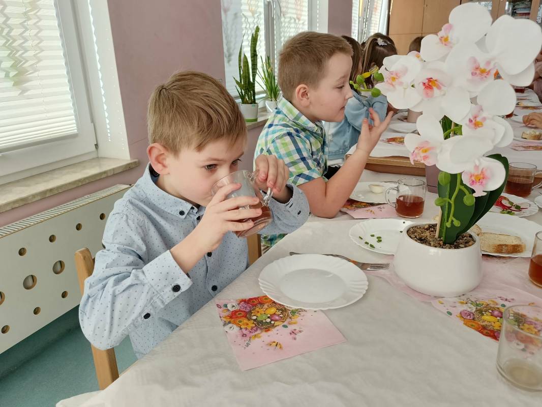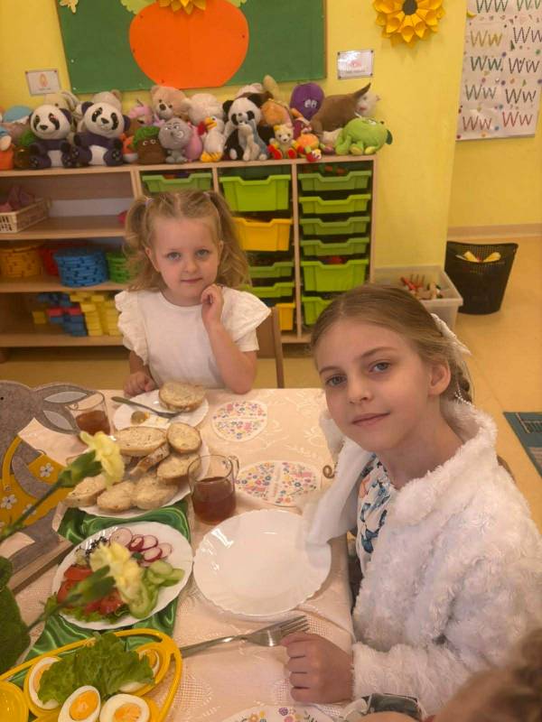 W naszym przedszkolu odbyło się uroczyste śniadanie wielkanocne, które wprowadziło wszystkich w radosny, świąteczny nastrój. Dzieci wspólnie z wychowawcami zasiadły do pięknie udekorowanych stołów w swoich salach, gdzie czekały na nie tradycyjne wielkanocne potrawy.