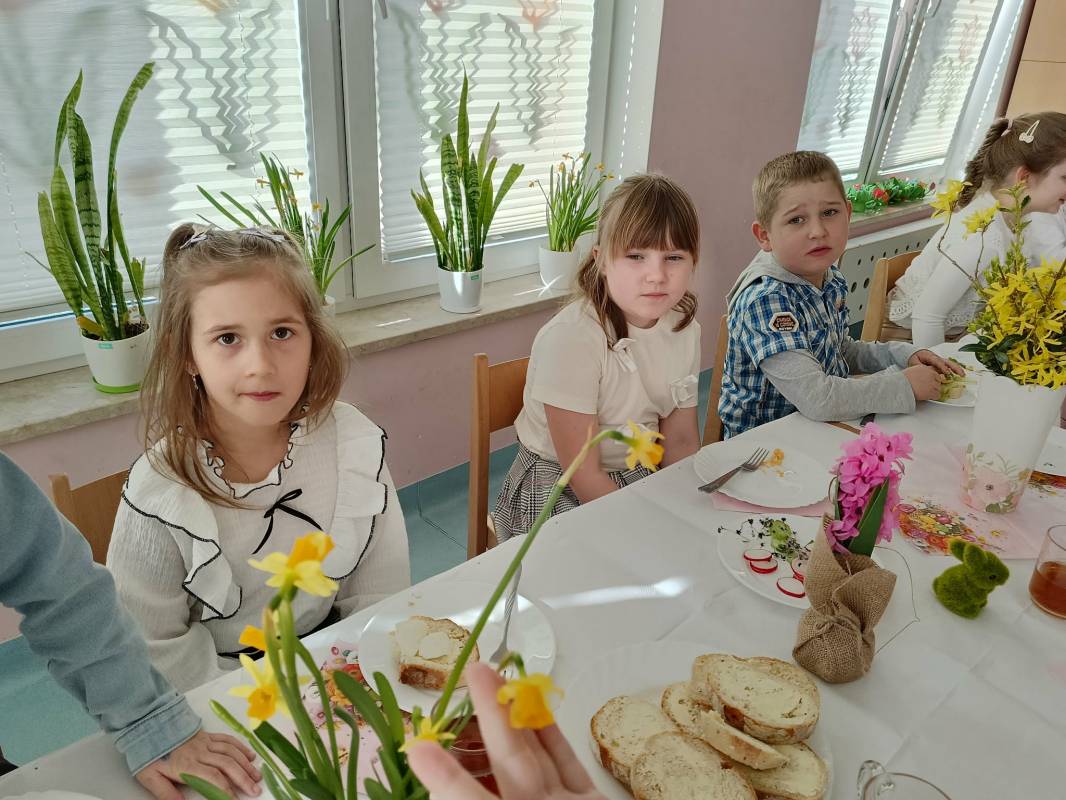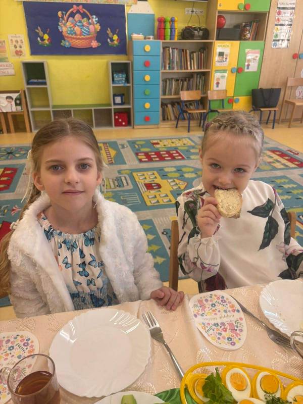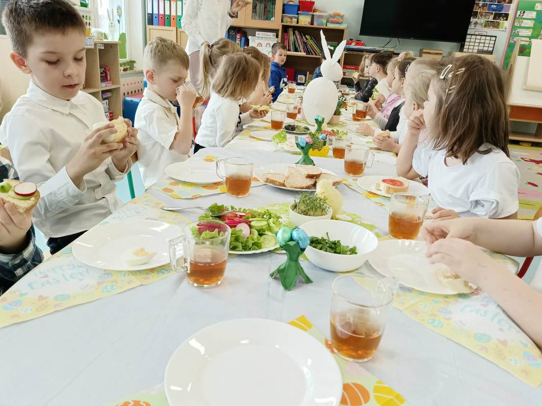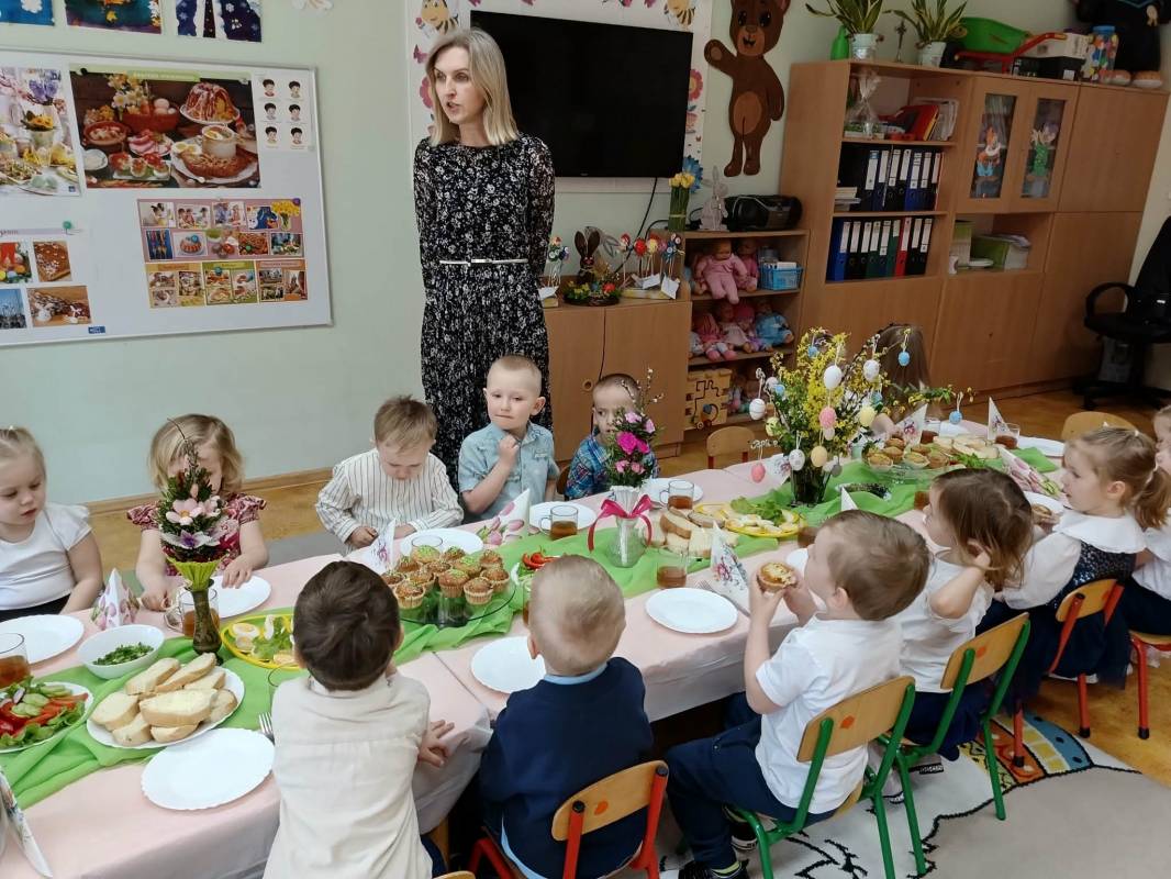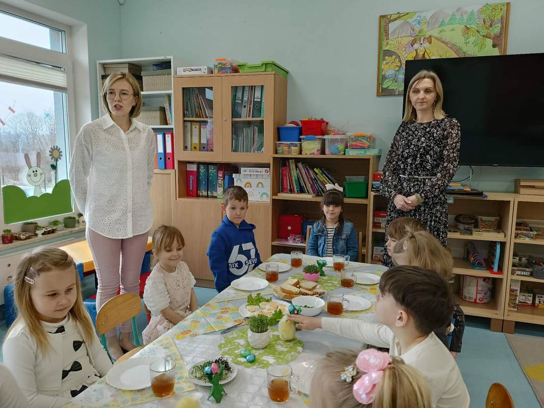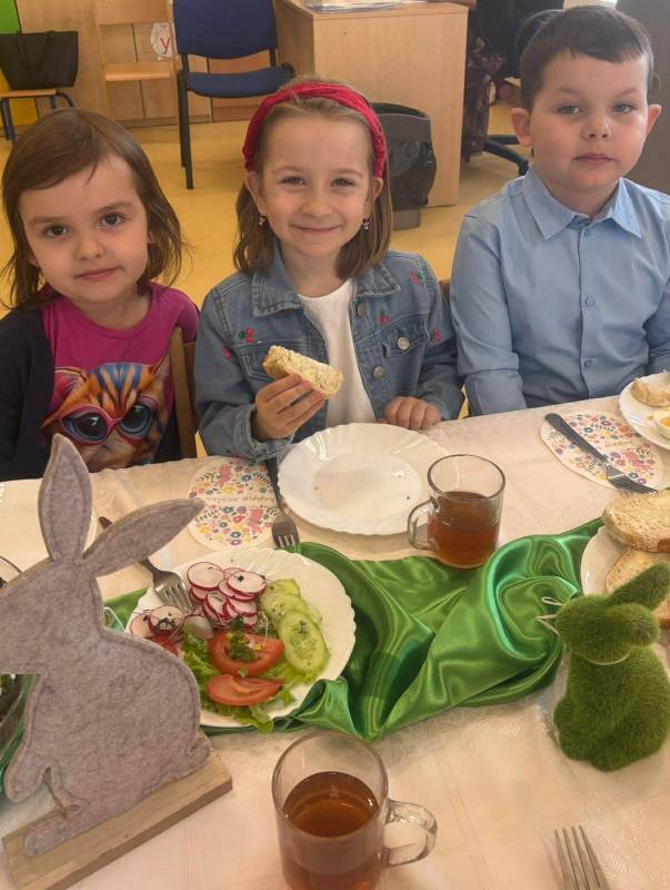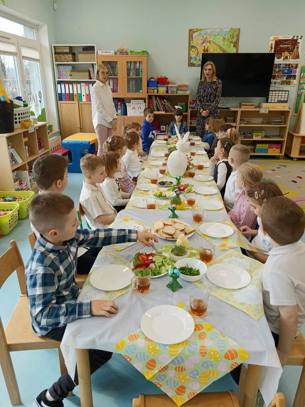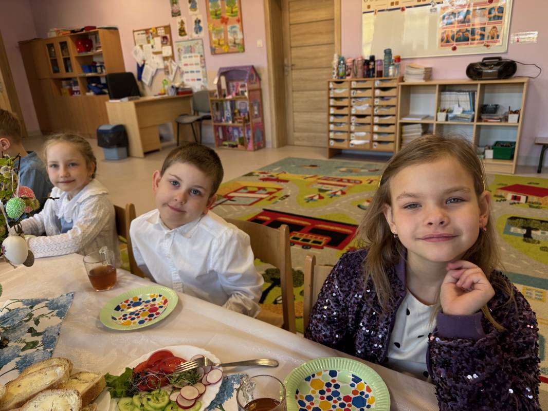W naszym przedszkolu odbyło się uroczyste śniadanie wielkanocne, które wprowadziło wszystkich w radosny, świąteczny nastrój. Dzieci wspólnie z wychowawcami zasiadły do pięknie udekorowanych stołów w swoich salach, gdzie czekały na nie tradycyjne wielkanocne potrawy.