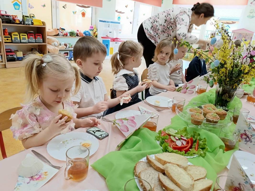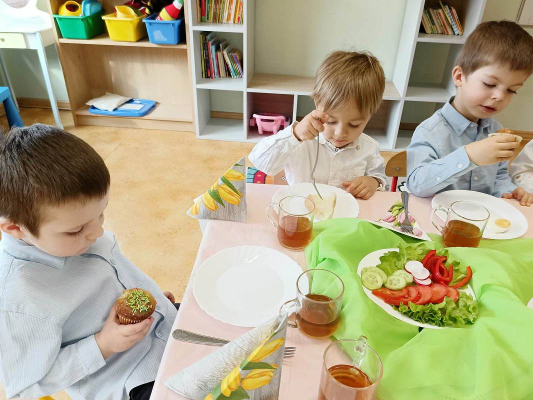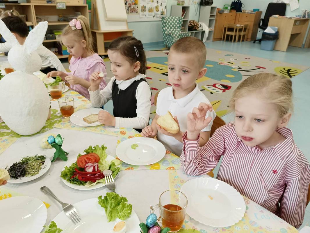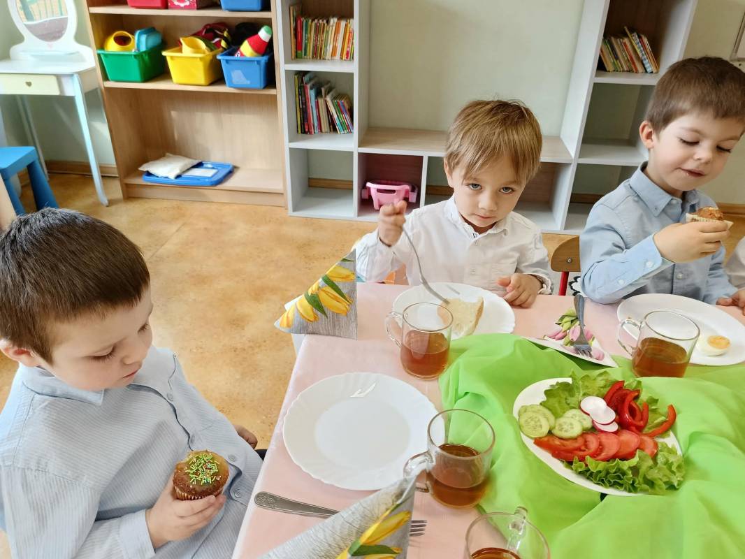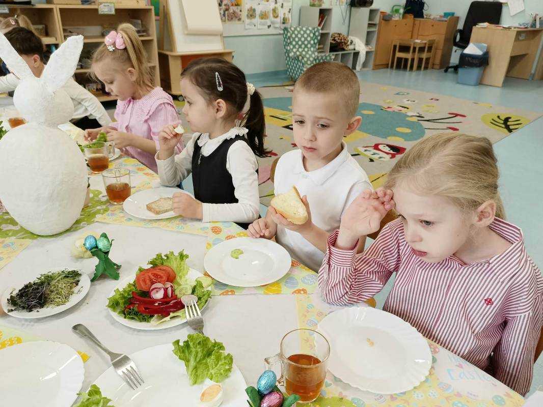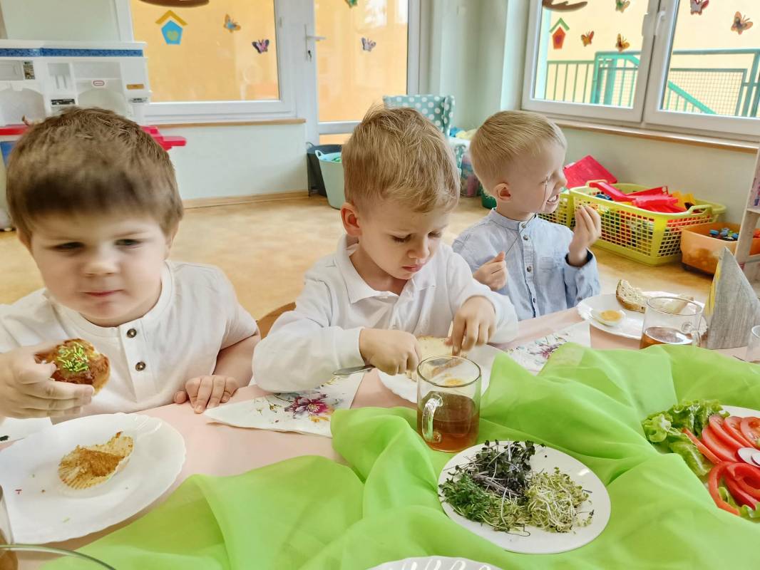 W naszym przedszkolu odbyło się uroczyste śniadanie wielkanocne, które wprowadziło wszystkich w radosny, świąteczny nastrój. Dzieci wspólnie z wychowawcami zasiadły do pięknie udekorowanych stołów w swoich salach, gdzie czekały na nie tradycyjne wielkanocne potrawy.