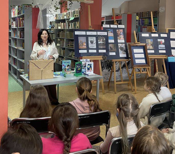 Szczególnym wydarzeniem było spotkanie autorskie z Elżbietą Stępień. Uczniowie mieli okazję poznać pisarkę, posłuchać fragmentów jej twórczości oraz dowiedzieć się, jak powstają wiersze i książki. Autorka opowiadała o swojej pracy, inspiracjach oraz o tym, jak ważna jest wyobraźnia i wrażliwość w tworzeniu tekstów literackich. Uczniowie bardzo aktywnie uczestniczyli w spotkaniu – zadawali pytania, dzielili się swoimi refleksjami i z dużym zainteresowaniem słuchali opowieści o pracy pisarza.