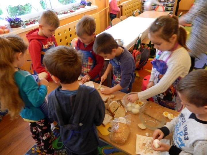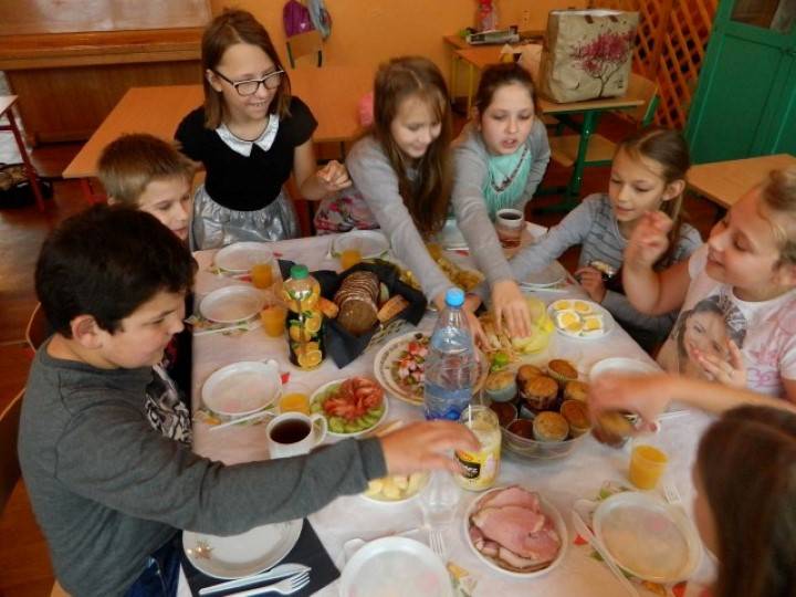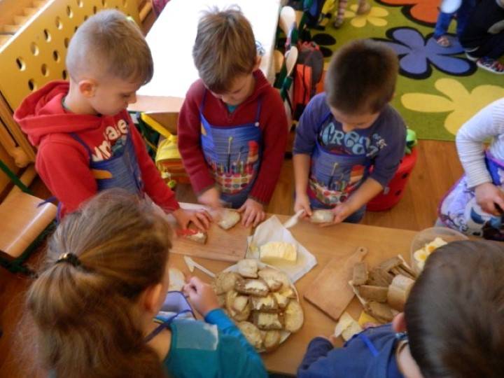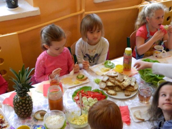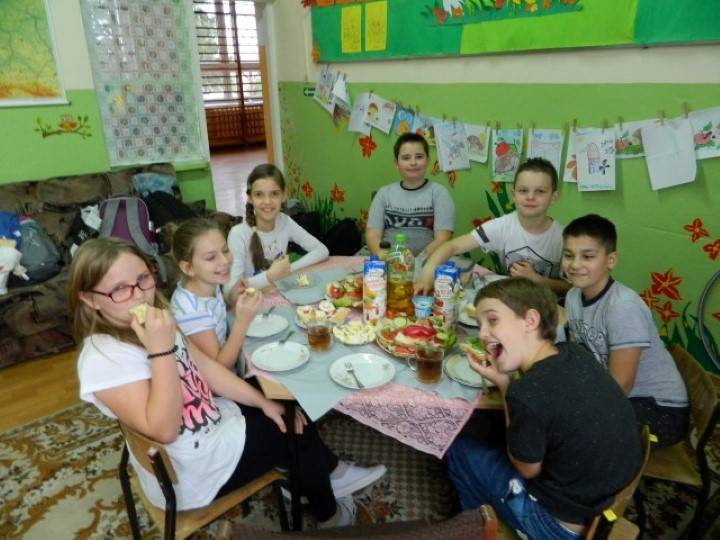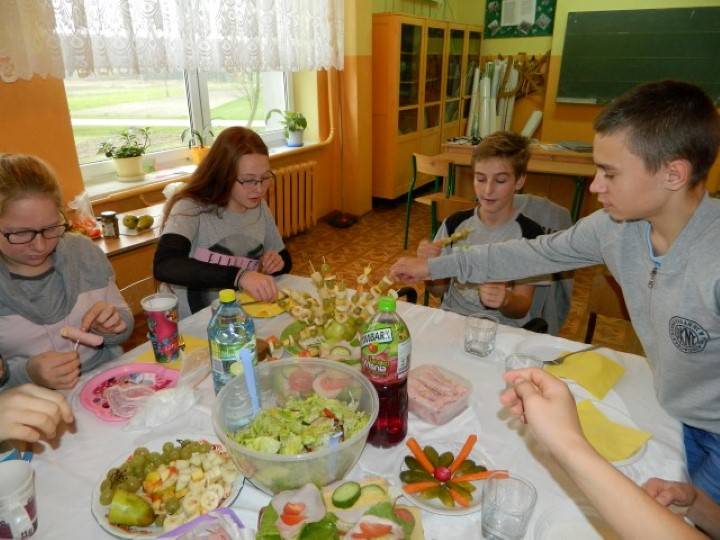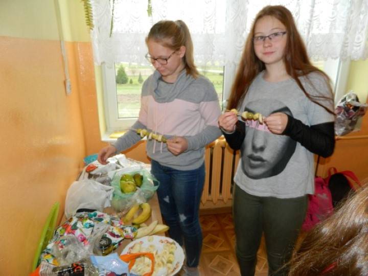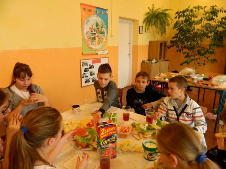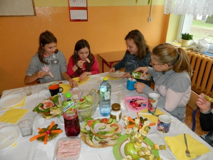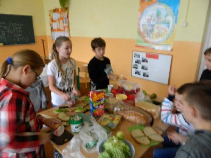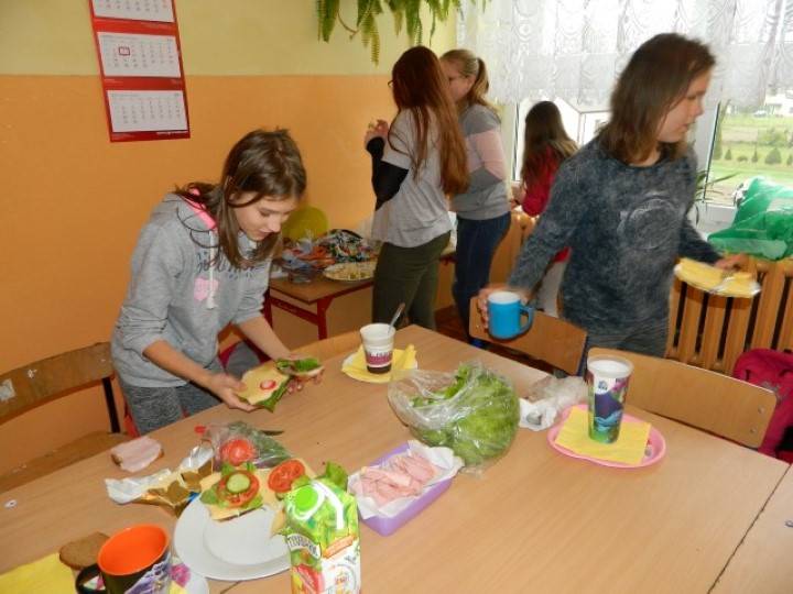 Uczniowie, pod kierunkiem nauczycieli przygotowywali pyszne i zdrowe śniadania. Wcześniej jednak odbyła się krótka pogadanka nt. prawidłowego żywienia i przygotowywania posiłków. Dzieci wymieniały również zalety, jakie płyną ze zdrowego odżywiania.
