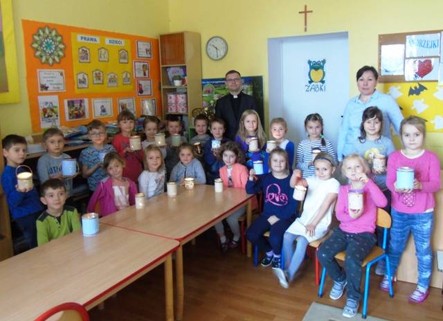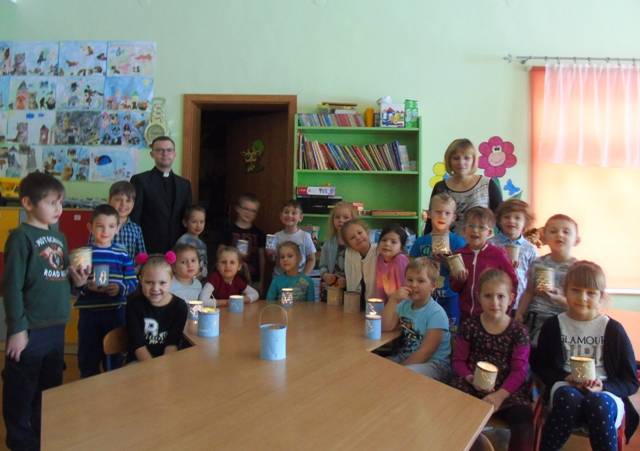 Z inicjatywy katechety ks. Emila Kałuży dzieci podjęły tematykę światła adwentowego, symbolizującego dobre uczynki, jak i gotowość na przyjście samego Boga do ich serduszek. Grupa „Pszczółek”, pod opieką p. Iwony Kubiak oraz grupa „Żabek” której opiekunem jest p. Edyta Parchatko przygotowały adwentowe lampiony. Dzieci z wielkim zapałem i radością przystąpiły do prac, czego efekty widać na załączonych zdjęciach. Lampiony można zobaczyć na wystawie w Przedszkolu. Otwartość Dyrekcji Przedszkola na innowacje, została radośnie przyjęta przez najmłodszych wychowanków.