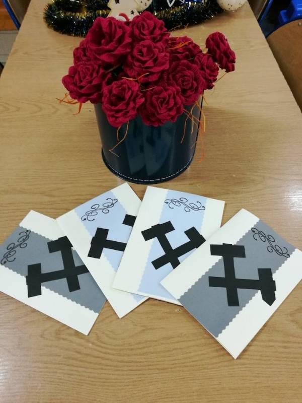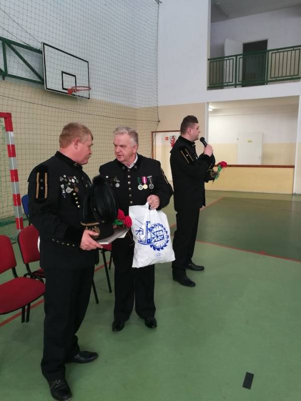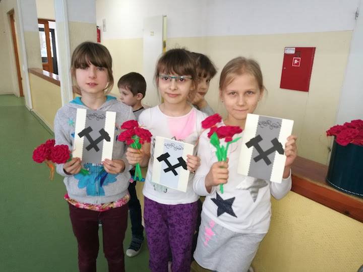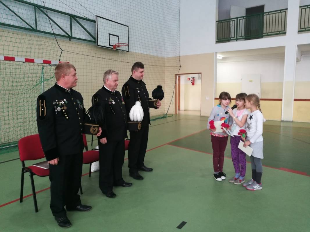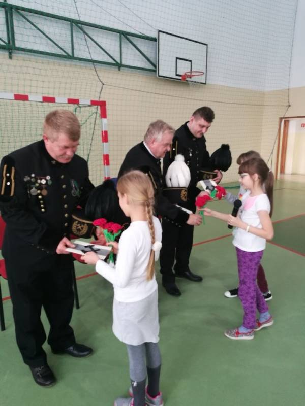 Na zakończenie w podziękowaniu za przybycie i ciekawe opowieści uczniowie wręczyli górnikom laurki z życzeniami oraz kwiaty.