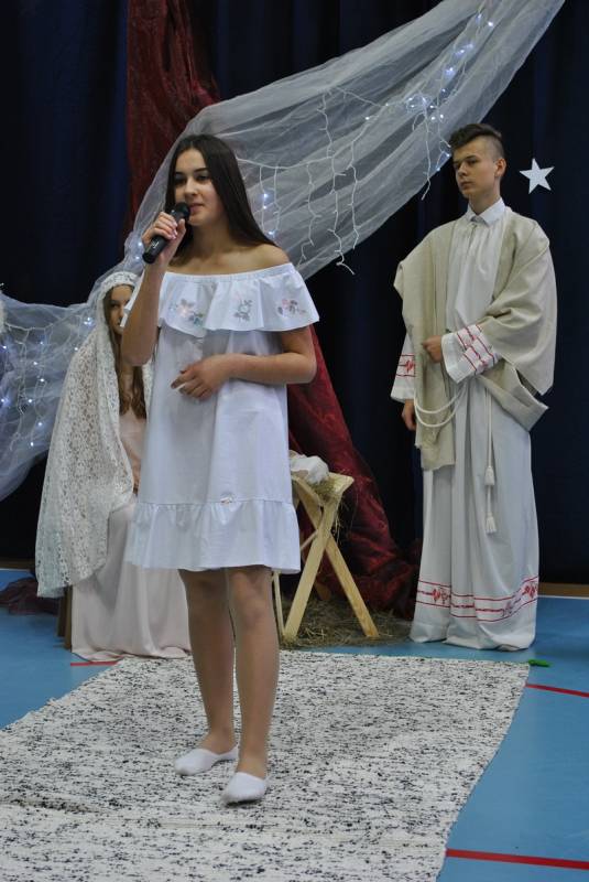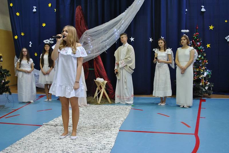 W części drugiej spektaklu wykonane były kolędy polskie i zagraniczne. Wielką wartością spektaklu było zaangażowanie grupy 20 uczniów grających na fletach, uczennicy grającej na keyboardzie oraz ucznia grającego na saksofonie. "A kiedy Wigilii przyjdzie czas" zaśpiewał ks. Emil z Bożeną Krauze i Moniką Kiełek. Przepięknie solo zaśpiewały: Aleksandra Pielużek, Magdalena Cieślik, Maja Chruścik.