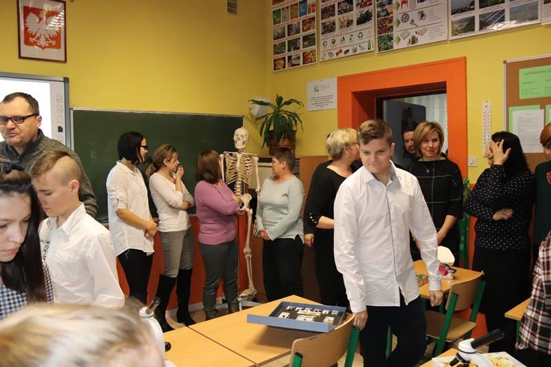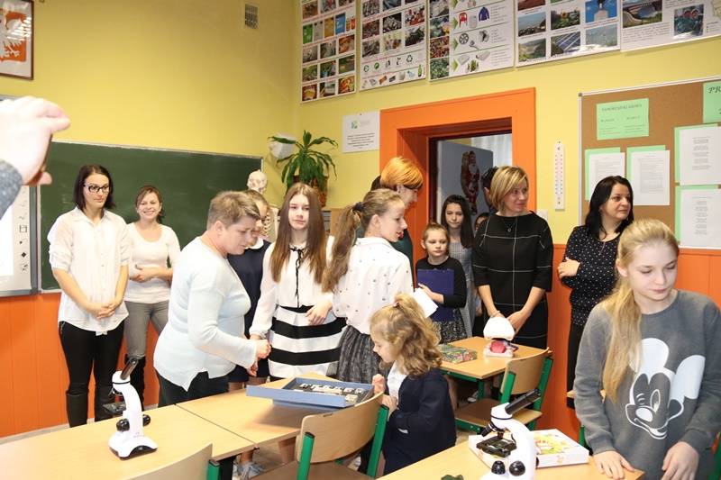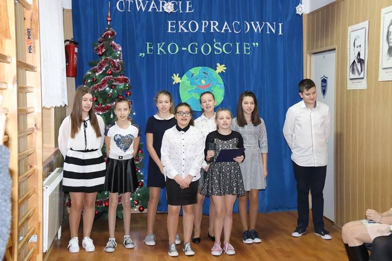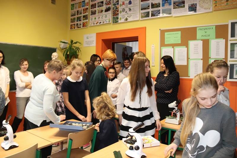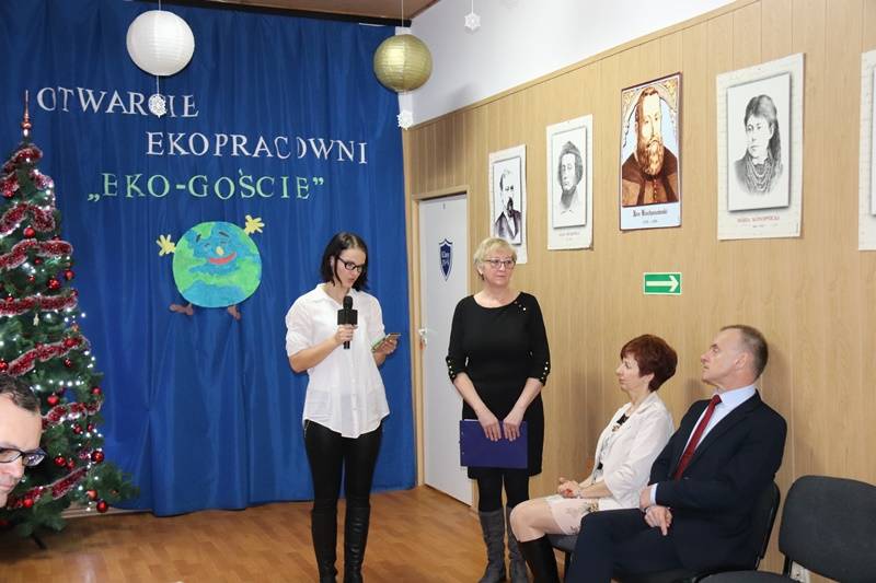 „Pracownia EKO-GOŚCIE zaprasza do… zdobywania wiedzy przyrodniczej i nie tylko” – tym hasłem rozpoczęła swoje przemówienie Pani Dyrektor- Emilia Sobczyk. Jest ono potwierdzeniem zasadności zrealizowanej inwestycji, czyli ekopracowni, której nadrzędnym celem jest rozwijanie w uczniach poczucia odpowiedzialności za środowisko, którego człowiek stanowi ważne ogniwo. We współczesnym świecie ochrona środowiska powinna być priorytetem dla każdego człowieka. Aby ziściły się marzenia o czystym powietrzu, pięknych krajobrazach oraz zachowaniu dóbr matki natury dla przyszłych pokoleń, należy dbać o edukację ekologiczną dzieci i młodzieży. W nabywaniu wiedzy i umiejętności z zakresu tej edukacji pomoże uczniom szkoły właśnie nowoczesna pracownia wyposażona w multimedialny sprzęt nowej generacji oraz specjalistyczne pomoce dydaktyczne. Do dyspozycji uczniów i nauczycieli są: tablica multimedialna, projektor, laptop, aparat fotograficzny, wizualizer, mikroskopy, w tym mikroskop stereoskopowy i diagnostyczny, modele edukacyjne, szkielety, plansze, mapy, globusy, przyrządy do badań i doświadczeń. Co ciekawe, wiele zakupionych pomocy służyć będzie do obserwacji i badań w terenie ( powietrze, gleba, pogoda, ), co zapowiada mnóstwo interesujących wypraw. W pracowni odbywać się będą nie tylko lekcje przyrody, biologii, chemii i fizyki, ale także lekcje języka polskiego, matematyki i historii a także zajęcia pozalekcyjne poszerzające zagadnienia związane z ochroną środowiska, warsztaty i konkursy. W ramach edukacji ekologicznej przewidziano też spotkania z leśnikiem, pszczelarzem, wędkarzem, udział w ogólnopolskich akcjach na rzecz ochrony środowiska i organizację uroczystości i konkursów o tematyce przyrodniczej.