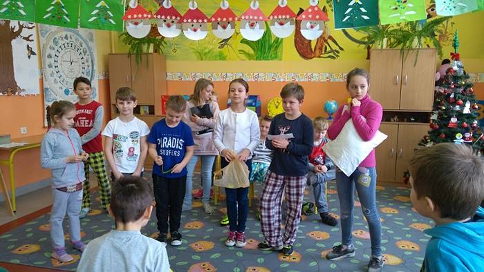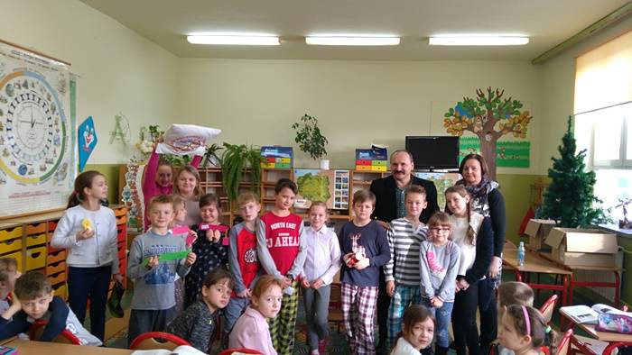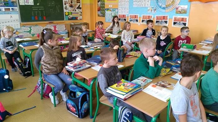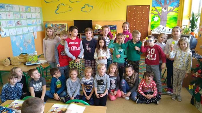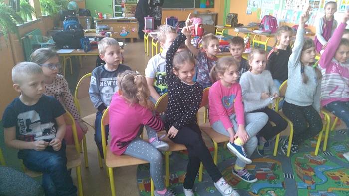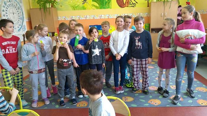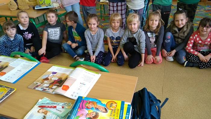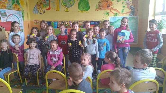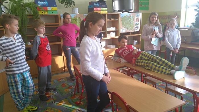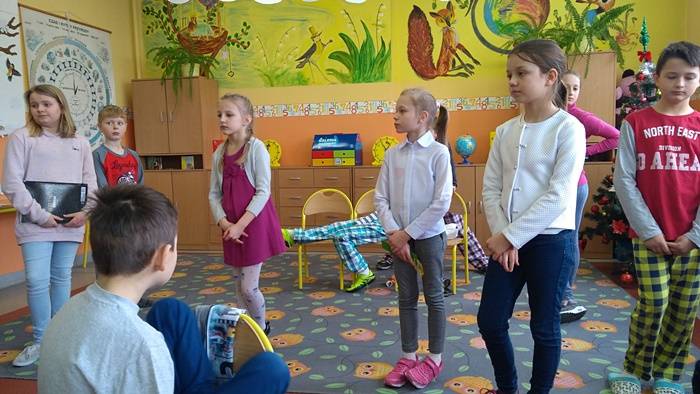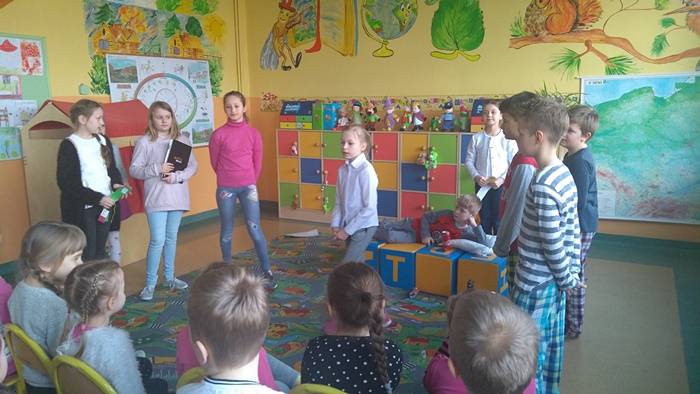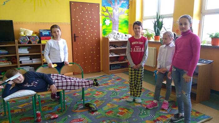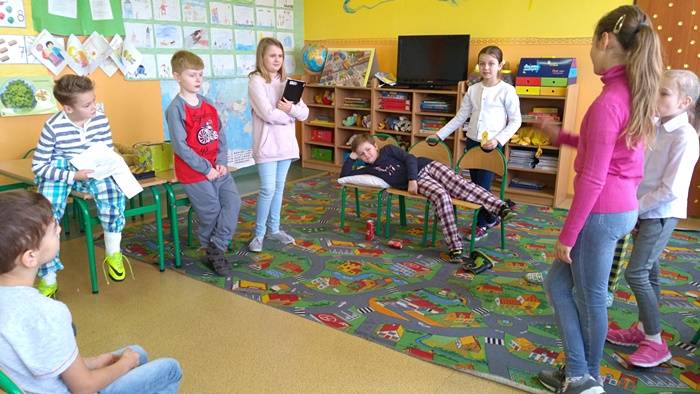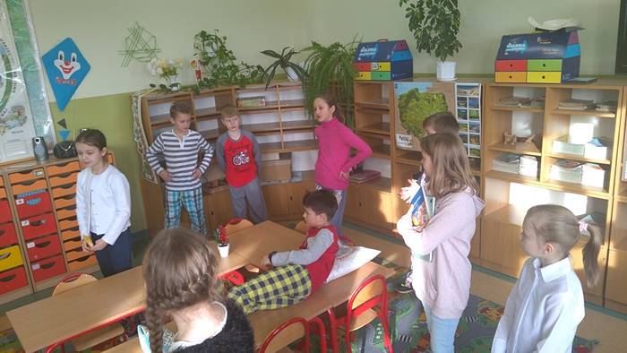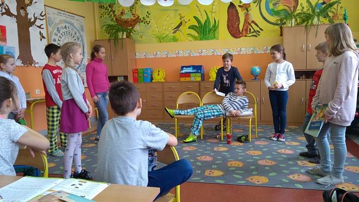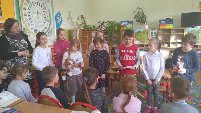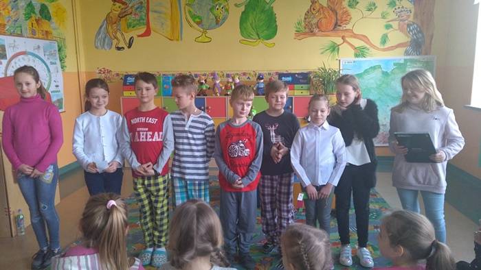 Tym razem aktorzy z klasy IV a wystąpili w składzie: Ania Czabańska, Blanka Fiktus, Łucja Głowacka, Maja Librowska, Matylda Świstak, Cyprian Kulikowski, Mikołaj Olejnik, Marika Klekocińska, Filip Włóka oraz Rafał Kamiński. Przedstawili oni swoim młodszym koleżankom i kolegom z klas pierwszych inscenizację wiersza „Leń”. Świetnie wcielili się w odgrywane role, mieli przebrania i rekwizyty. Po przedstawieniu tradycyjnie odbył się konkurs na pytania związane z treścią wiersze. W nagrodę za poprawne odpowiedzi uczniowie otrzymali znaczki odblaskowe i piękne zakładki do książek. Całemu spotkaniu towarzyszyła bardzo miła atmosfera.