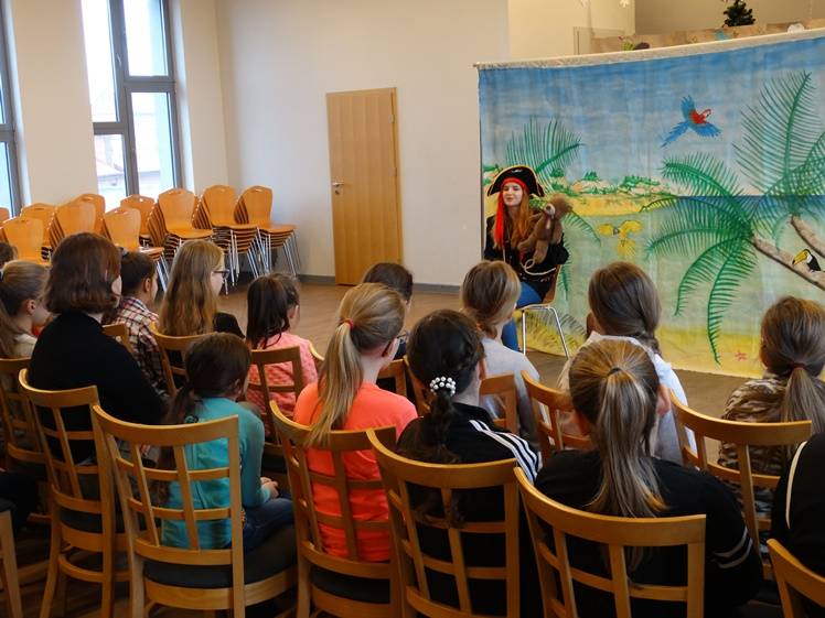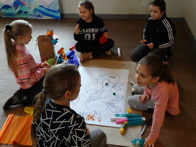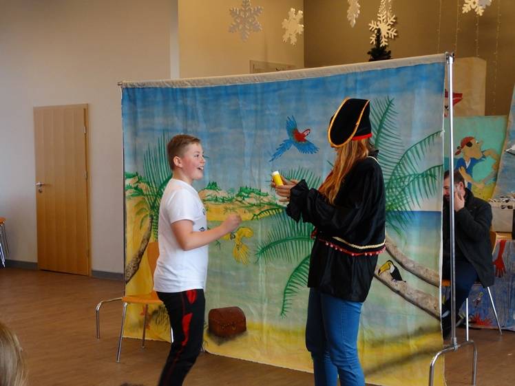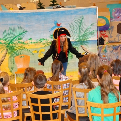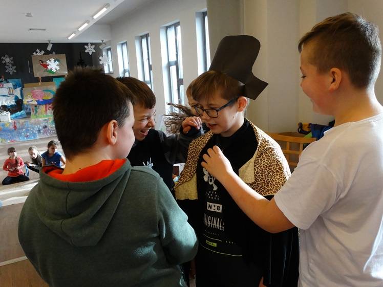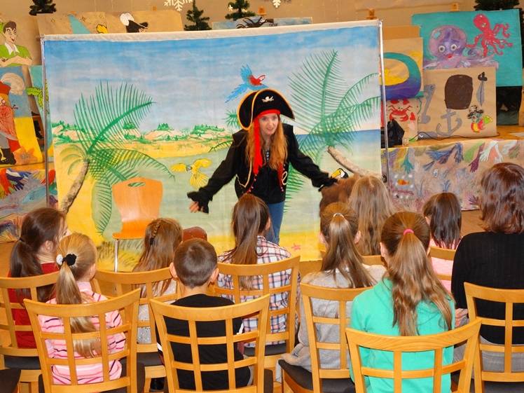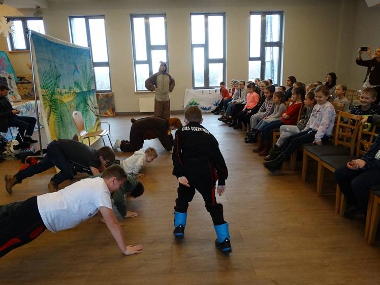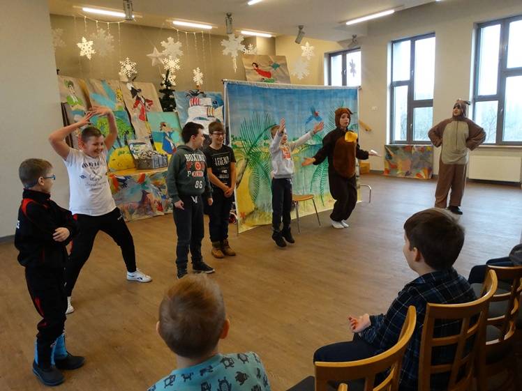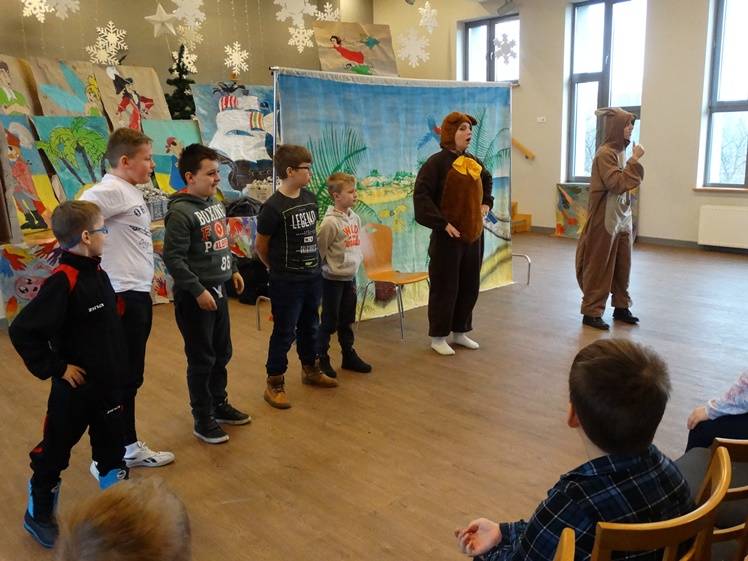 W ostatnim dniu warsztatów, które podczas ferii odbywały się w Domu Kultury dzieci obejrzały spektakl teatralny pt. "Na końcu świata...Przygody Misia i Kacpra pirata" w wykonaniu aktorów Teatru "Maska" w Krakowie. Jego celem było pokazanie młodym widzom jak wielką moc ma prawdziwa przyjaźń, która bardzo pozytywnie wpływa na nasze życie. Zajęcia zakończyły sie wspólną zabawą.