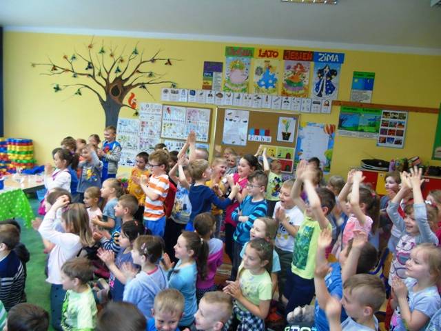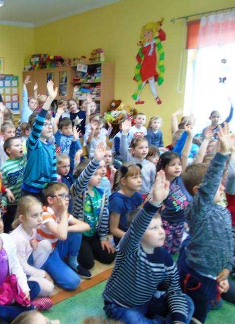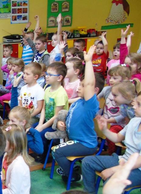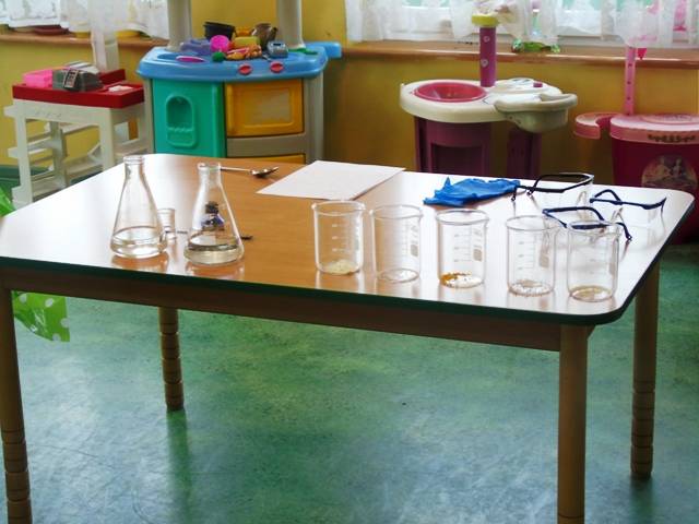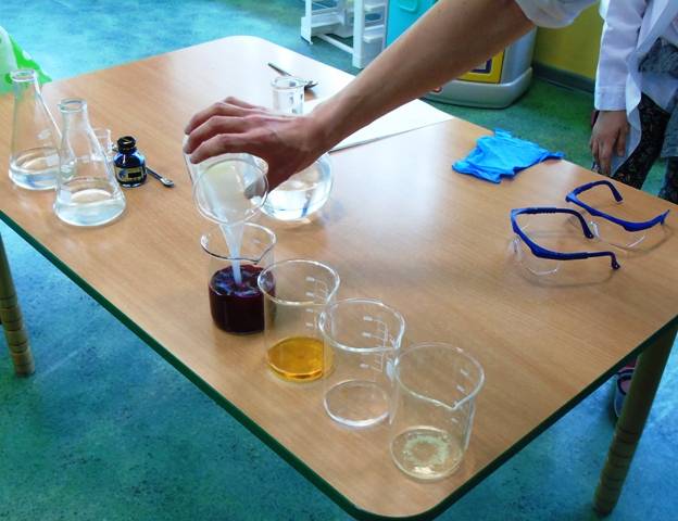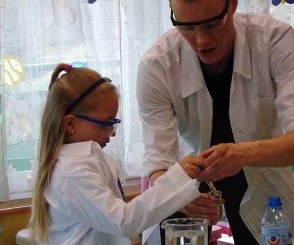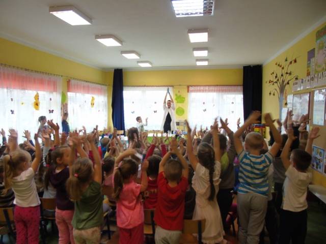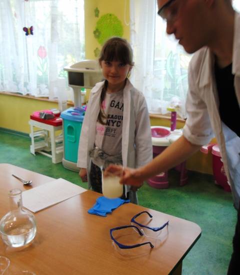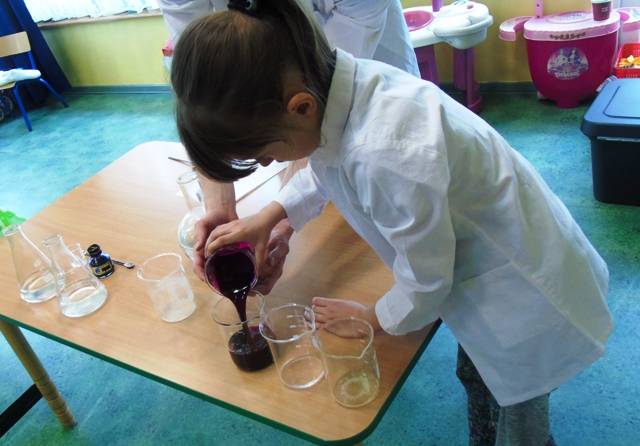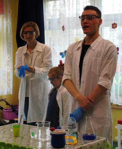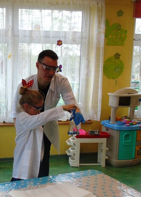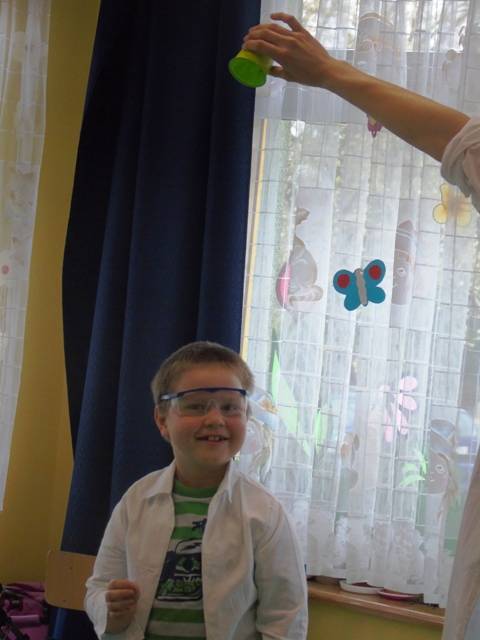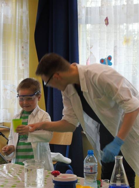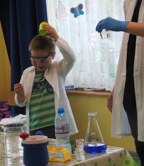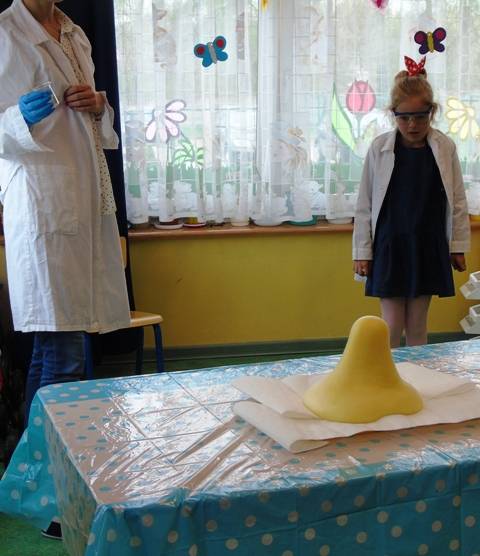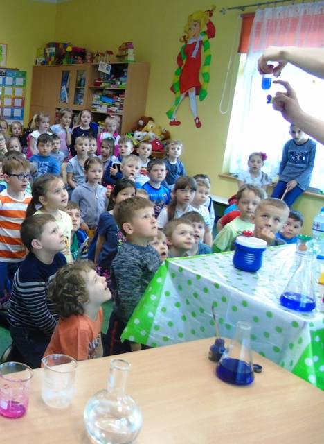 Głównym celem spotkania było rozbudzenie wyobraźni i ciekawości dziecięcej oraz zapoznanie z nowymi zjawiskami i pojęciami tj. mieszanie kolorów, wulkan z piany, zastyganie wody w ciało stałe.