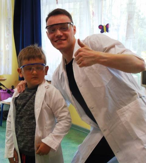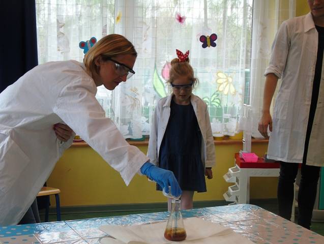 W czasie trwania pokazu przedszkolaki nie zapomniały o przestrzeganiu wprowadzonych zasad bezpieczeństwa, o których trzeba pamiętać we wszystkich laboratoriach.
