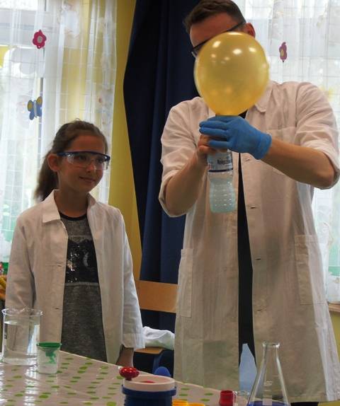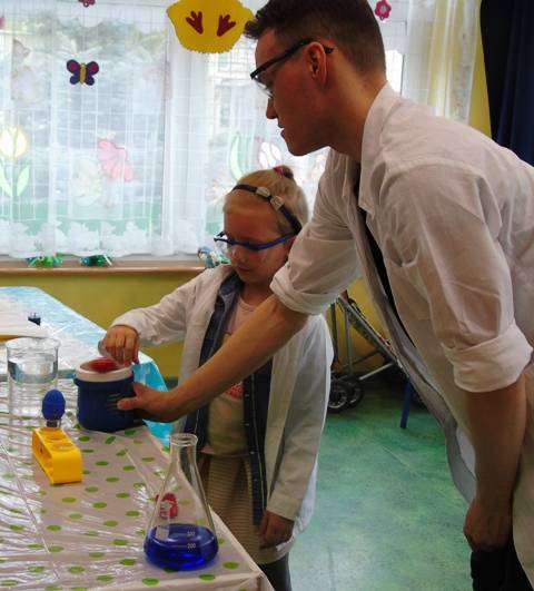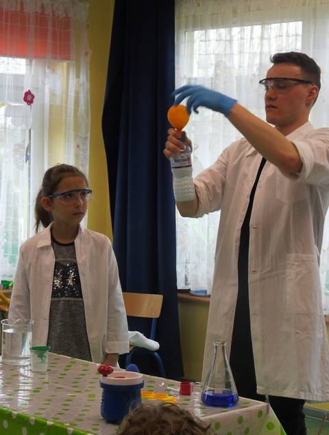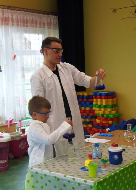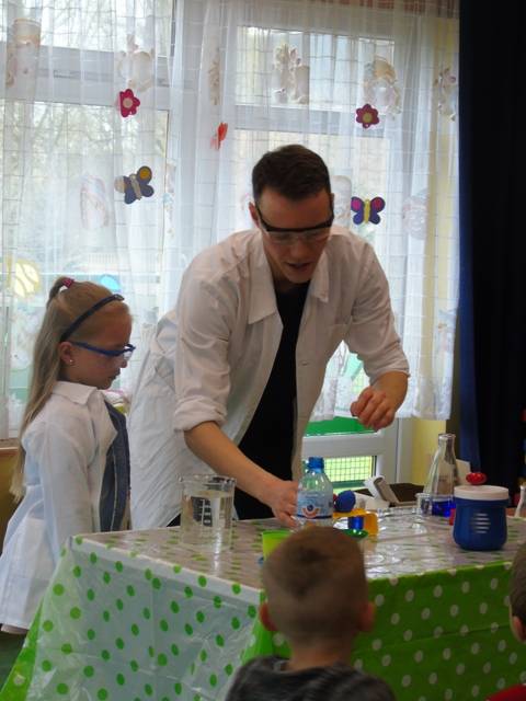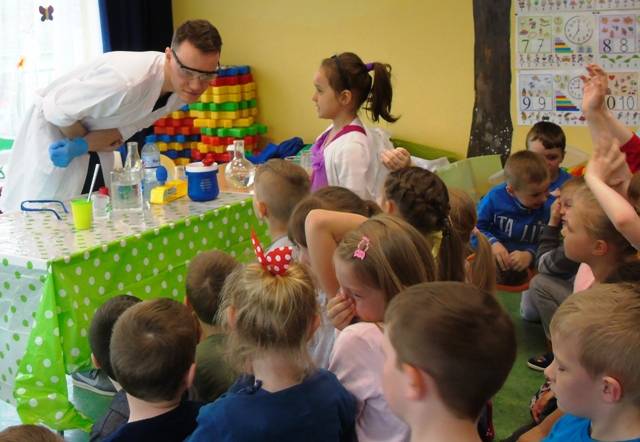 Pan chemik zaprezentował dzieciom szereg ciekawych i bardzo efektownych doświadczeń chemicznych.
