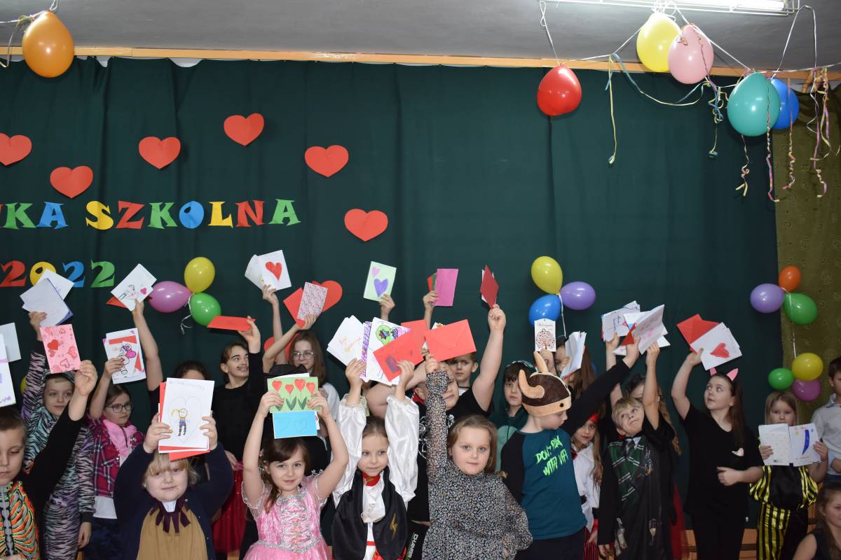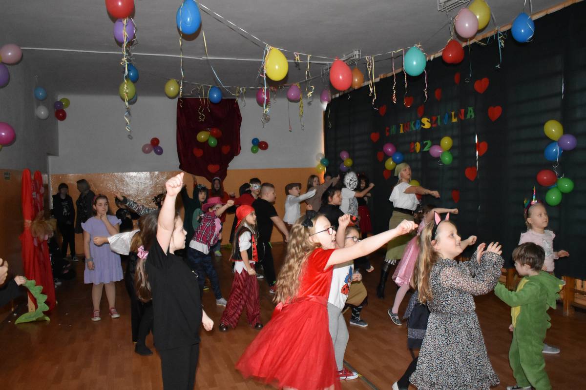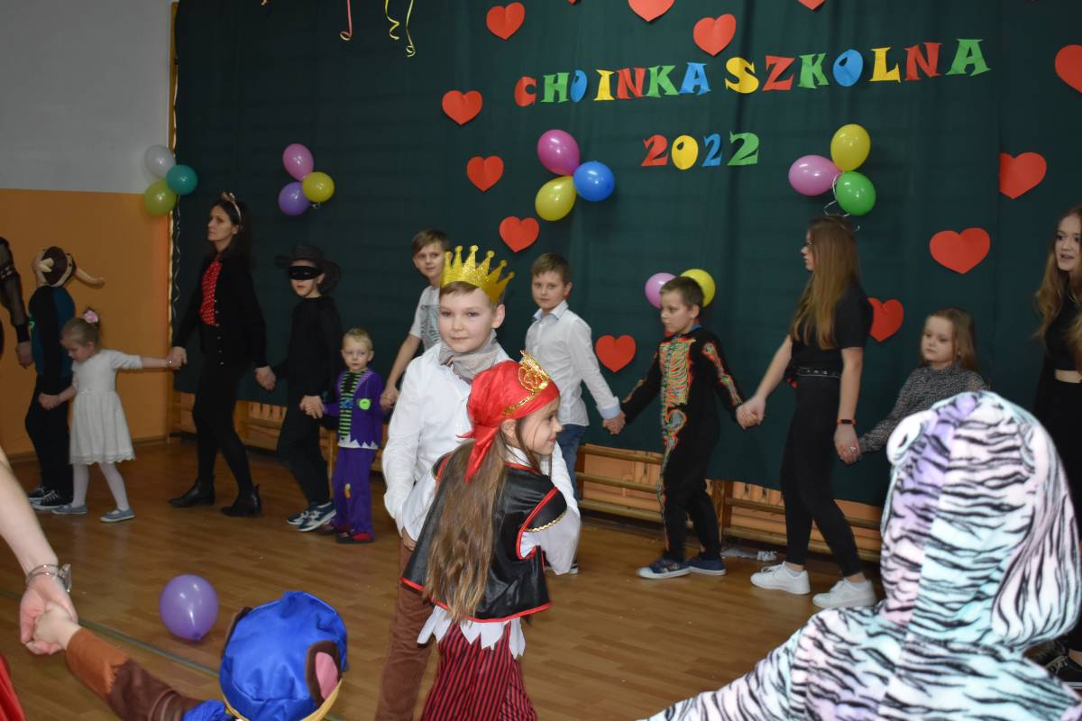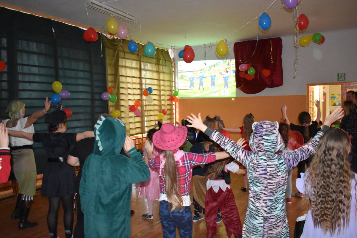 z papieru. Z głośników dobiegała taneczna muzyka, a wszyscy chętni mogli również spróbować swoich sił w odtwarzaniu wyświetlanych układów choreograficznych. Na uczestników balu czekała moc atrakcji: walentynkowo-karnawałowa fotobudka, słodka kawiarenka, rozmaite zabawy i konkursy. Wiele pozytywnych przeżyć wzbudziło rozdanie kartek walentynkowych, które przez ostatni tydzień uczniowie mogli wrzucać do specjalnie przygotowanej skrzynki. Jak co roku, punktem kulminacyjnym zabawy był wybór Królowej i Króla Balu, co wcale nie było łatwym zadaniem, gdyż dzieci nie tylko były pięknie i pomysłowo przebrane, ale przede wszystkim dopisywały im humory i świetnie się bawiły przez całą imprezę, co było jednym z kryteriów do zdobycia zaszczytnego tytułu. Ostatecznie, w tajnym głosowaniu uczestników balu, Królową została Lena Świstak z kl. I, a Królem Aleksander Janczura z kl. IV. Ciekawym akcentem uroczystości był występ grupy teatralnej, która odwiedziła naszą szkołę i wystawiła przedstawienie pt. „Elza w krainie lodu”. Czarodziejska podróż do mroźnego pałacu na szczycie góry wzbudziła olbrzymie zainteresowanie wszystkich dzieci. Uśmiechnięte twarze uczniów świadczyły o wielu pozytywnych emocjach, jakie wywołał udział w zabawie. Bal karnawałowy po raz kolejny okazał się najlepszym sposobem na powitanie rozpoczynających się ferii zimowych.