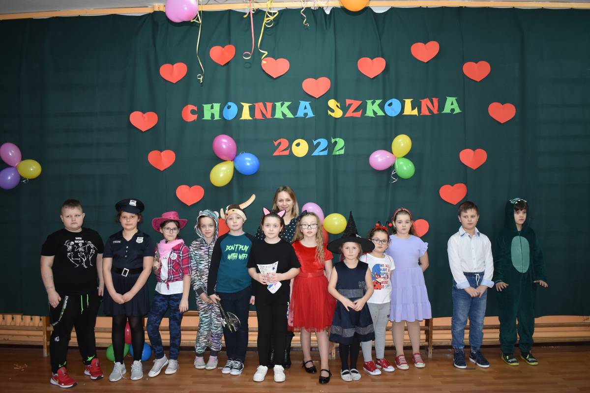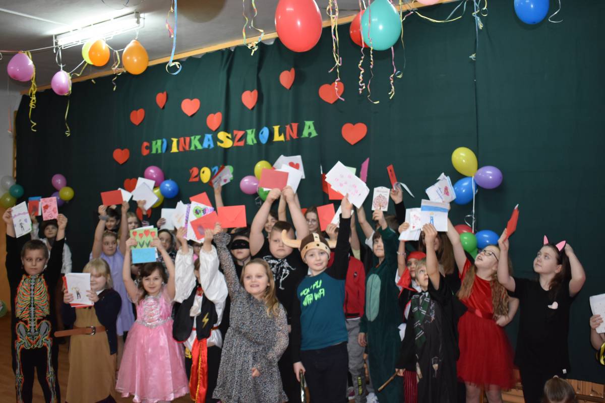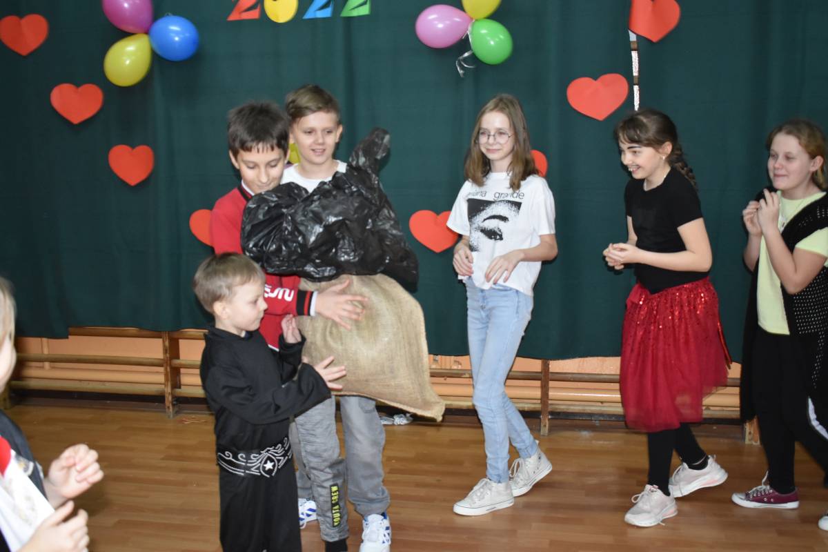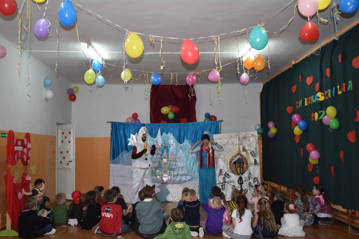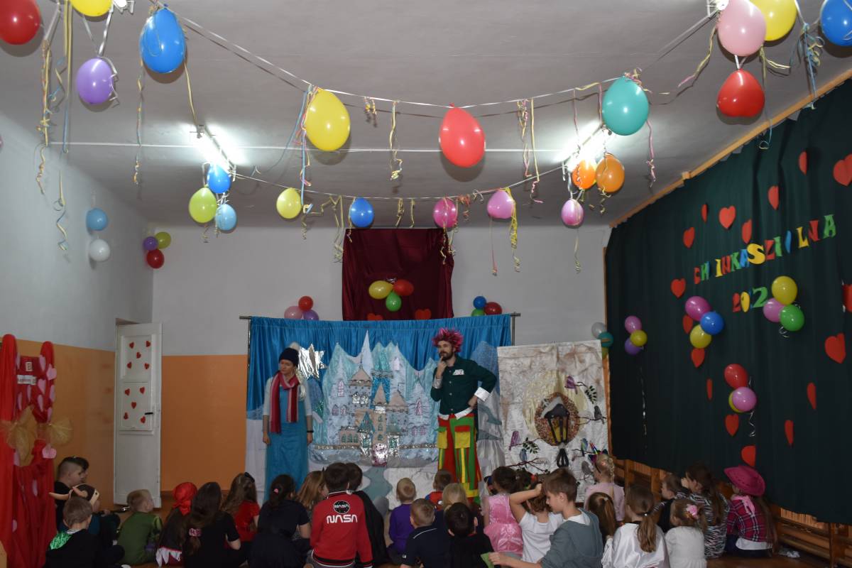 z papieru. Z głośników dobiegała taneczna muzyka, a wszyscy chętni mogli również spróbować swoich sił w odtwarzaniu wyświetlanych układów choreograficznych. Na uczestników balu czekała moc atrakcji: walentynkowo-karnawałowa fotobudka, słodka kawiarenka, rozmaite zabawy i konkursy. Wiele pozytywnych przeżyć wzbudziło rozdanie kartek walentynkowych, które przez ostatni tydzień uczniowie mogli wrzucać do specjalnie przygotowanej skrzynki. Jak co roku, punktem kulminacyjnym zabawy był wybór Królowej i Króla Balu, co wcale nie było łatwym zadaniem, gdyż dzieci nie tylko były pięknie i pomysłowo przebrane, ale przede wszystkim dopisywały im humory i świetnie się bawiły przez całą imprezę, co było jednym z kryteriów do zdobycia zaszczytnego tytułu. Ostatecznie, w tajnym głosowaniu uczestników balu, Królową została Lena Świstak z kl. I, a Królem Aleksander Janczura z kl. IV. Ciekawym akcentem uroczystości był występ grupy teatralnej, która odwiedziła naszą szkołę i wystawiła przedstawienie pt. „Elza w krainie lodu”. Czarodziejska podróż do mroźnego pałacu na szczycie góry wzbudziła olbrzymie zainteresowanie wszystkich dzieci. Uśmiechnięte twarze uczniów świadczyły o wielu pozytywnych emocjach, jakie wywołał udział w zabawie. Bal karnawałowy po raz kolejny okazał się najlepszym sposobem na powitanie rozpoczynających się ferii zimowych.
