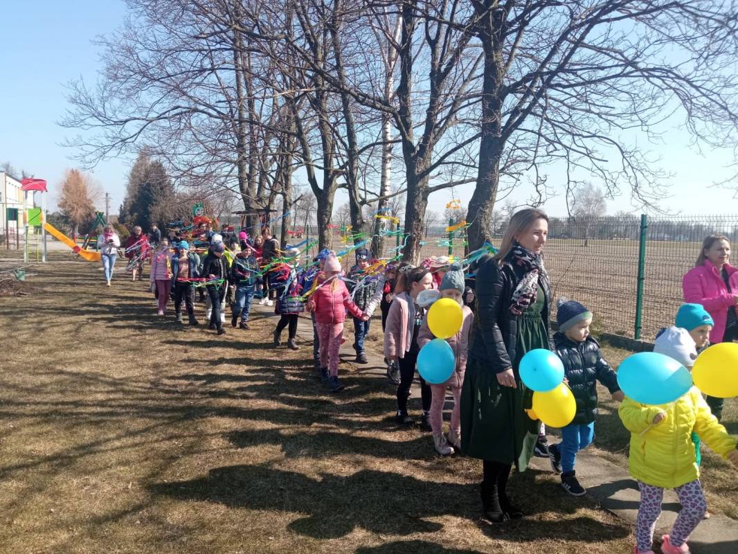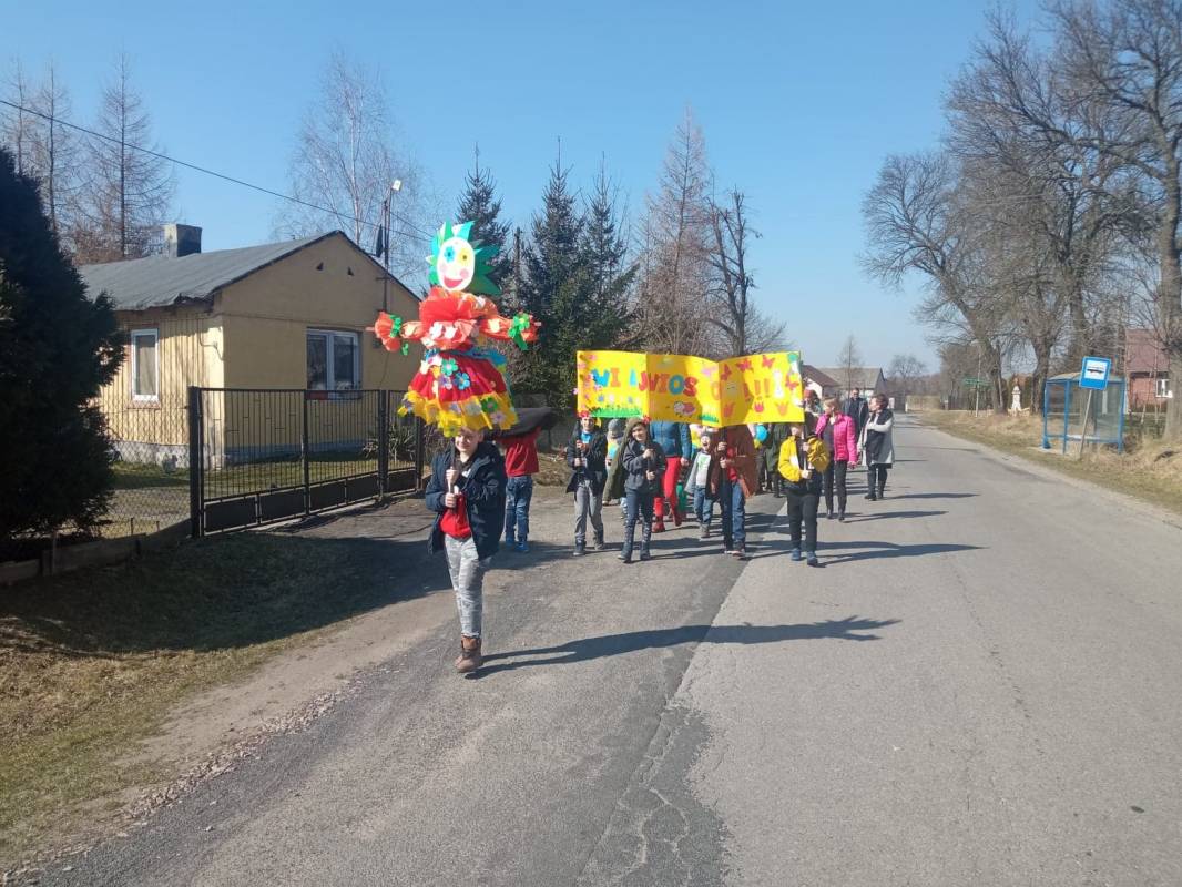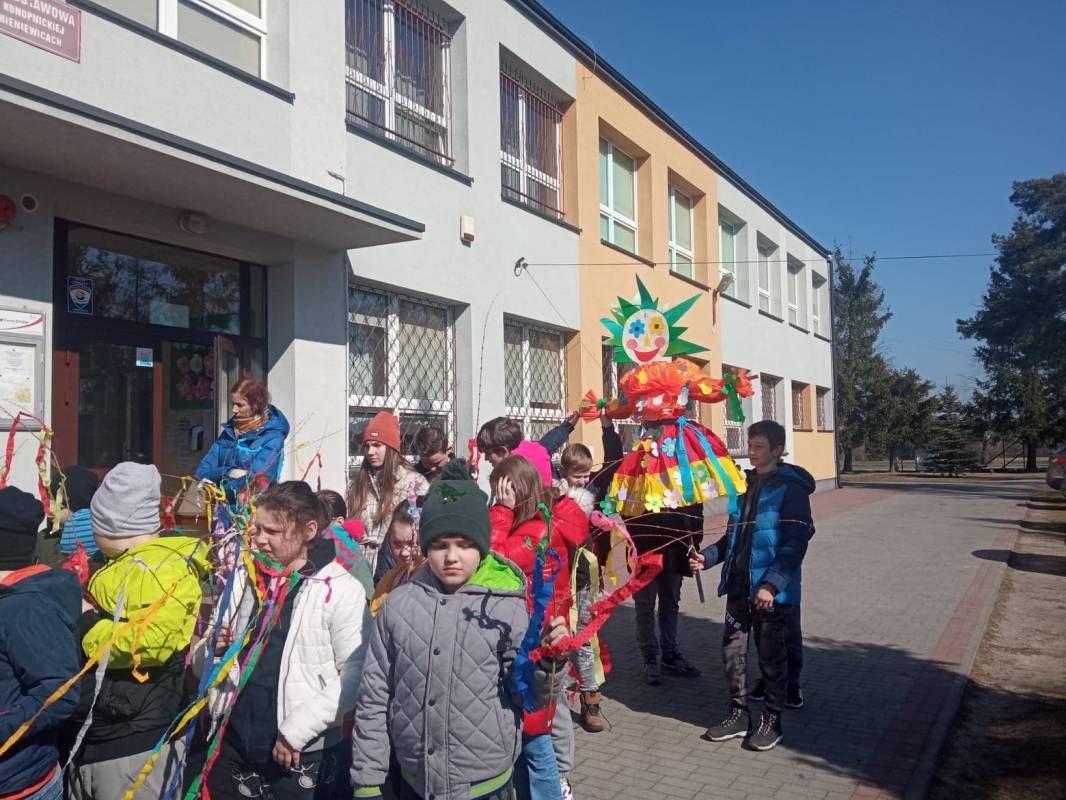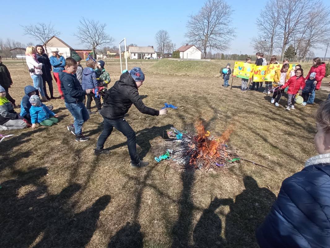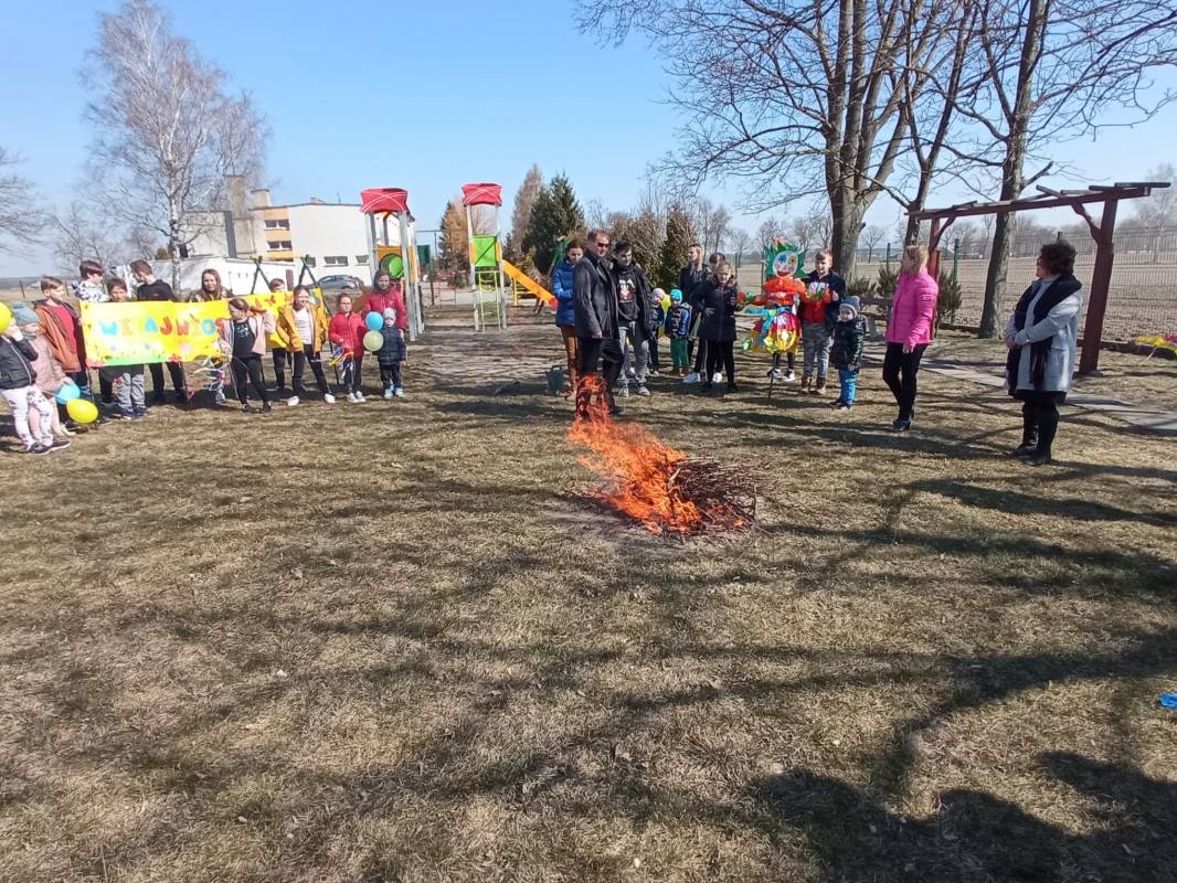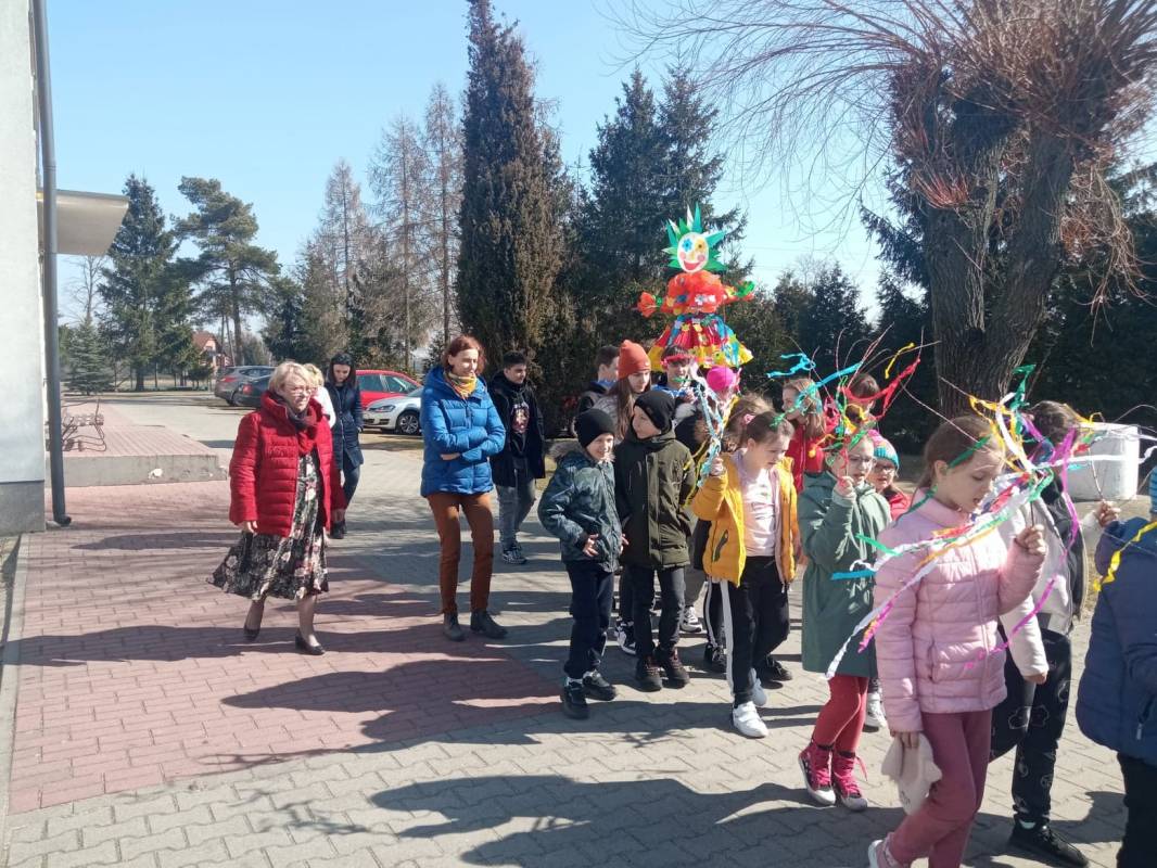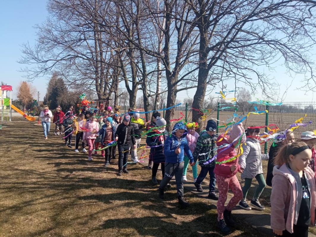 Takie same nastroje towarzyszyły od pewnego czasu również uczniom Szkoły Podstawowej w Krzemieniewicach. I w końcu doczekali się! Z wiankami na głowach, w kolorowych strojach, trzymając w rękach wiosenne gaiki udali się na krótki spacer, by powitać wiosnę. Barwnemu korowodowi przewodniczyli uczniowie niosący powitalny transparent. Nie zabrakło oczywiście ekologicznej marzanny, która na zakończenie pochodu spłonęła w ognisku, na dobre żegnając mroźną i długą zimę. Wszystkie dzieci i nauczyciele z uśmiechami na twarzach i w promieniach słońca powitali wiosnę.